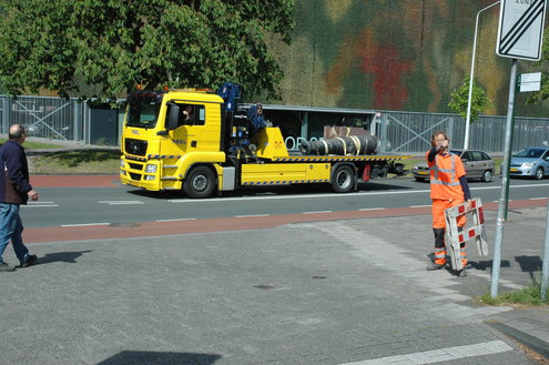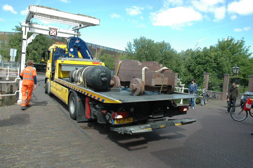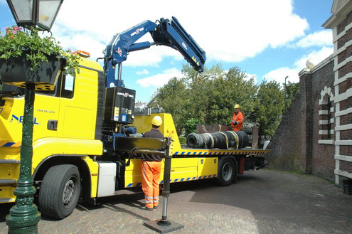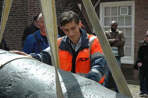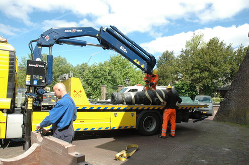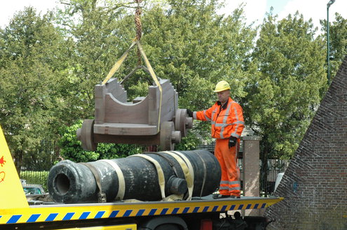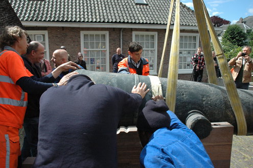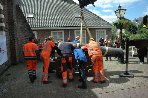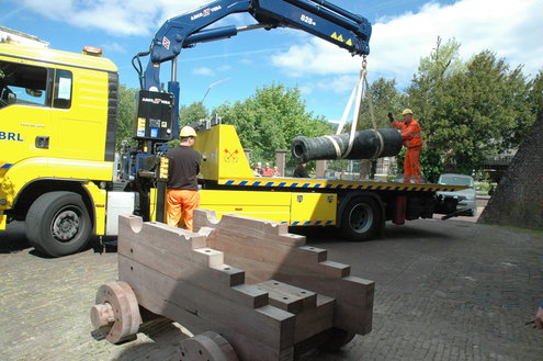 Wethouder Laudy hielp de heren van Stedelijk beheer een handje om het kanon precies recht op het affuit te krijgen. (Foto's/video: Chris de Waard).