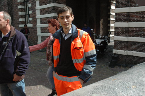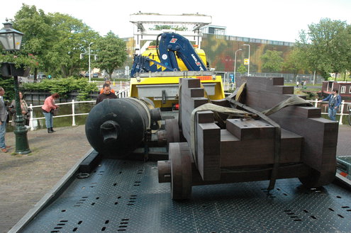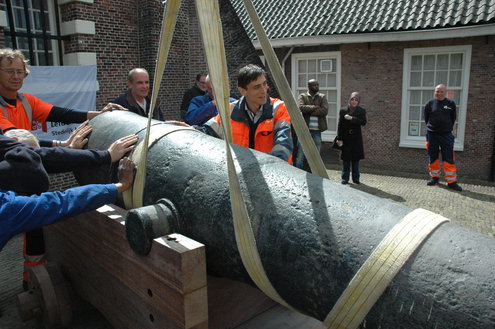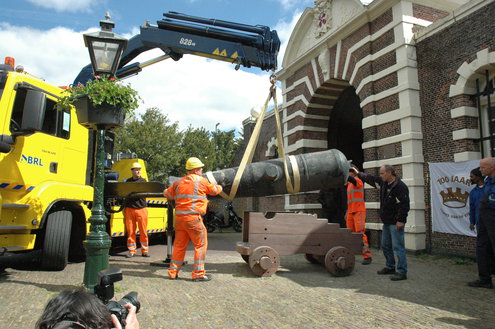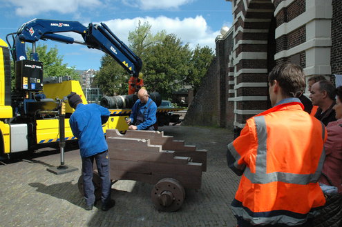 Vanmorgen hebben medewerkers van de afdeling Stedelijk Beheer van de gemeente Leiden met hulp van wethouder Laudy het kanon met onderstel (affuit) teruggeplaatst bij de Morspoort. Het affuit van het kanon was in zo’n slechte staat dat het in september is weggehaald. Stedelijk Beheer heeft in eigen beheer een nieuw onderstel vervaardigd van azobe hout. Door het toepassen van deze zeer harde houtsoort, kan het nieuwe affuit het kanon weer tientallen jaren dragen.