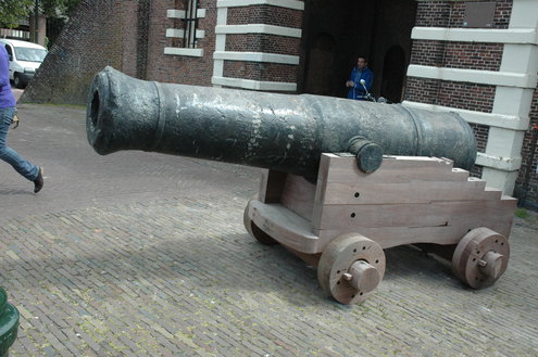 Het uit 1820 daterende scheepskanon komt van oorsprong niet uit Leiden. Het is in de jaren 80 bij baggerwerkzaamheden gevonden in Oostvoorne. Leiden kocht er zes en die staat verspreid door de stad, onder meer bij de Zijlpoort en op de plek van de voormalige Doelenkazerne. Elk kanon met onderstel weegt 7000 kilo.