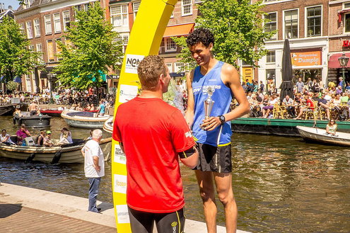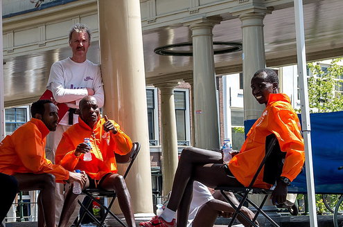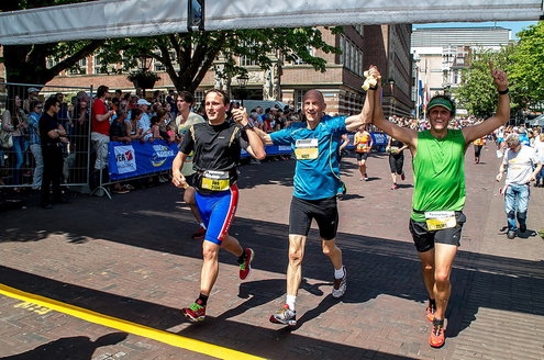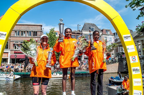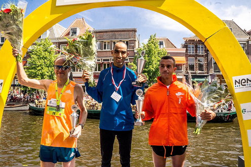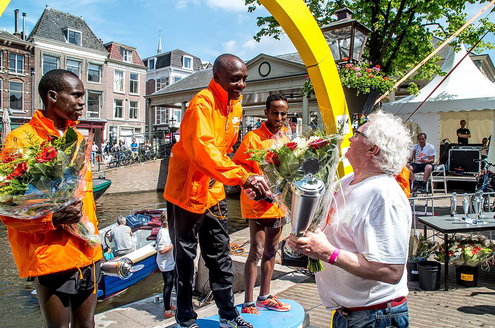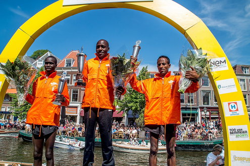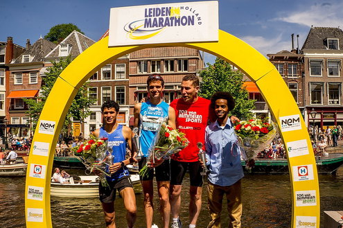 De drie snelste heren op de hele marathon op het podium bij het Stadhuisplein.