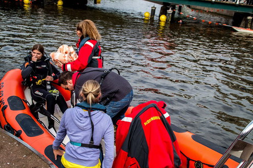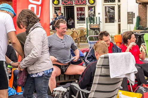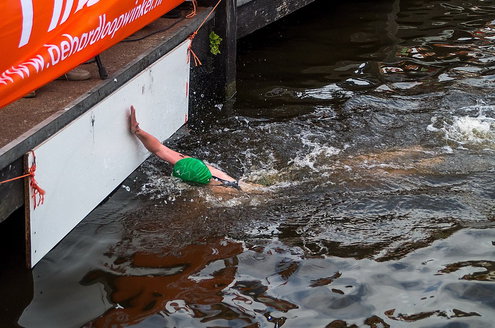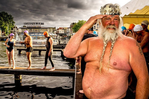 Behalve de getrainde kilometervreters doken ook recreanten de gracht in: 80 maar liefst. Onder hen ook Peter Labruyjère die zijn entree maakte op de Beestenmarkt als de Neptunus van de Sleutelstad. Voor zijn 1.500 meter prestatietocht moest hij weliswaar zijn drietand en zeewiergewaad inleveren, maar hij mocht zijn kroon ophouden.