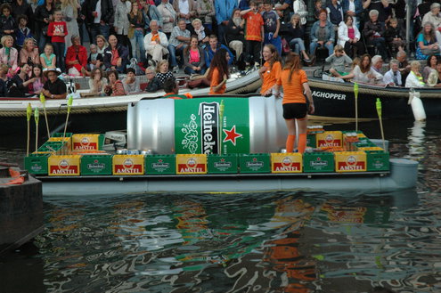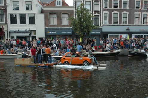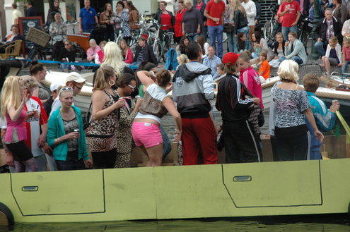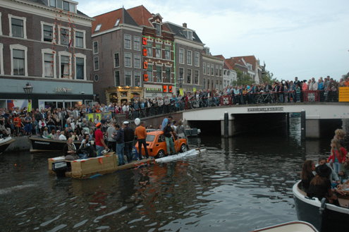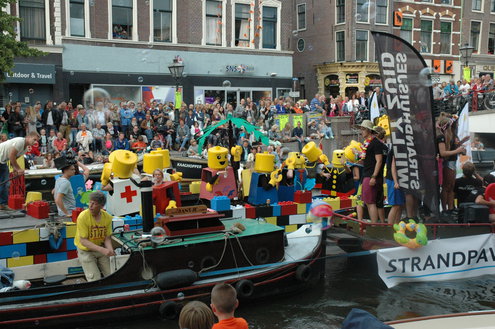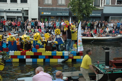 Een van de eersteprijswinnaars tijdens de Peurbakkentocht afgelopen vrijdag. De Lego-boot van het Leidsche Tuynhuis. (Foto's/video: Chris de Waard).