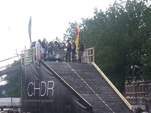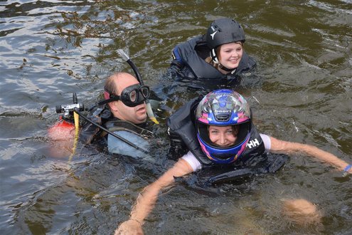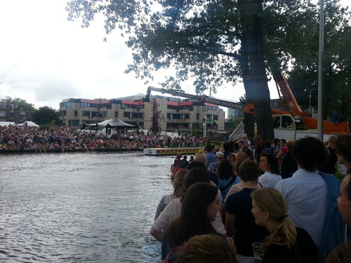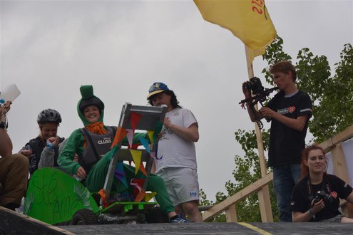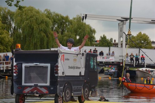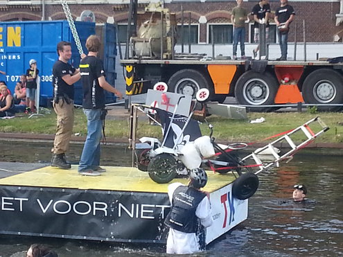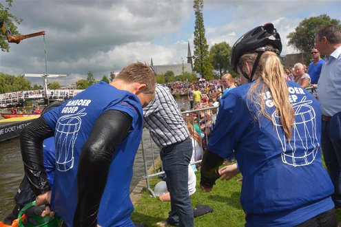 ‘Snel naar de Bel’ betekent in een zo origineel mogelijk versierde kar of wagen zo snel mogelijk de vijf meter hoge schans af naar de bel die aan het einde van het plankier boven het water hing. Bellen en droog blijven was er dus niet bij, maar dat is juist een deel van de pret, zo vertelde ook Barry Bakpak die het geheel presenteerde.