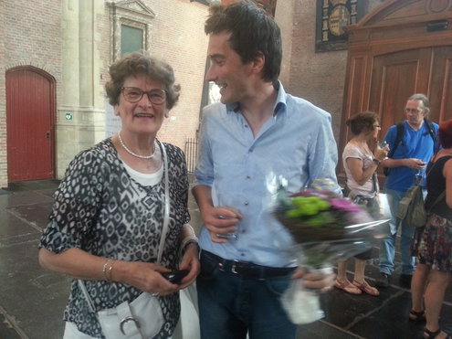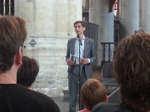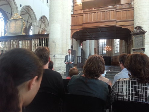 Wethouder Laudy (links )opende gisteen in de Pieterskerk de expositie Stadswachters van Rob Overmeer (rechts) die afgelopen jaar Stadsfotograaf van Leiden was. (Foto's: Chris de Waard).