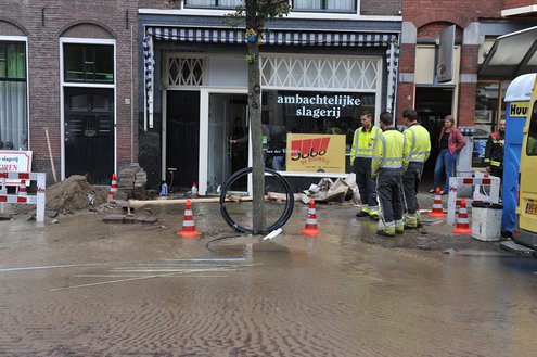 Bij werkzaamheden in de Doezastraat werd de waterleiding geraakt. Gevolg: een ondergelopen winkelstraat. (Foto's: Toon van der Poel).