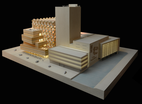 Impressie van de nieuwbouw van Naturalis die wordt ontworpen door Neutelings Riedijk Architecten die in Leiden bijvoorbeeld ook het Rijnsburgerblok hebben ontworpen. Voor de buitenruimte (zie onder dit artikel) tekende Ginkel Groep / H+N+S.