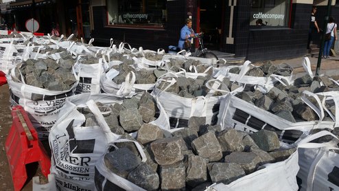 In het midden van de Breestraat komt een rij klinkers als middengeleider. Die dient om het inhalen te ontmoedigen.