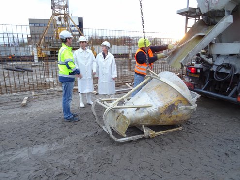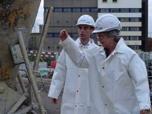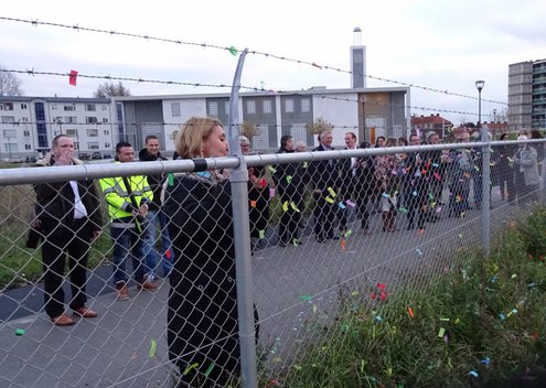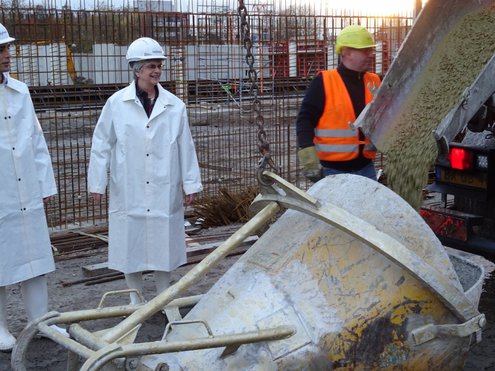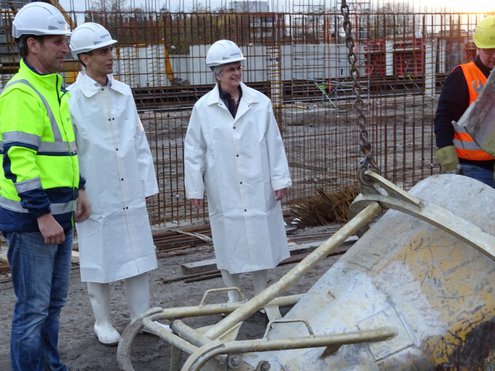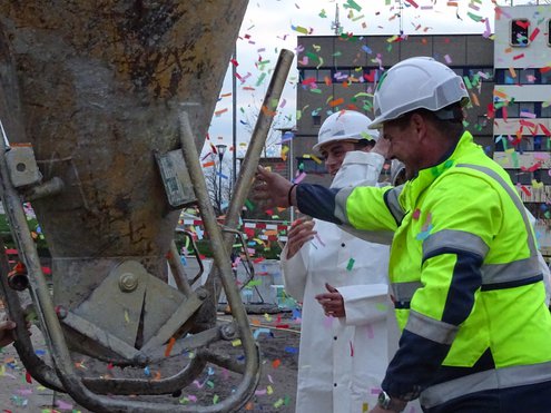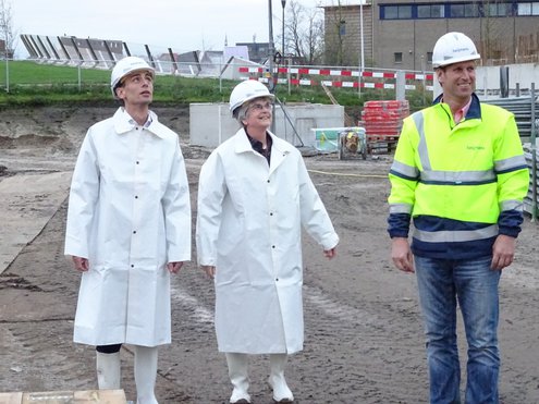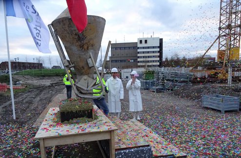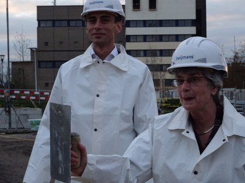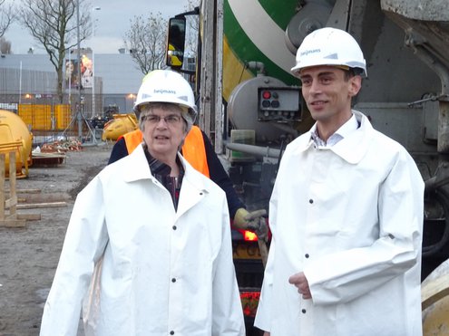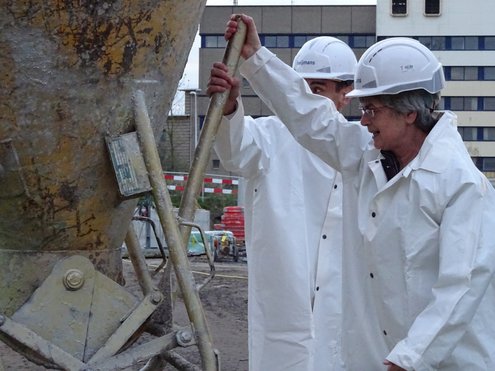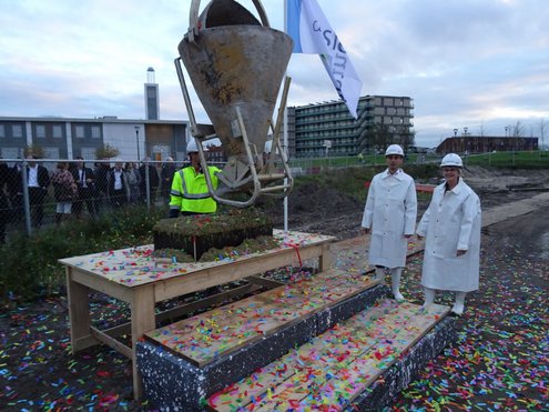 Met het storten van een bak speciaal Heijmans-geel beton is gistermiddag officieel de bouw van start gegaan van voorlopig het laatste grote nieuwbouwproject van woningcorporatie De Sleutels. Op de hoek van de Willem de Zwijgerlaan en de Gooimeerlaan verrijst de komende anderhalf jaar een enorm complex met 178 appartementen. Als De Sleutels een ontwikkelaar vindt, is er op die locatie later ook nog ruimte voor 51 extra appartementen.