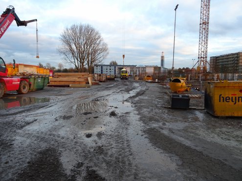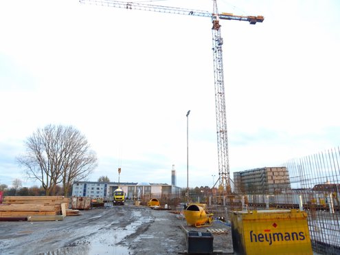 Om het enorme complex te bouwen, op het hoogste gedeelte wordt het gebouw 14 verdiepen hoog, is ook uitzonderlijk materiaal nodig. Vorige week werd al een bouwkraan neergezet van ruim 50 meter hoog. Voor de kerst komt daar nog een tweede exemplaar bij van meer dan 70 meter hoog.