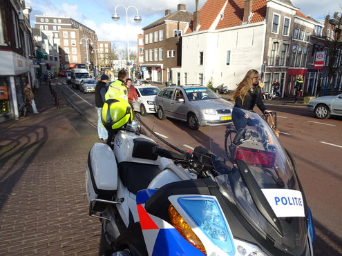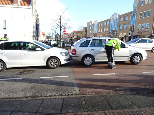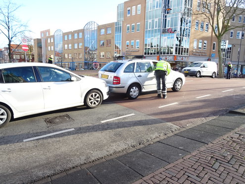 Het is een aanrijding van niks. Geen gewonden en nauwelijsk schade, maar wel een flinke vastloper in de binnenstad. De Hooigracht en de Langegracht stonden behoorlijk vol doordat de twee auto's de weg blokkeerden. (Foto's: Chris de Waard).