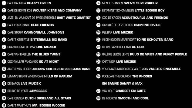 Er is een heuse jazzwijk rond de Hooglandse Kerk. Verschillende kroegen, café’s en eetgelegenheden rond de Hooglandse Kerk hebben gedurende de hele week optredens. Er zijn o.a. optredens van de Andrew Spiekerband, Wouter Kiers & Company, Men in Blues and de Trio de la Hîti. In de Qbus staan op 24 en 25 januari Teus Nobel & (The) Band en Her’s & Kings County op het podium. Nobel presenteert tegelijkertijd zijn nieuwe album.