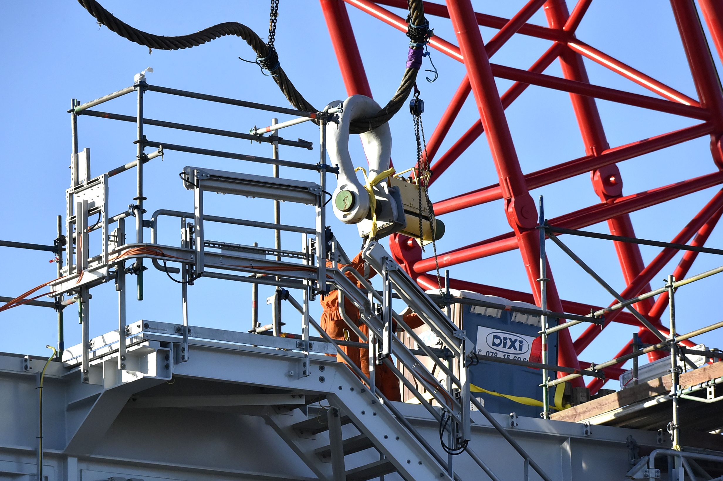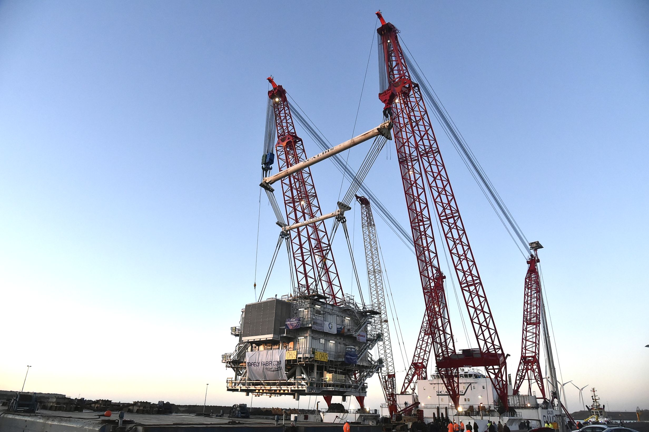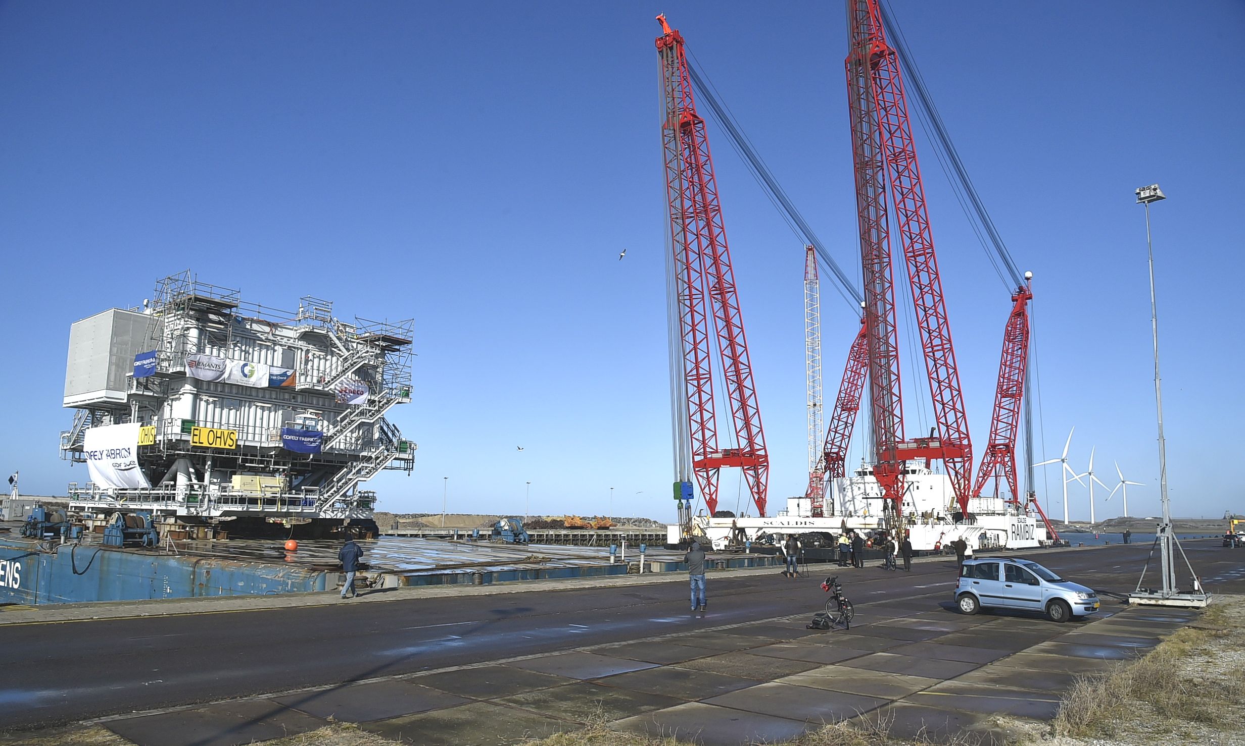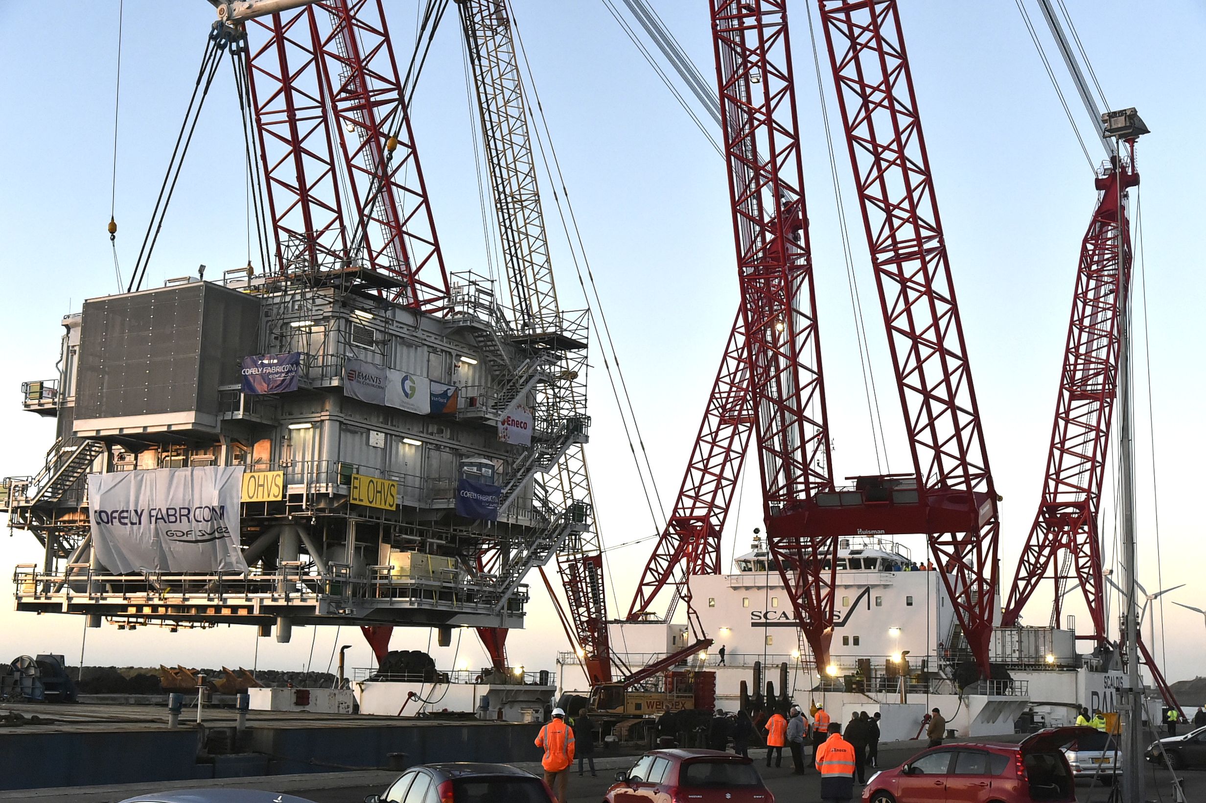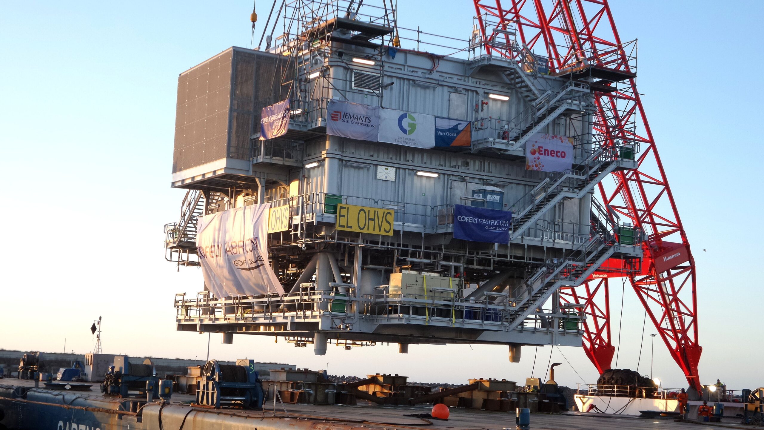 Zondag werd het gevaarte de boot opgehesen in IJmuiden. Daarbij werd een enorm kraanschip ingezet: de RAMBIZ. Gisterenavond is het konvooi uit IJmuiden vertrokken om offshore geïnstalleerd te worden. Zo’n 23 km uit de kust van Noordwijk.