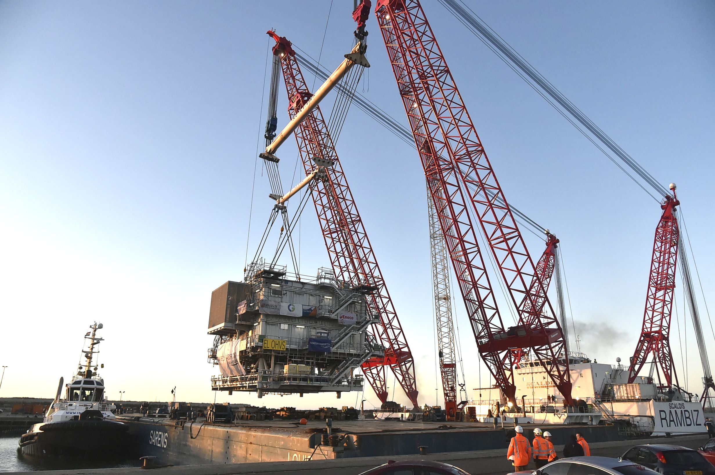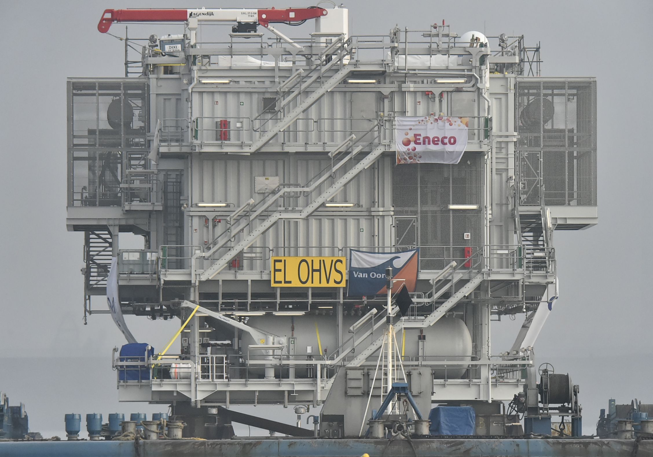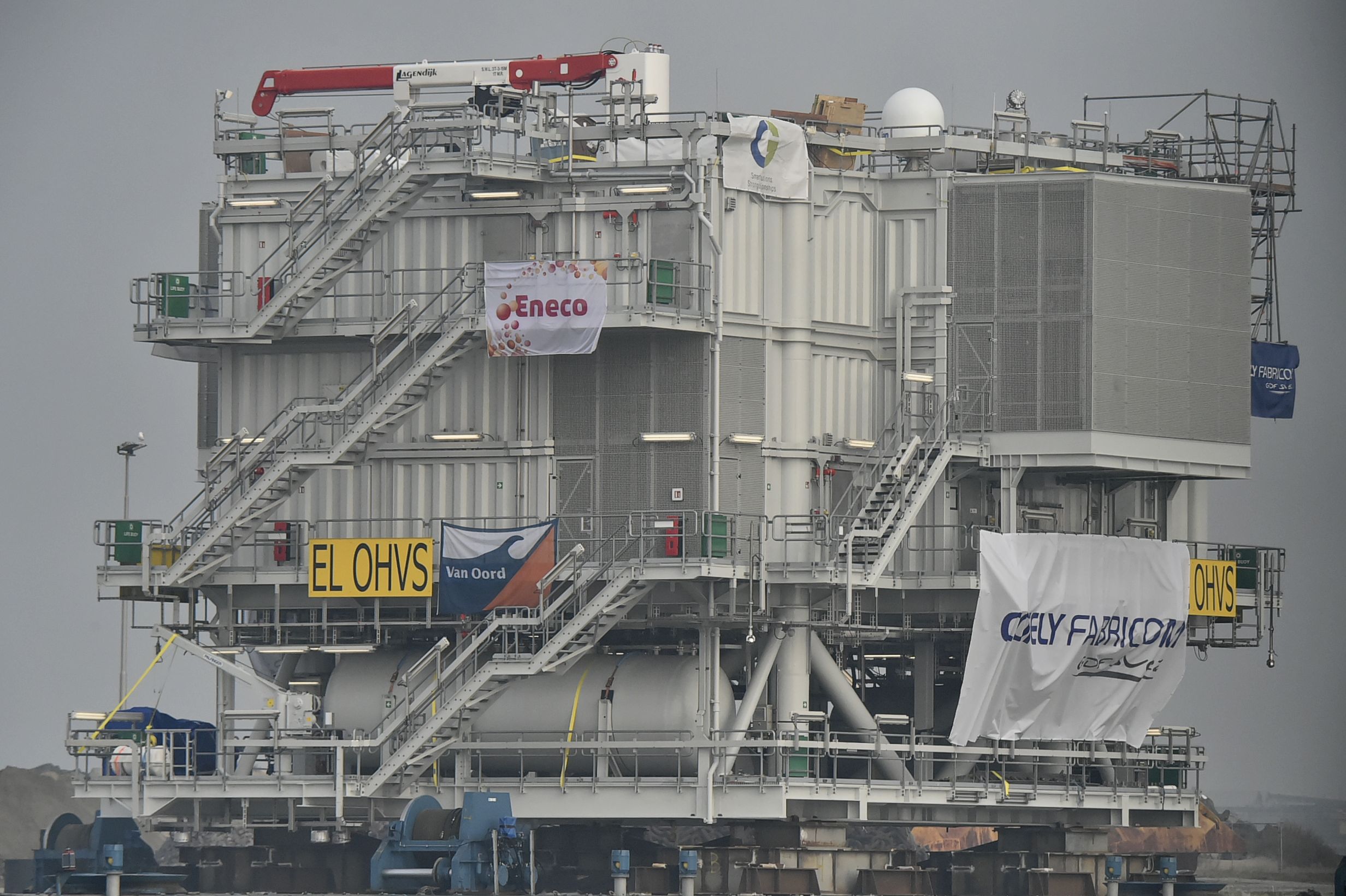 Bij een windmolenpark op zee horen niet alleen enorme windmolens. Ook de randapparatuur mag er wezen. Het transformatorstation bijvoorbeeld. 900 Ton zwaar en vier verdiepingen hoog. Het hoogspanningsstation werd de afgelopen maanden opgebouwd in het Belgische Hoboken bij Antwerpen.