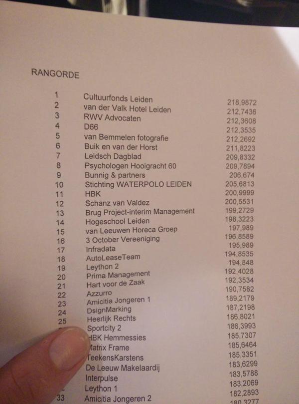 Ook bij deze vierde Slag om Leiden ging het er bij veel teams weer fanatiek aan toe. De strijd om de wisselbokaal werd dit keer dus beslecht door het Cultuurfonds. Op de tweede plek eindigde Van der Valk Hotel Leiden en op plek drie eindigde RWV Advocaten.