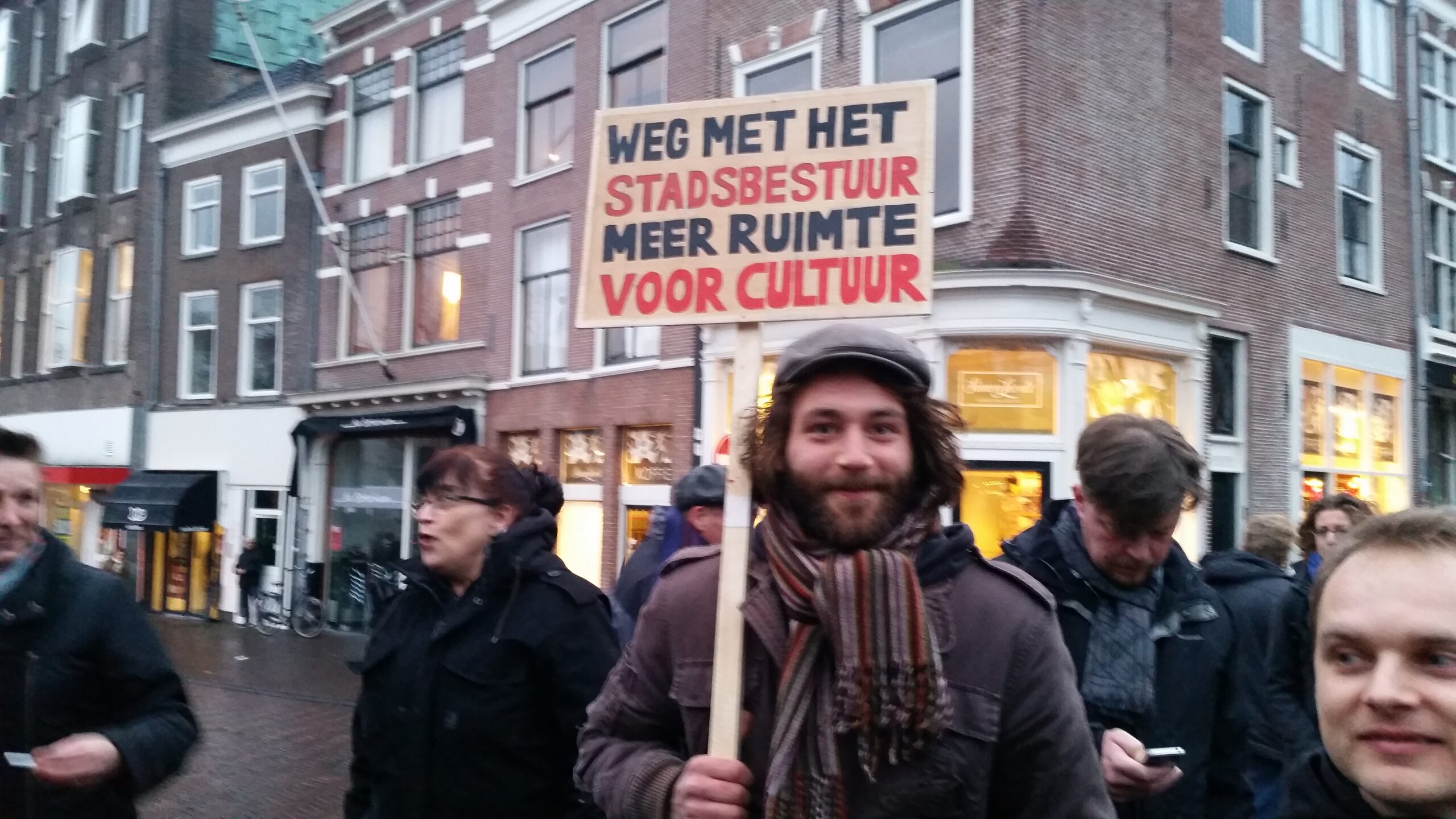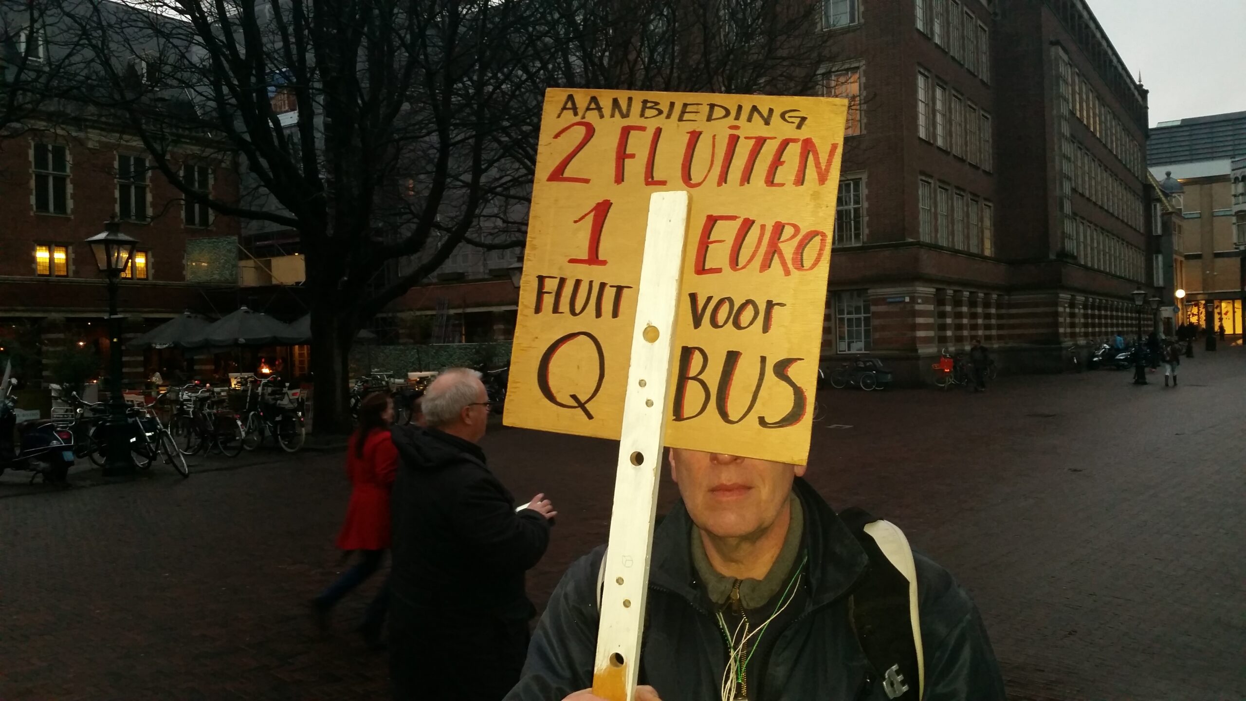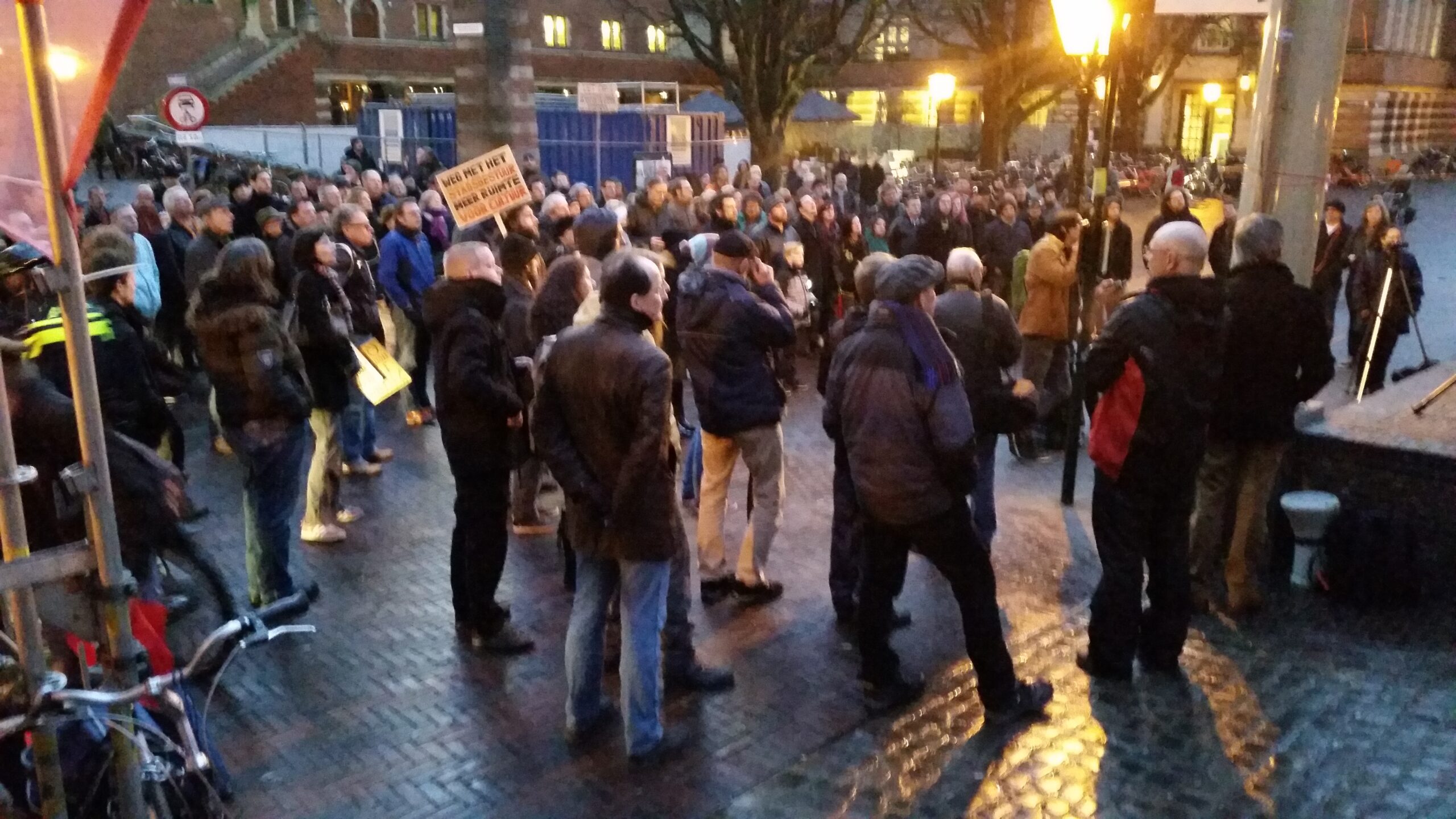 Reportage manifestatie ‘Qbus needs to stay’ voor het Leidse stadhuis (Door: Chris de Waard).