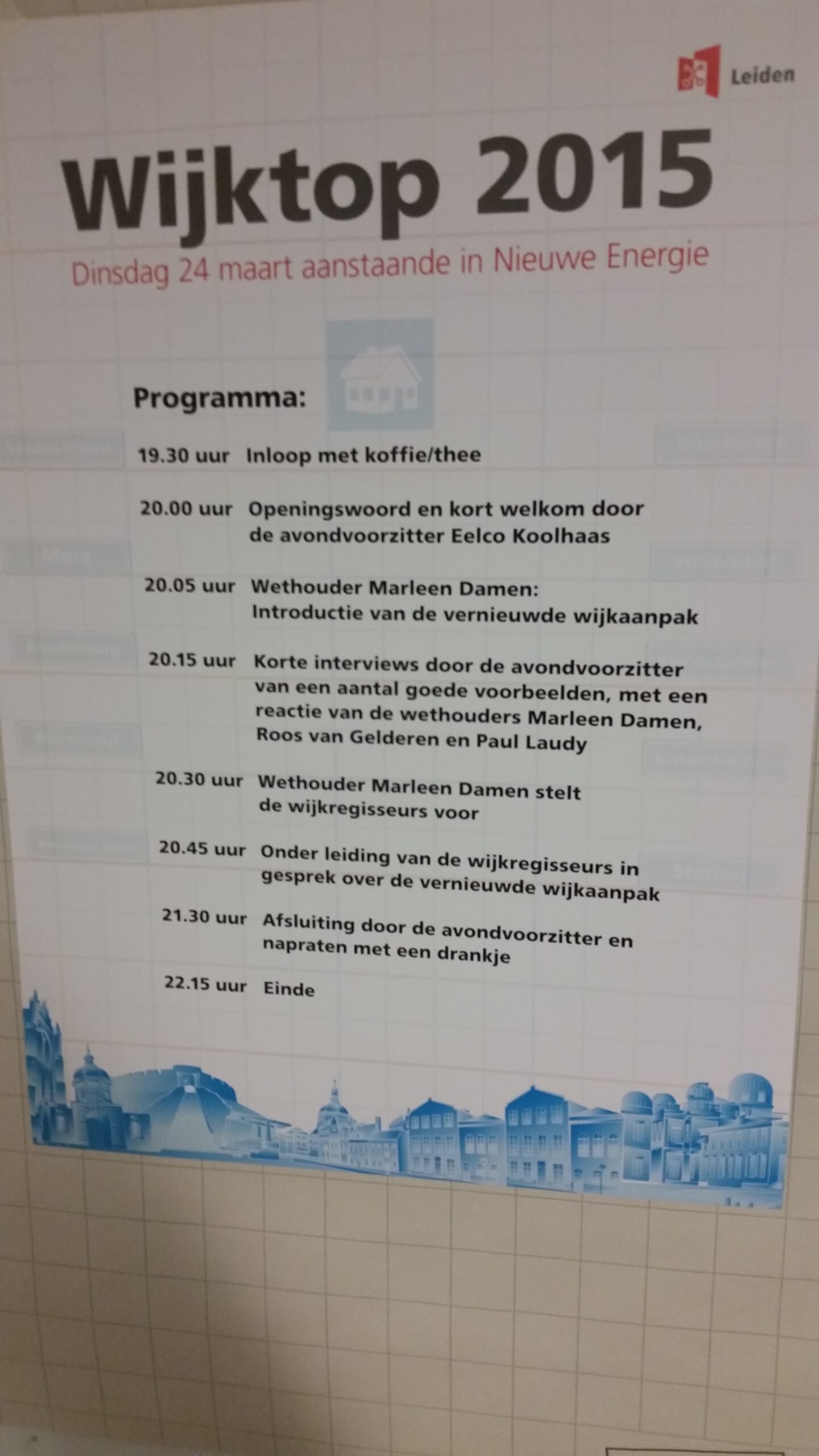 De Leidse PvdA ging vorig jaar de verkiezingscampagne in als de partij voor de wijken met als slogan ‘En nu de wijken’. Dat wekt verwachtingen en toen de partij in het college ging deelnemen kreeg wethouder Marleen Damen dan ook de nieuwe portefeuille ‘wijken’. Dinsdagavond was er een erg zichtbaar resultaat van haar inspanningen: de Wijktop 2015. Niet alleen Damen kwam opdraven. Ze nam haar collega-wethouder Roos van Gelderen en Paul Laudy ook mee. Die eerste gaat bijvoorbeeld over de sociale wijkteams, Laudy over de inrichting van de openbare ruimte.
