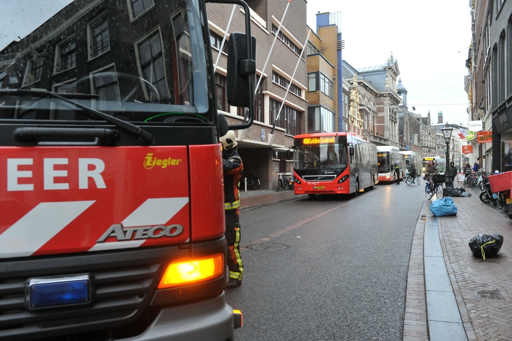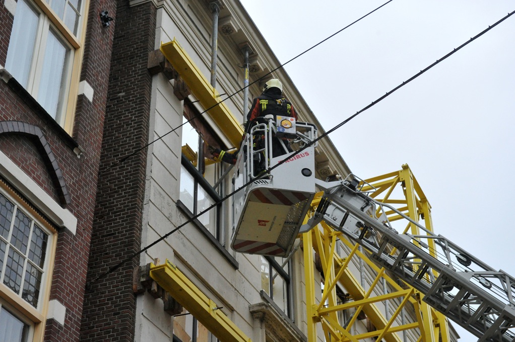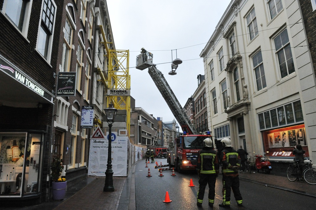 In de Breestraat zijn de sloopwerkzaamheden van het Rijnlandblok in volle gang om plaats te maken voor de nieuwbouw van het ROC ID College. Daarbij blijft de monumentale gevel van het voormalige postkantoor behouden. Die staat goed ingepakt in de stutten. Toch ging het gisteren mis, De harde wind kreeg vat op de kozijnen die nog in de gevel zitten. De brandweer kwam snel in actie om een einde te maken aan de gevaarlijke situatie.