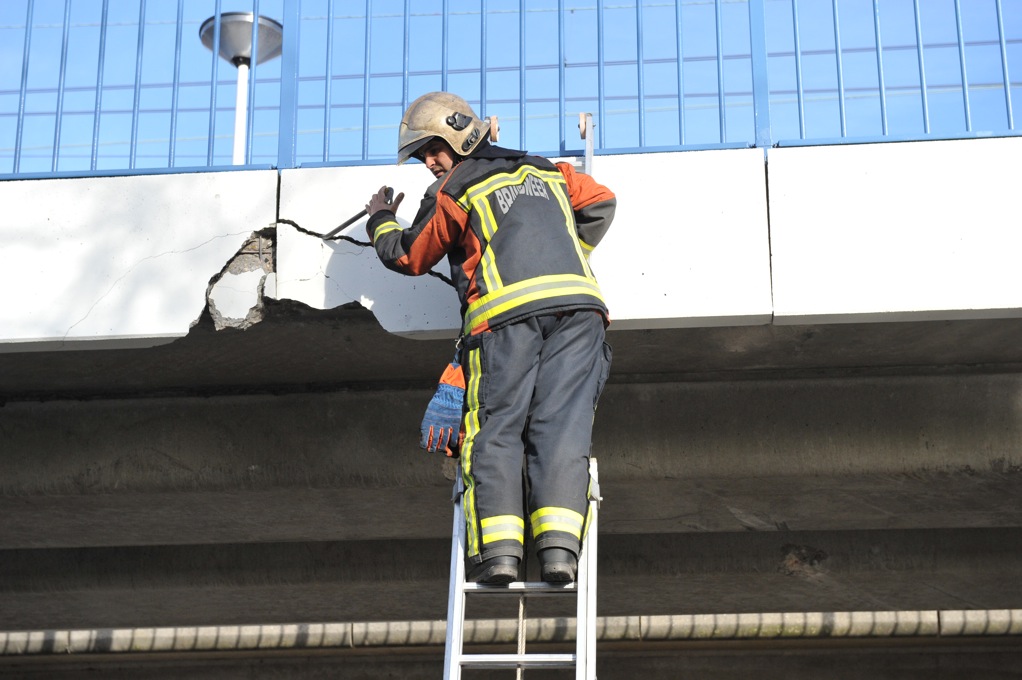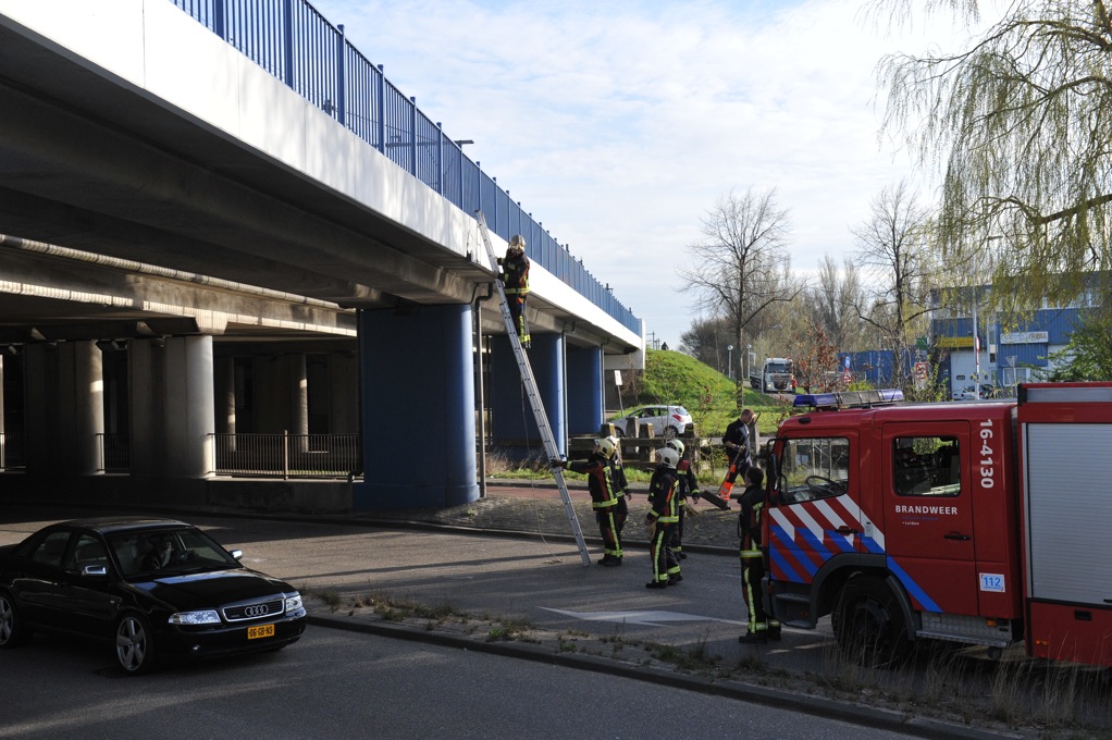 Een vrachtwagen heeft vanmorgen het spoorviaduct over de Oegstgeesterweg in Leiden geramd. De brandweer heeft een aantal losgeraakte stukken beton verwijderd,