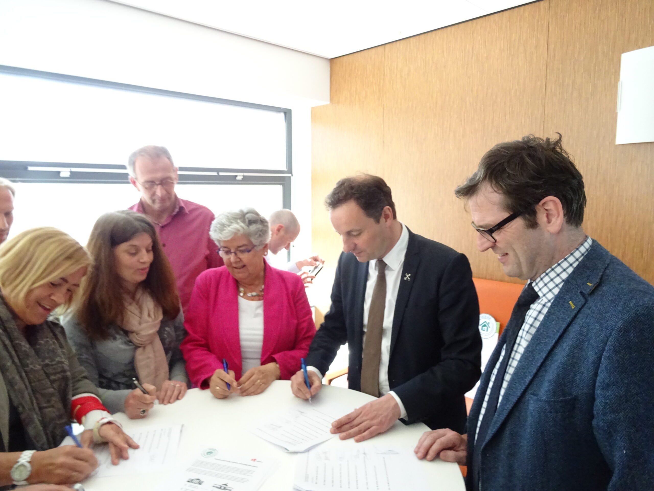 Vanmiddag is in de St. Josephschool in de Oppenheimstraat de eerste Leidse ‘Green Deal’ ondertekend voor de verduurzaming van schoolgebouwen. Wethouder Frank de Wit (Onderwijs en Duurzaamheid) en de deelnemende schoolbestuurders spreken daarmee af om samen op te trekken in het nemen van een hele serie maatregelen om energie te besparen en ook om andere energiebronnen te gaan gebruiken waar dat kan.