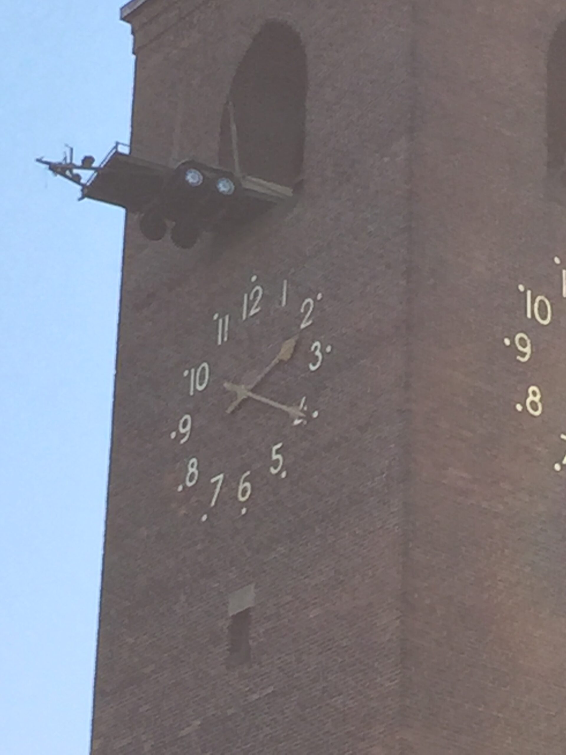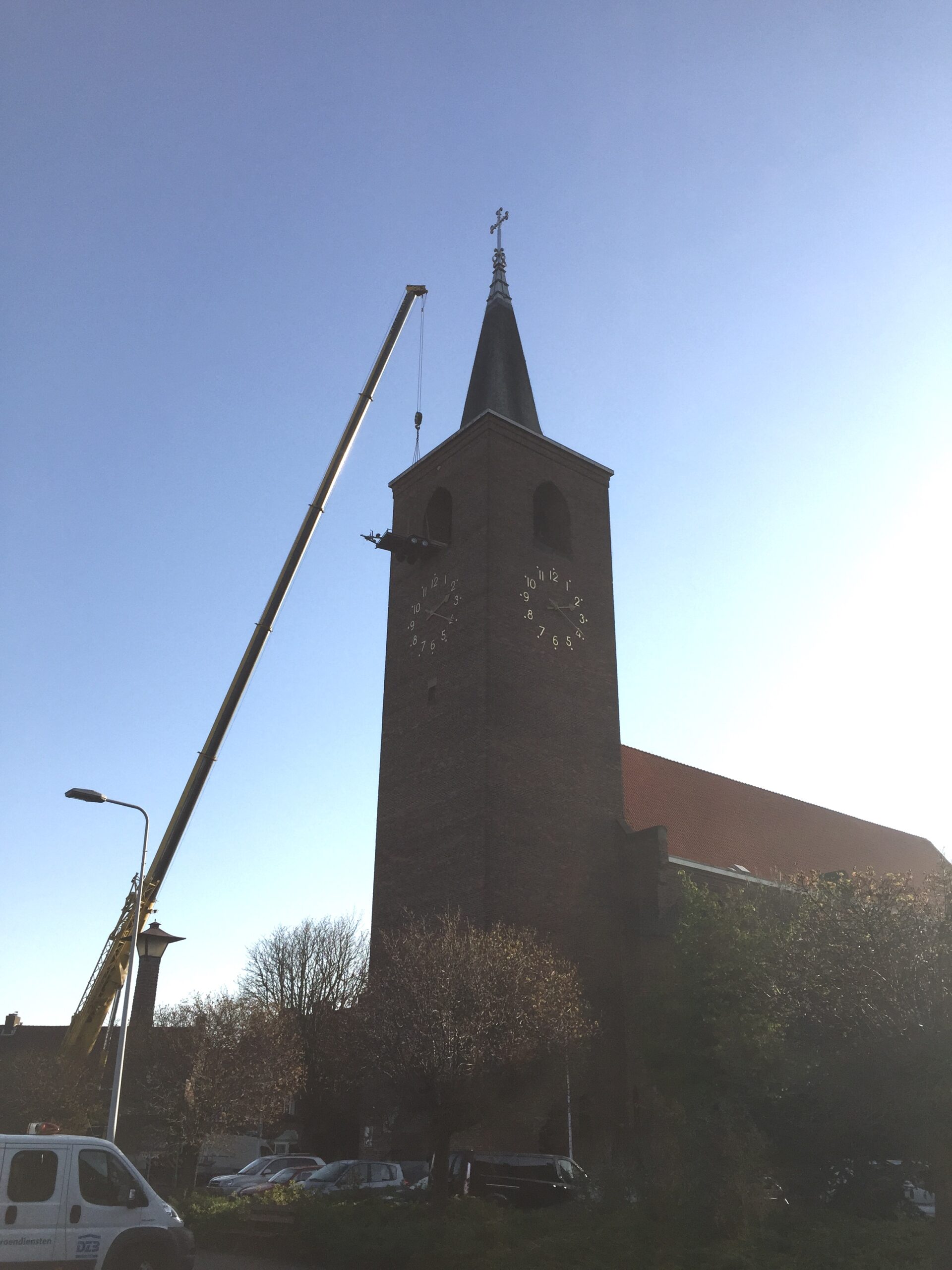Reparatie van het uurwerk is geen sinecure op die hoogte. In de klokkentoren moest een vijf meter hoge steiger worden gebouwd onder de klok zelf. Om al die materialen boven te krijgen bedacht de beheercommissie een creatieve oplossing. De hele boel werd op een aanhangwagen geladen en vervolgens met een hoogwerker in een van de galmgaten gehesen. Het leverde een bijzonder beeld op.