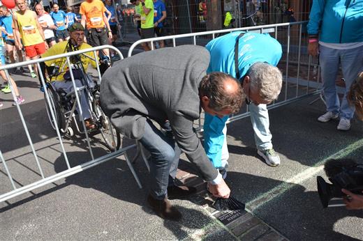 Om het belang van de Leiden Marathon voor Leiden te benadrukken, heeft het stadsbestuur een vaste starttegel en een finishtegel laten plaatsen. “Deze twee ijkpunten symboliseren de grote dank aan de organisatoren van de Leiden Marathon. Zij brengen Leiden immers al jarenlang op alle fronten in beweging,” zo vond de wethouder die gisterochtend de starttegel ter hoogte van het Gangetje onthulde.