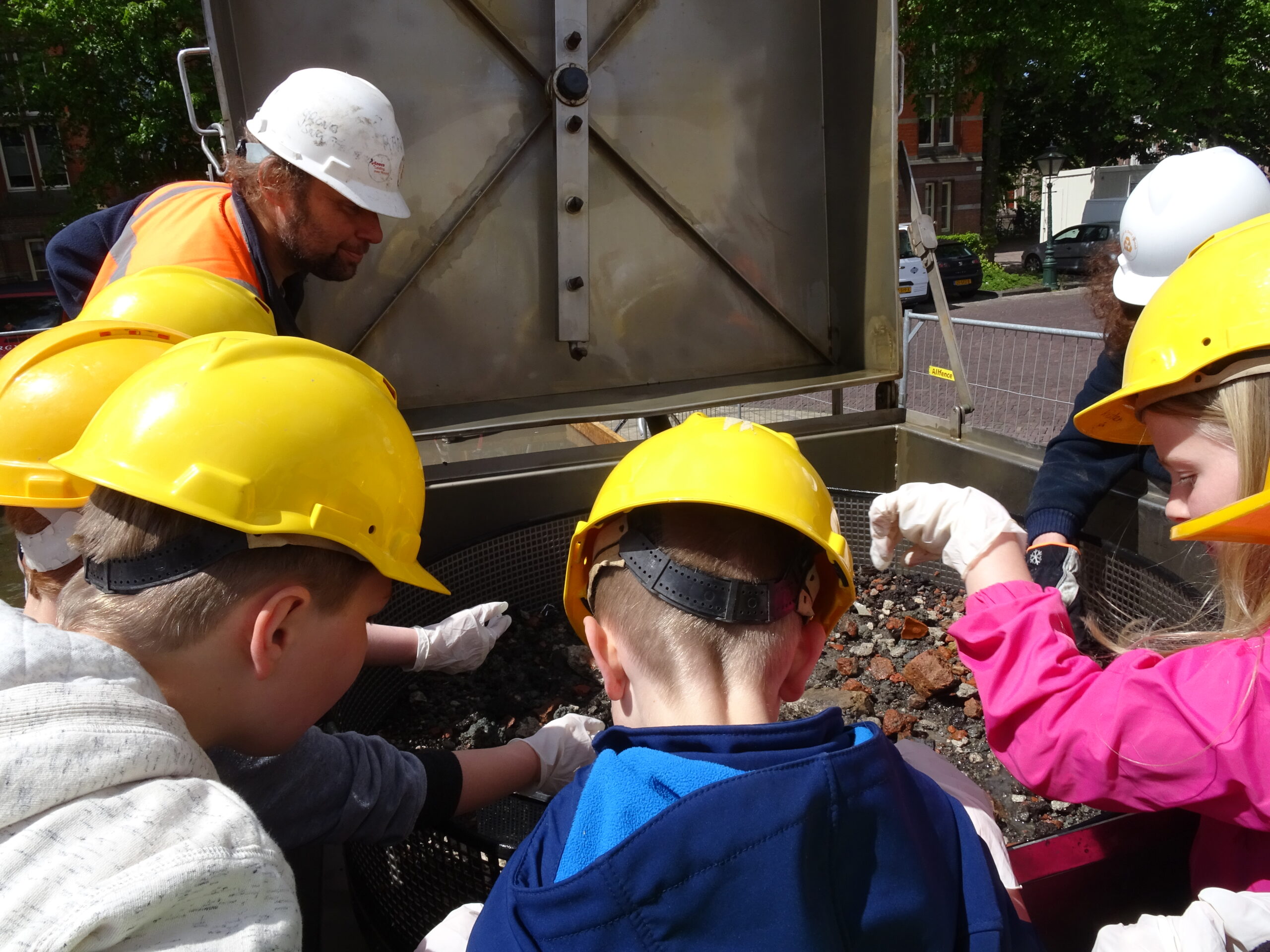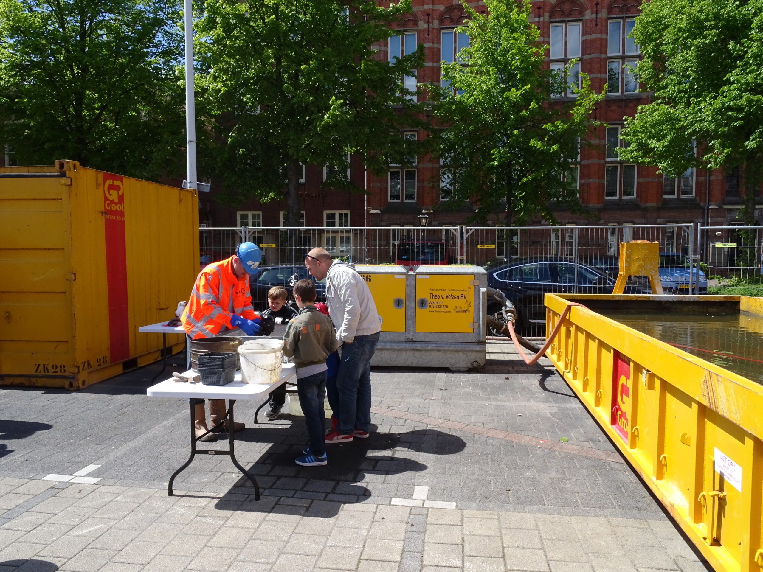 Rond half twee waren meerdere kinderen al op zoek naar botten en scherven, begeleid door Leidse archeologen, zoals Brandenburgh en Jeroen van Eijk. “De kinderen zijn goed bezig”, zegt die laatste. “Ze zien vaak dingen waar volwassenen overheen kijken. En ze leren daarnaast wat over de materialen die in de grond zitten. We staan lekker in de zon, goed weer om te graven en met water te spelen!”