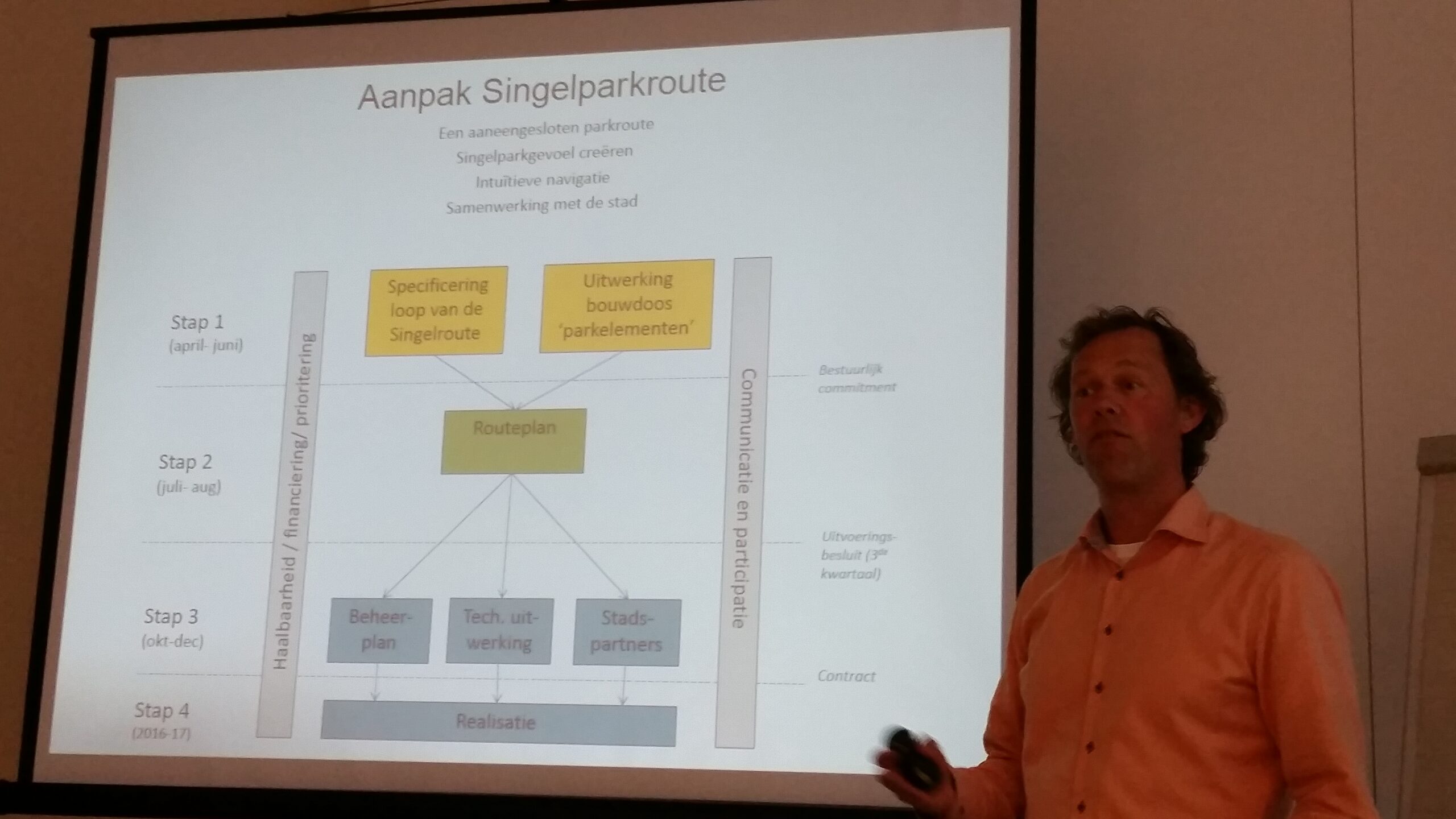 Tijdens een presentatie van communicatiebureau Kessels Kramer en projectleider Ernest Pelders werd duidelijk waar de gemeente en de Vrienden van het Singelpark aan denken. De wandelroute moet zo intuïtief mogelijk worden. Op plekken waar het niet meteen duidelijk is dat je nog ‘in’ het Singelpark bent, worden hulpmiddelen toegepast. Bijvoorbeeld parkiconen. Dat zijn metalen vormpjes van herkenbare zaken die met het park te maken hebben. Bomen, vogels en gebouwen bijvoorbeeld. Die parkiconen worden bij wijze van spreke ‘langs de route gestrooid’.