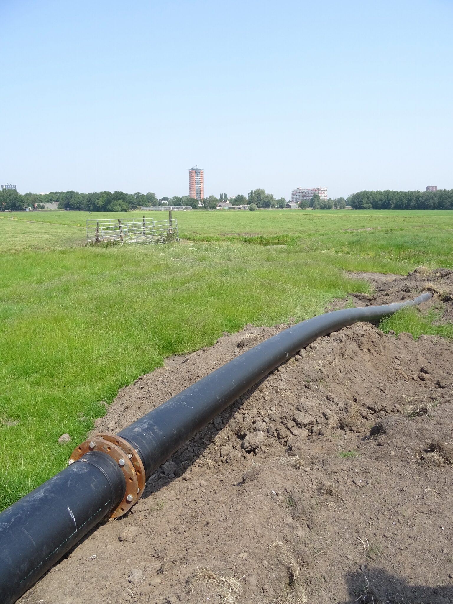 In de Oostvlietpolder, op een flink stuk weiland langs de Europaweg, komt de modderstroom weer uit de buis. De toplaag van het grasland is afgegraven en ligt als een dijk rond een enorm meer. Daar stroomt de modder in. Het water gaat via een retourleiding terug naar het Rijn Schiekanaal. De grondlaag blijft achter en zo wordt het land opgehoogd. Een win-win-situatie. De grond hoeft niet tegen betaling ergens te worden gestort en de boer heeft een mooie manier om zijn land op te hogen.