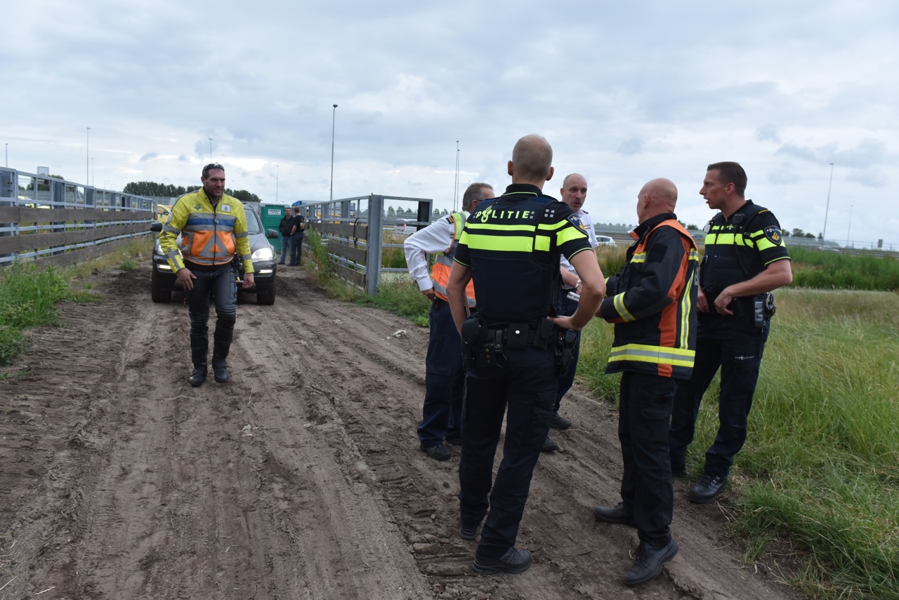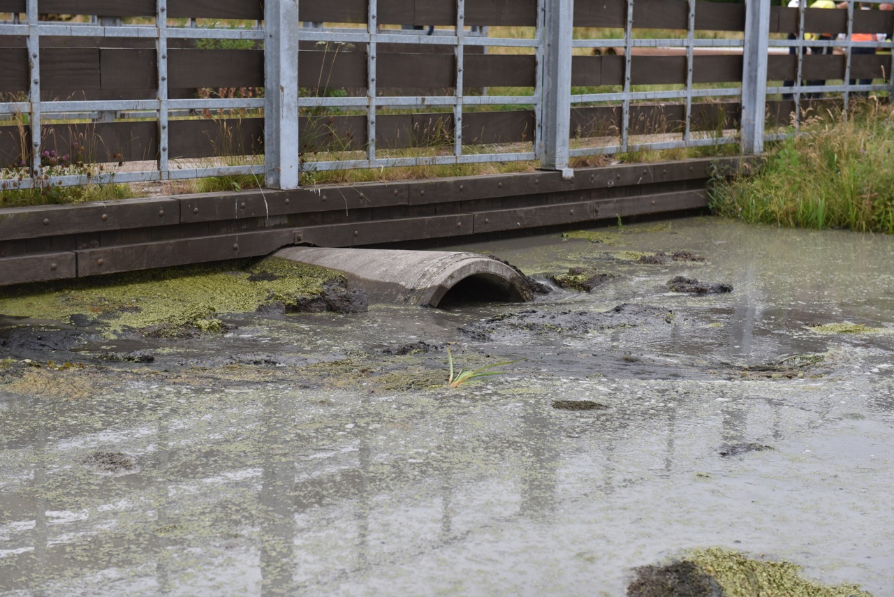 Het depot bestaat uit een weiland waarvan de toplaag is afgegraven. Die toplaag ligt als een dijk om het depot heen en is verstevigd met rijplaten. Toch ging het gisteren op mis en zakte een stuk van de dijk in, waardoor het water met slib de polder in kon lopen.
