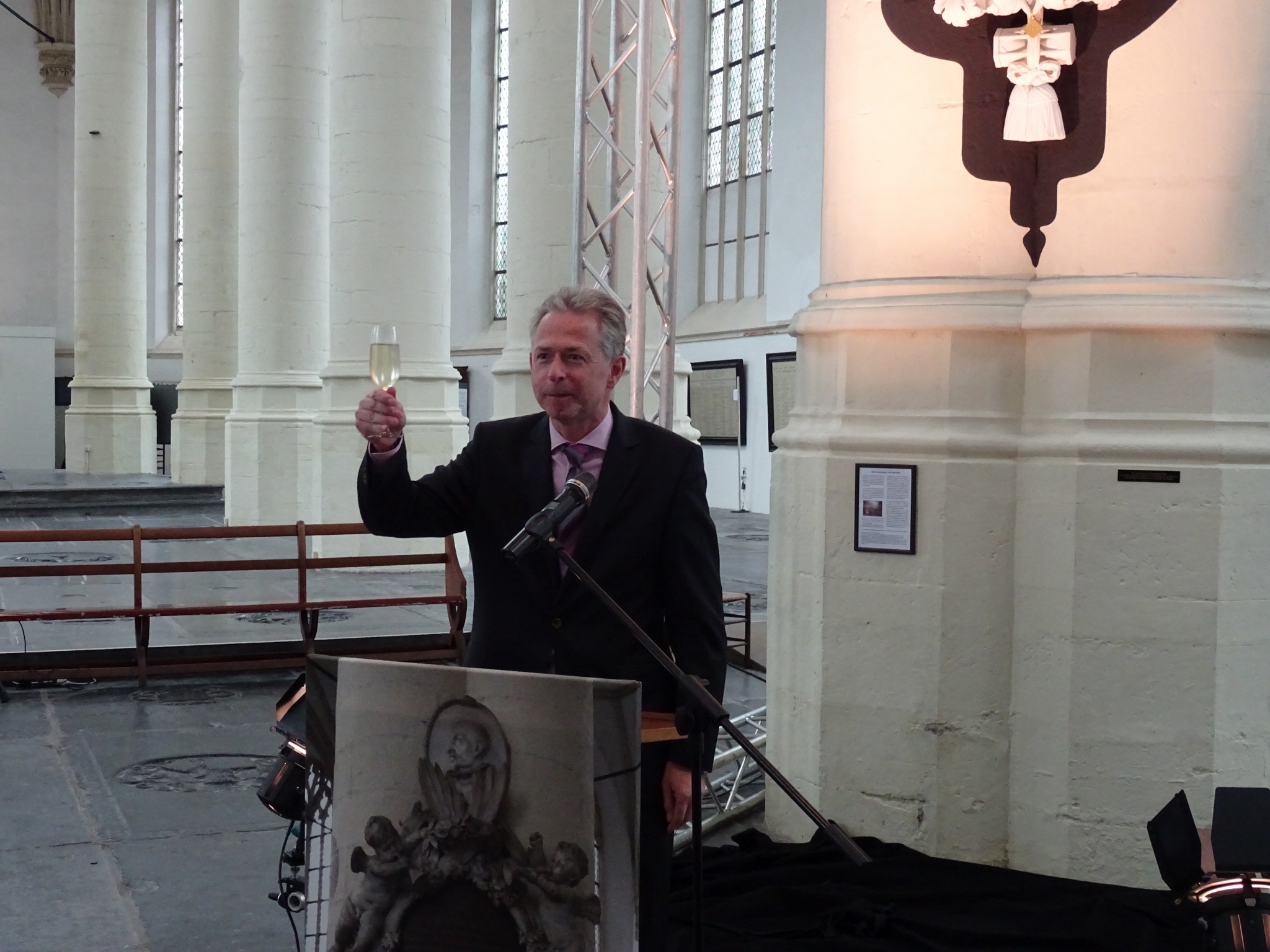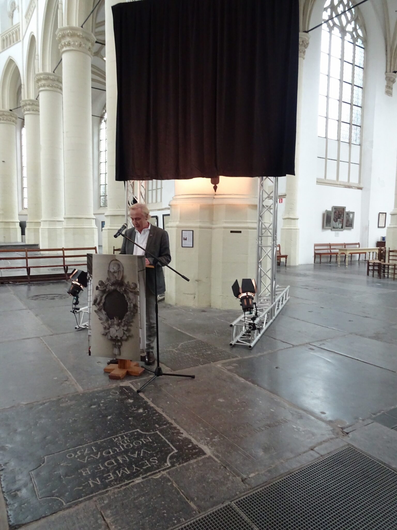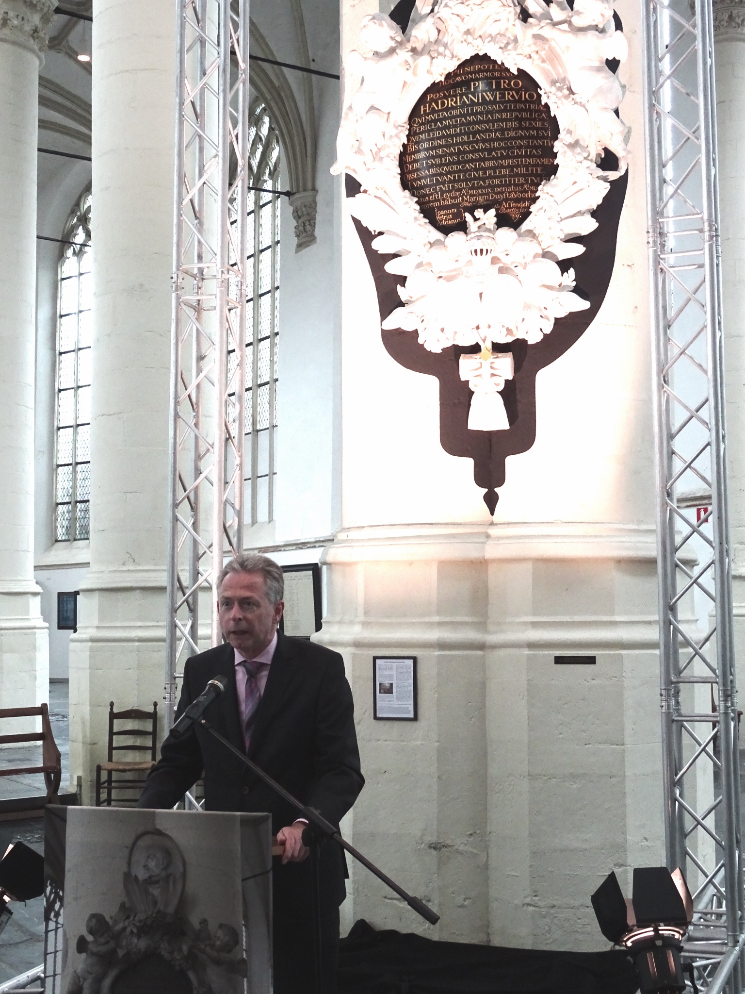 Nee, het is geen vergissing. De naam in de titel is de achternaam waarmee de Leidse burgemeester Van der Werf – met één f – werd geboren. Dat onthulde voorzitter Egbert Molenaar van het College van Kerkrentmeesters van de Hooglandse Kerk gistermiddag bij de onthulling van de gerestaureerde epitaaf. “Van der Werf heette eigenlijk Vermeer. Hij had achter zijn woning een grote werf en veranderde zijn naam in Van der Werf. Iets dat in die tijd heel gebruikelijk was. En laat het nu voor eens en altijd duidelijk zijn. Van der Werf is met één F.”