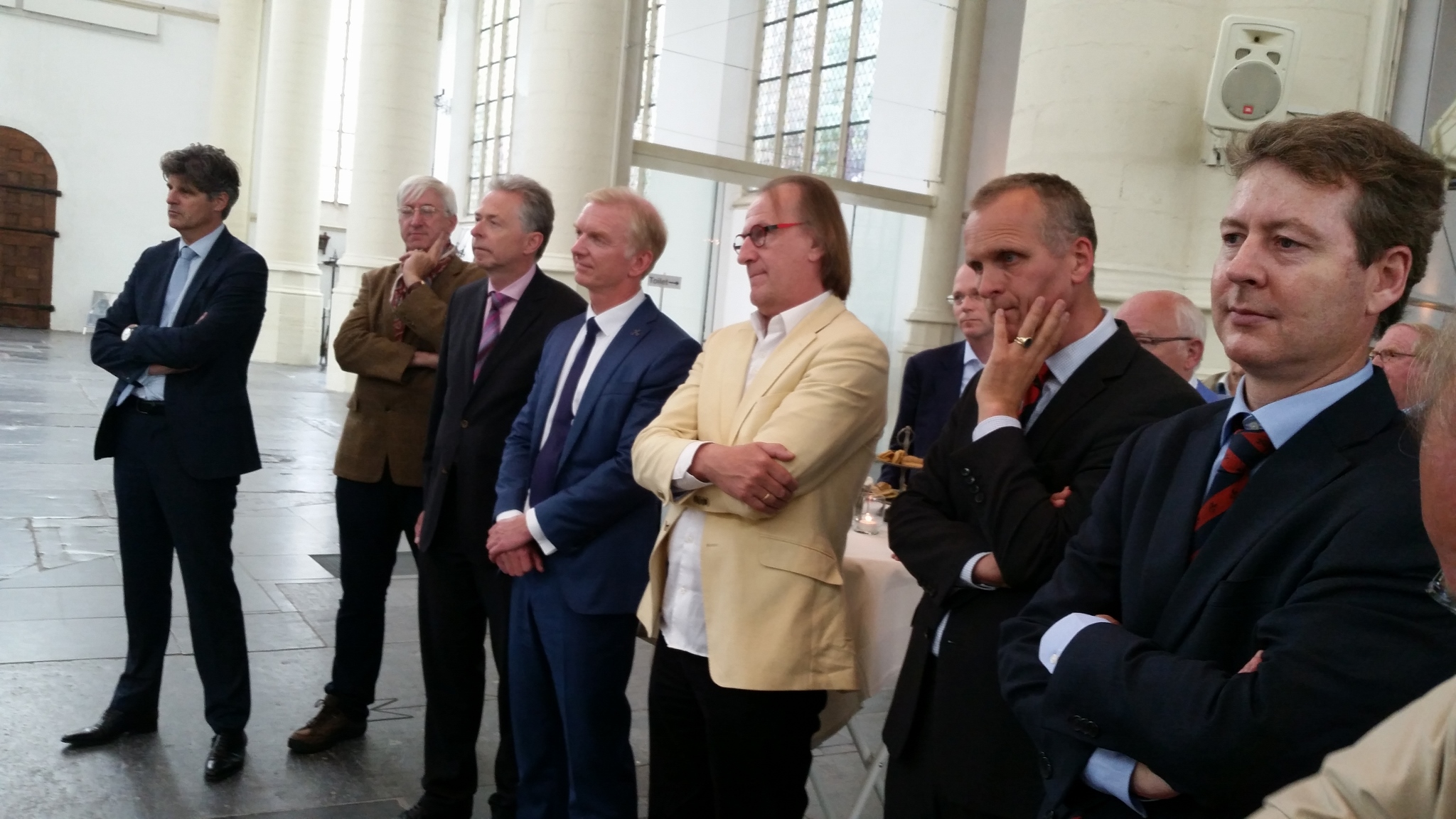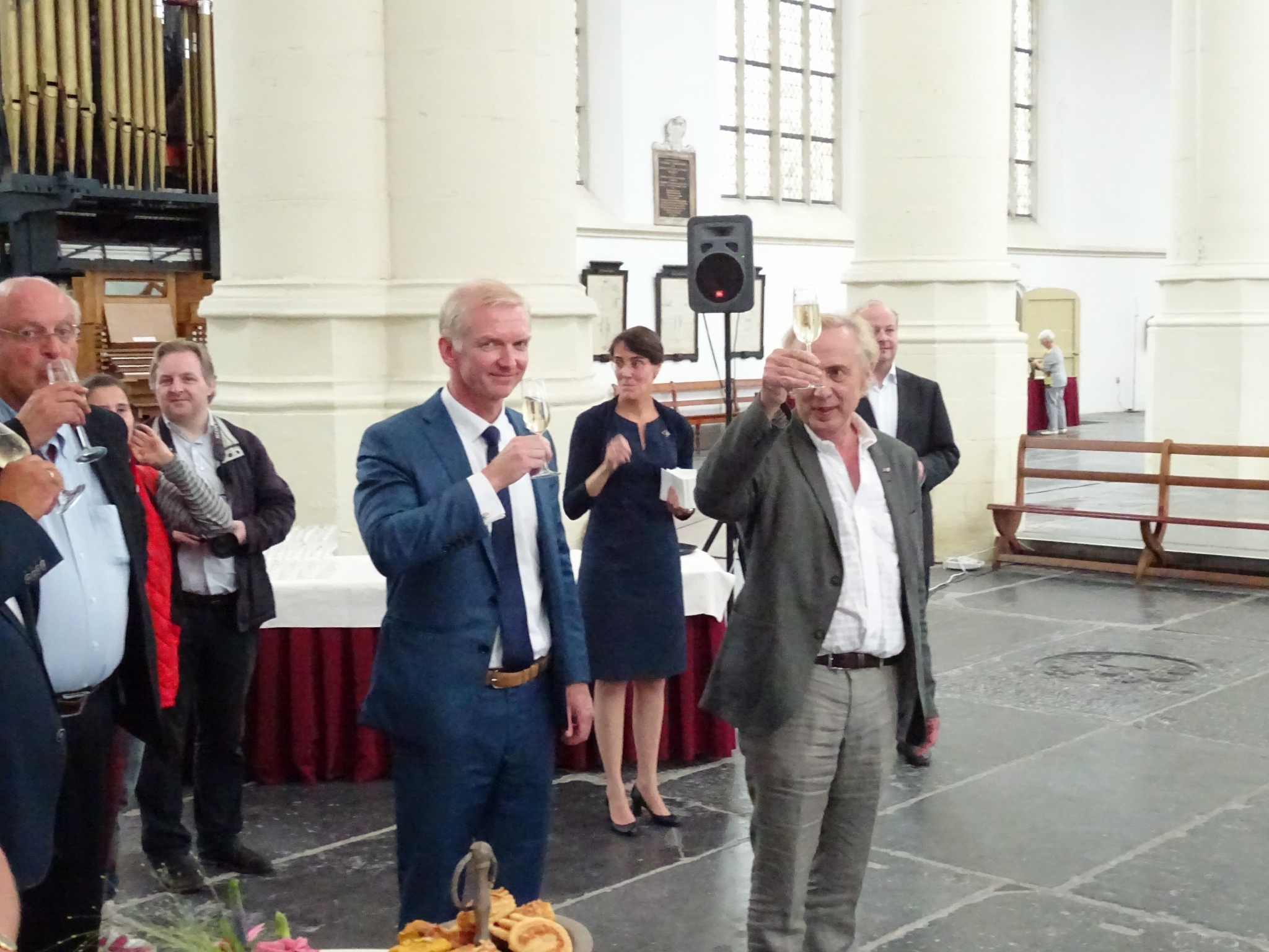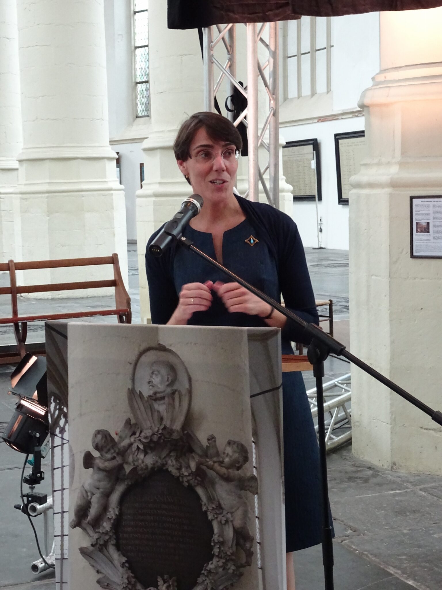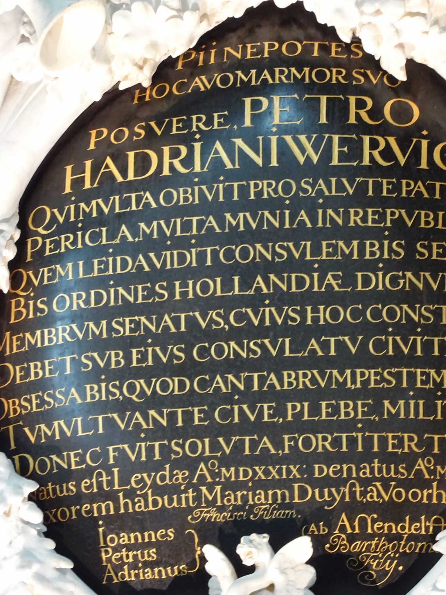 Nee, het is geen vergissing. De naam in de titel is de achternaam waarmee de Leidse burgemeester Van der Werf – met één f – werd geboren. Dat onthulde voorzitter Egbert Molenaar van het College van Kerkrentmeesters van de Hooglandse Kerk gistermiddag bij de onthulling van de gerestaureerde epitaaf. “Van der Werf heette eigenlijk Vermeer. Hij had achter zijn woning een grote werf en veranderde zijn naam in Van der Werf. Iets dat in die tijd heel gebruikelijk was. En laat het nu voor eens en altijd duidelijk zijn. Van der Werf is met één F.”