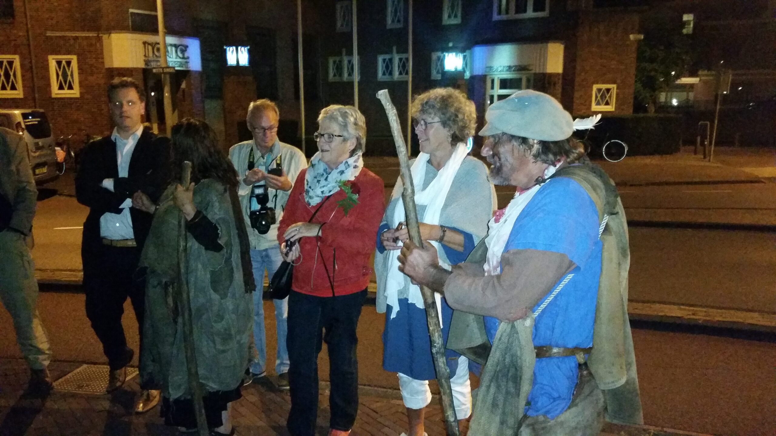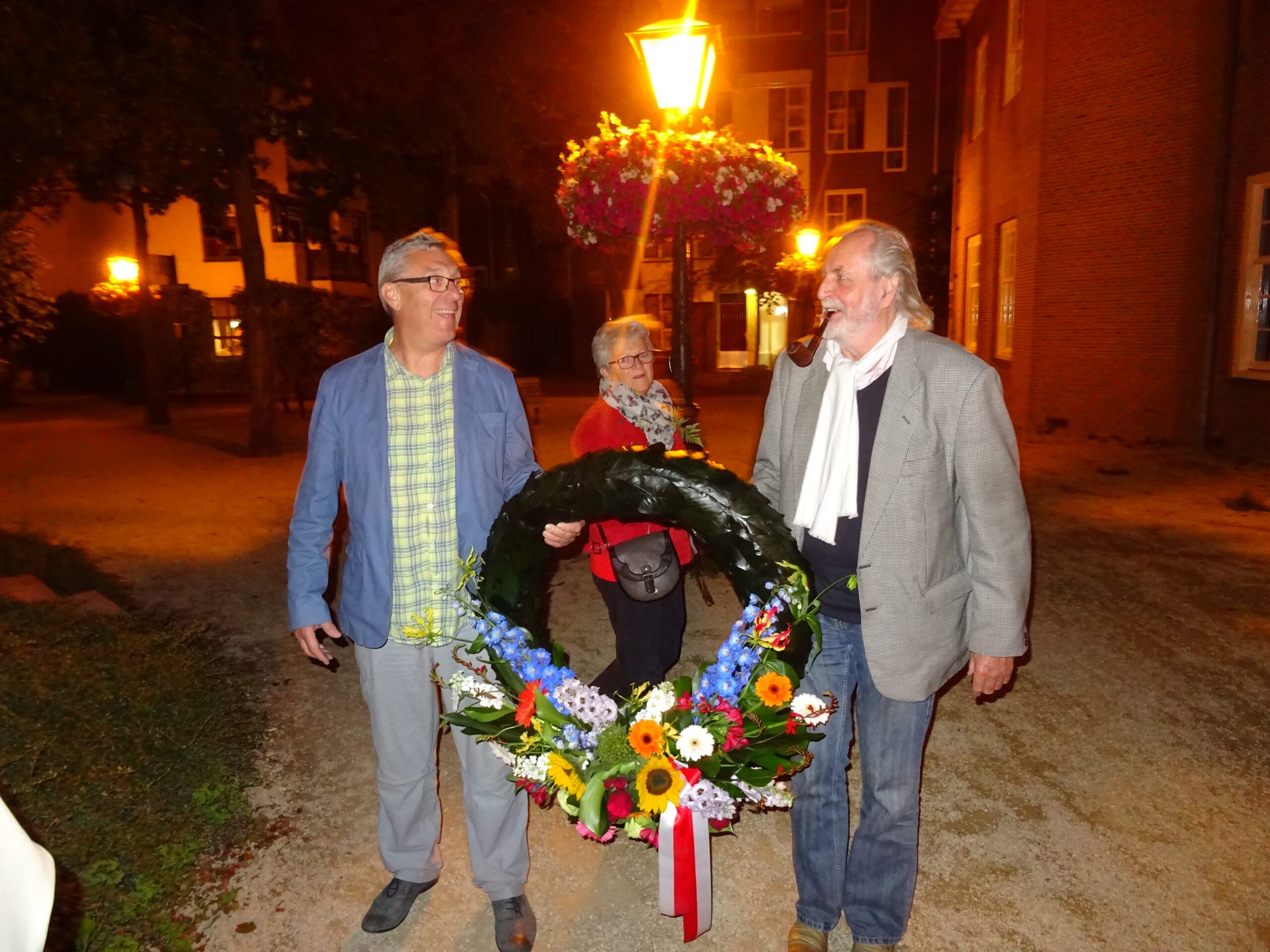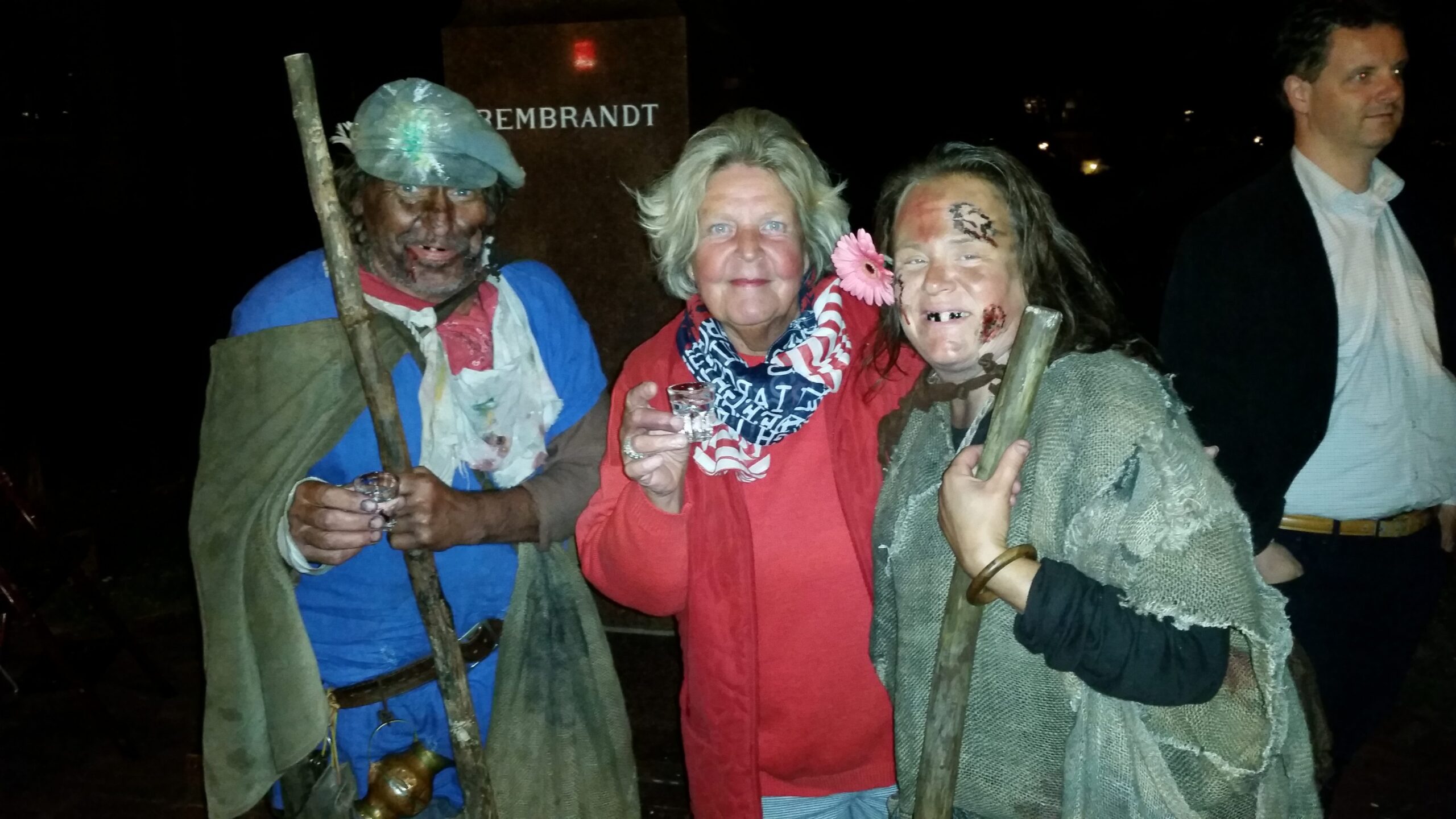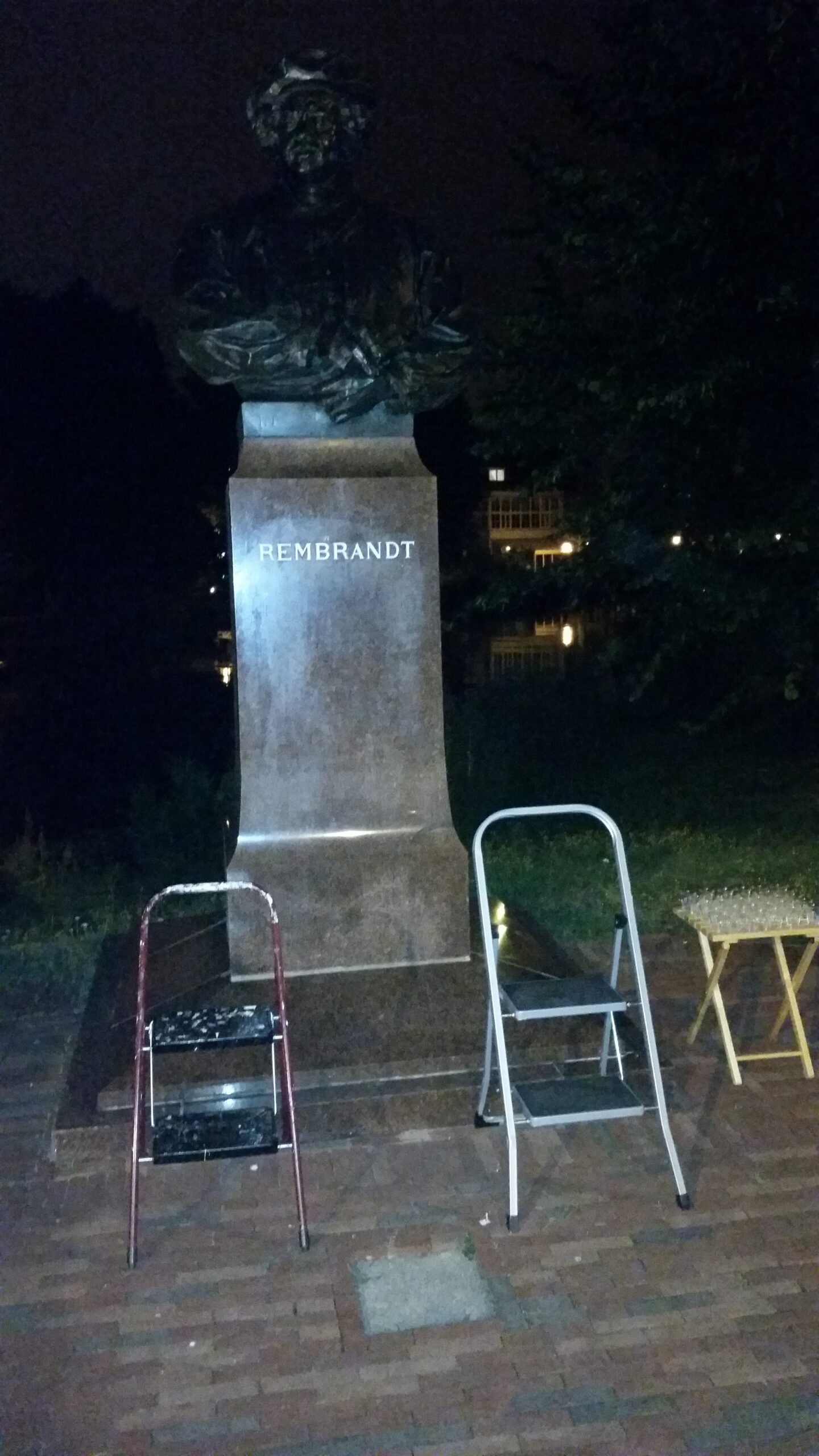 “2019 wordt weer een Rembrandtjaar,” zei Tjeerd Scheffer afgelopen nacht bij het borstbeeld van de beroemde schilder. Samen met Ben Walenkamp organiseerde hij voor de 14e keer een kranslegging om de verjaardag van Rembrandt te vieren. De schilder zou vandaag 409 zijn geworden.