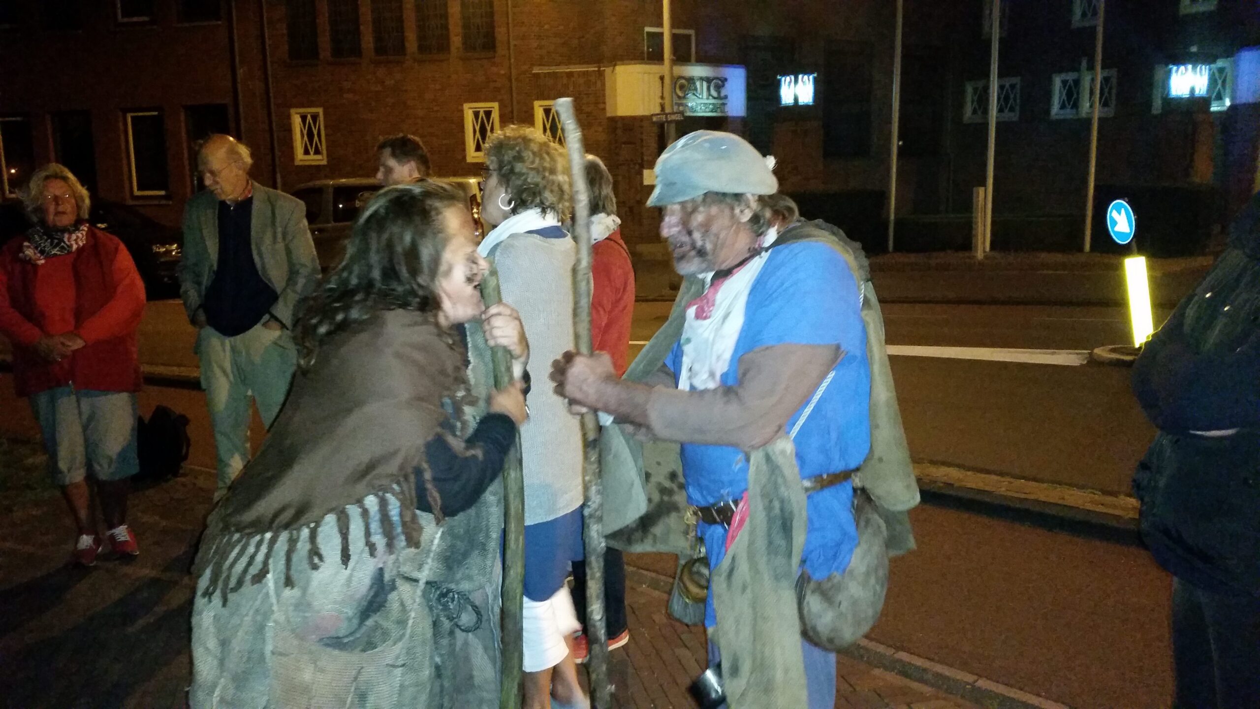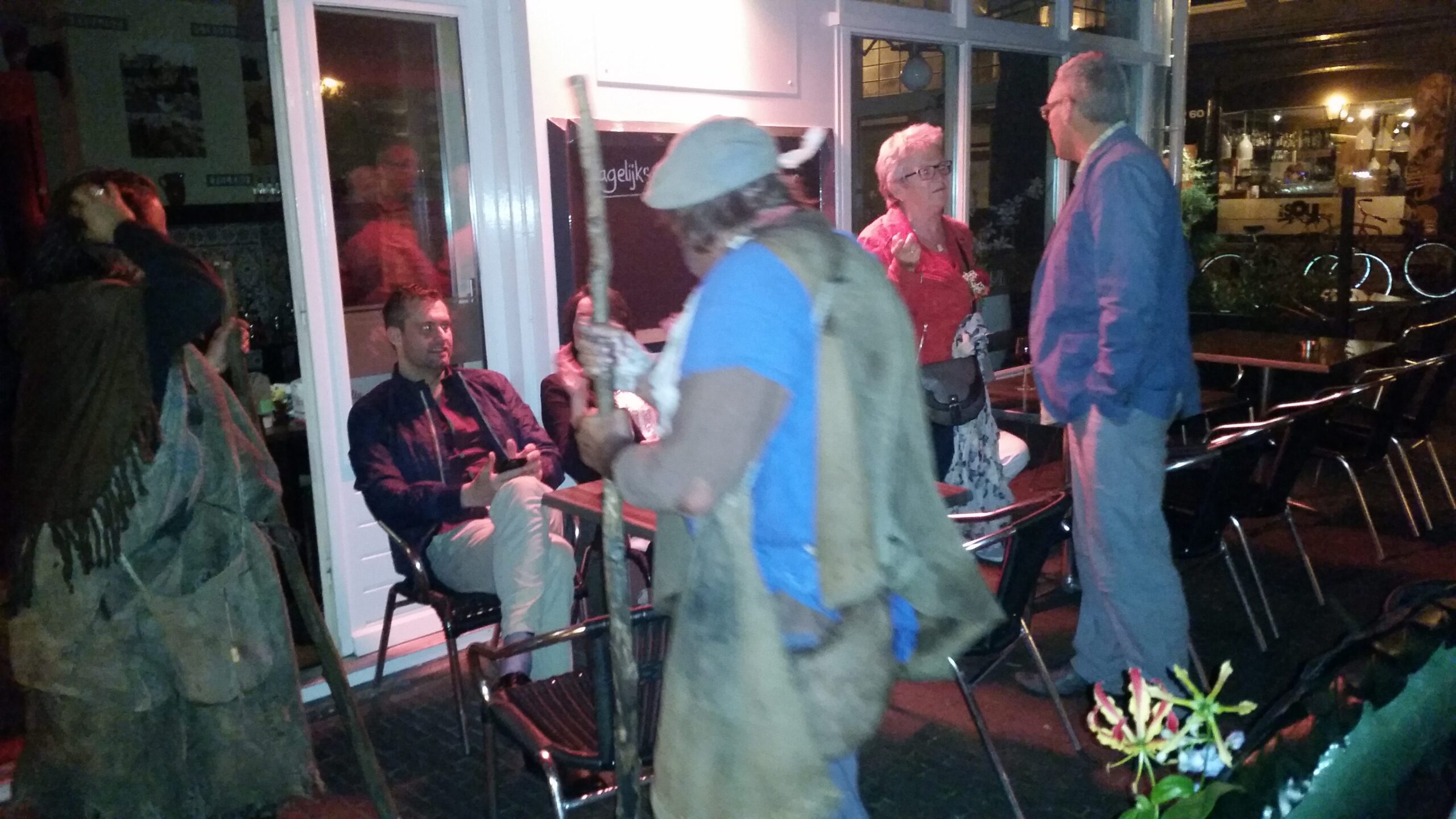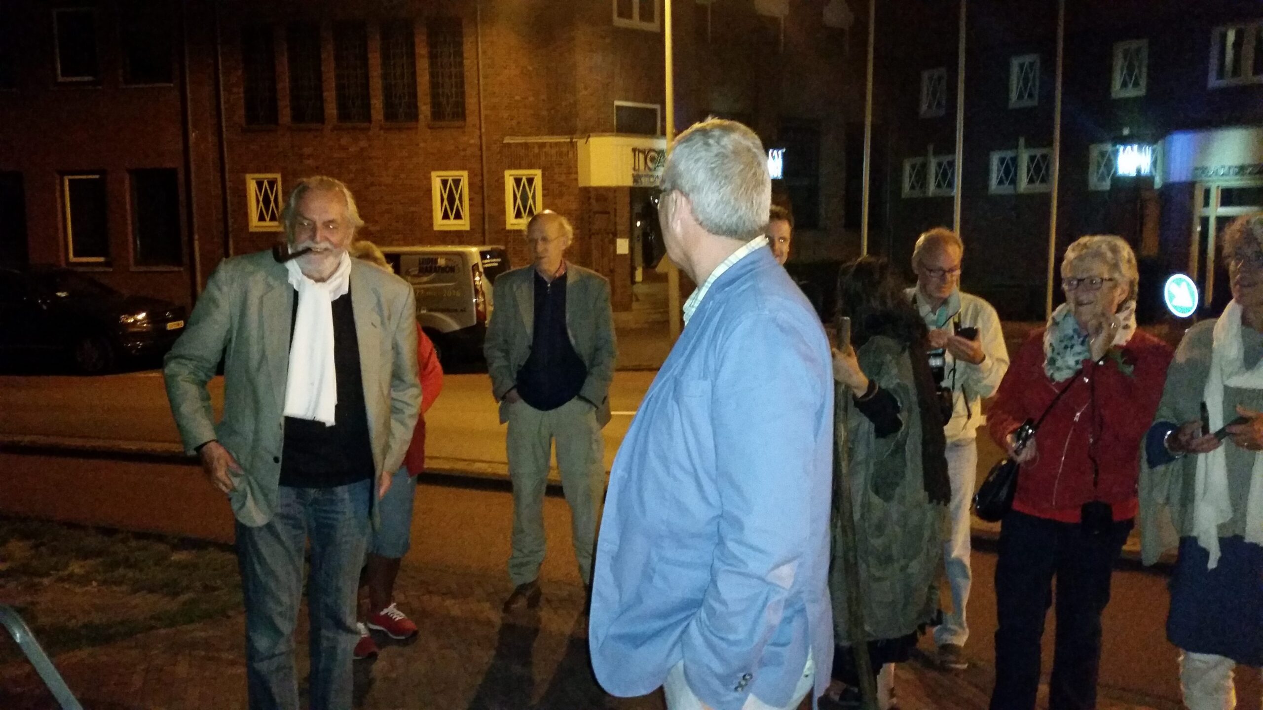 Chris de Waard in gesprek met Tjeerd Scheffer op het 409e verjaardagsfeestje van Rembrandt bij de Witte Singel.