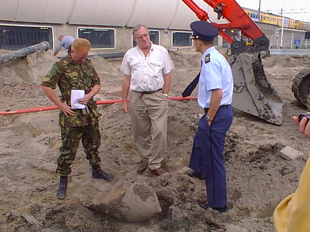 Bij werkzaamheden voor het centraal station werden eind jaren ’90 ook explosieven in de grond gevonden. Toenmalig burgemeester Goekoop kwam een kijkje nemen bij het werk van de EOD.