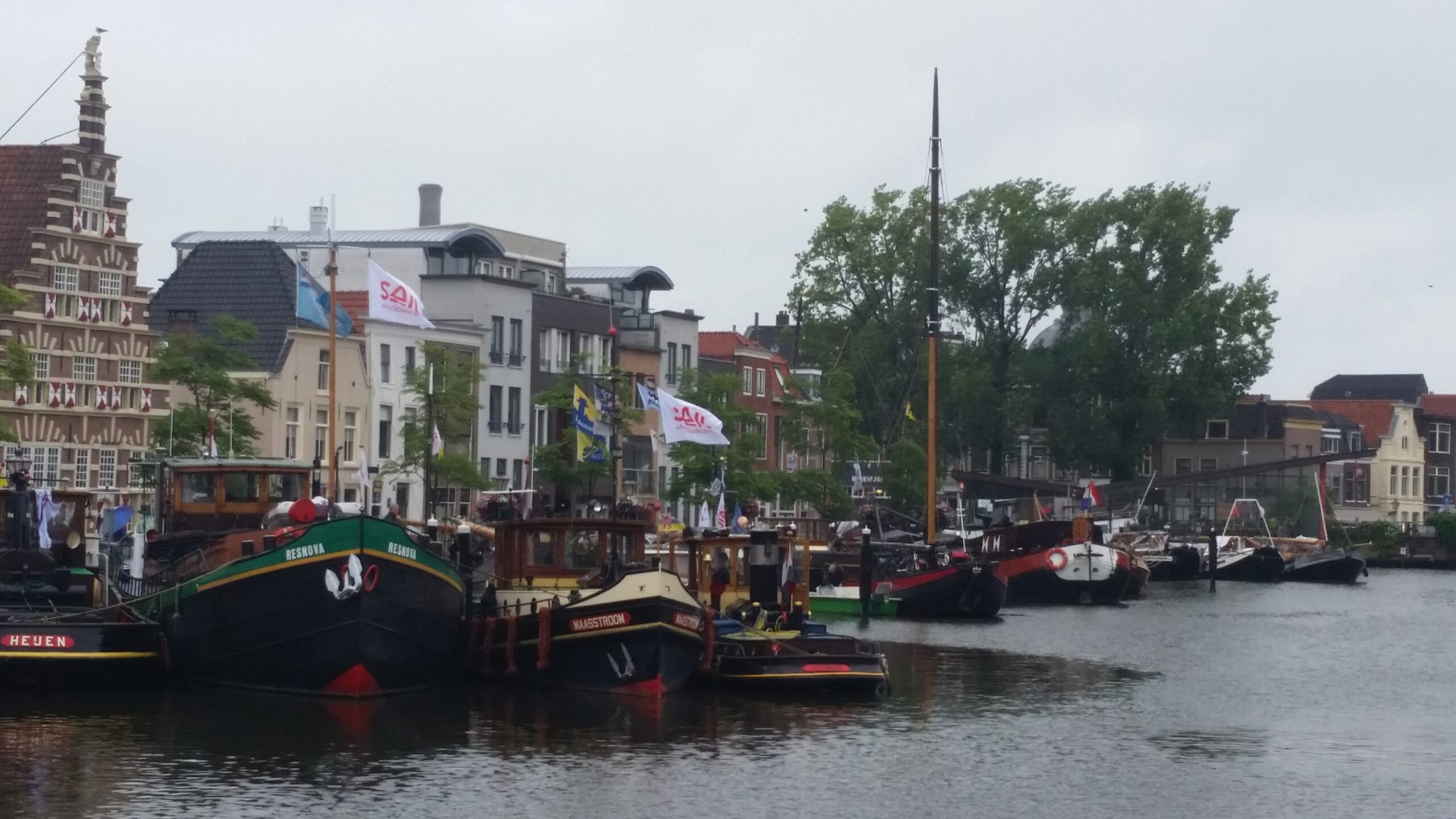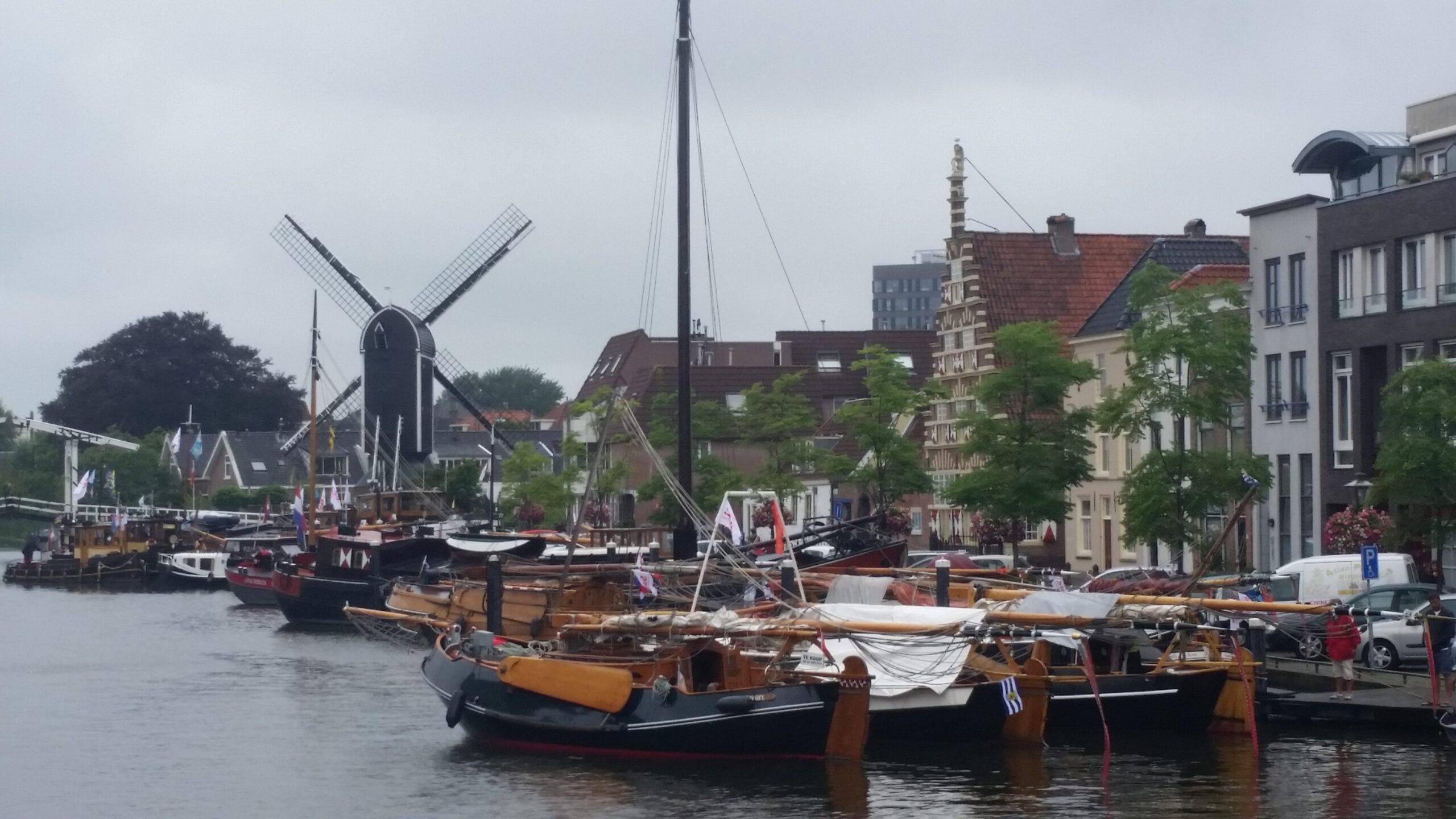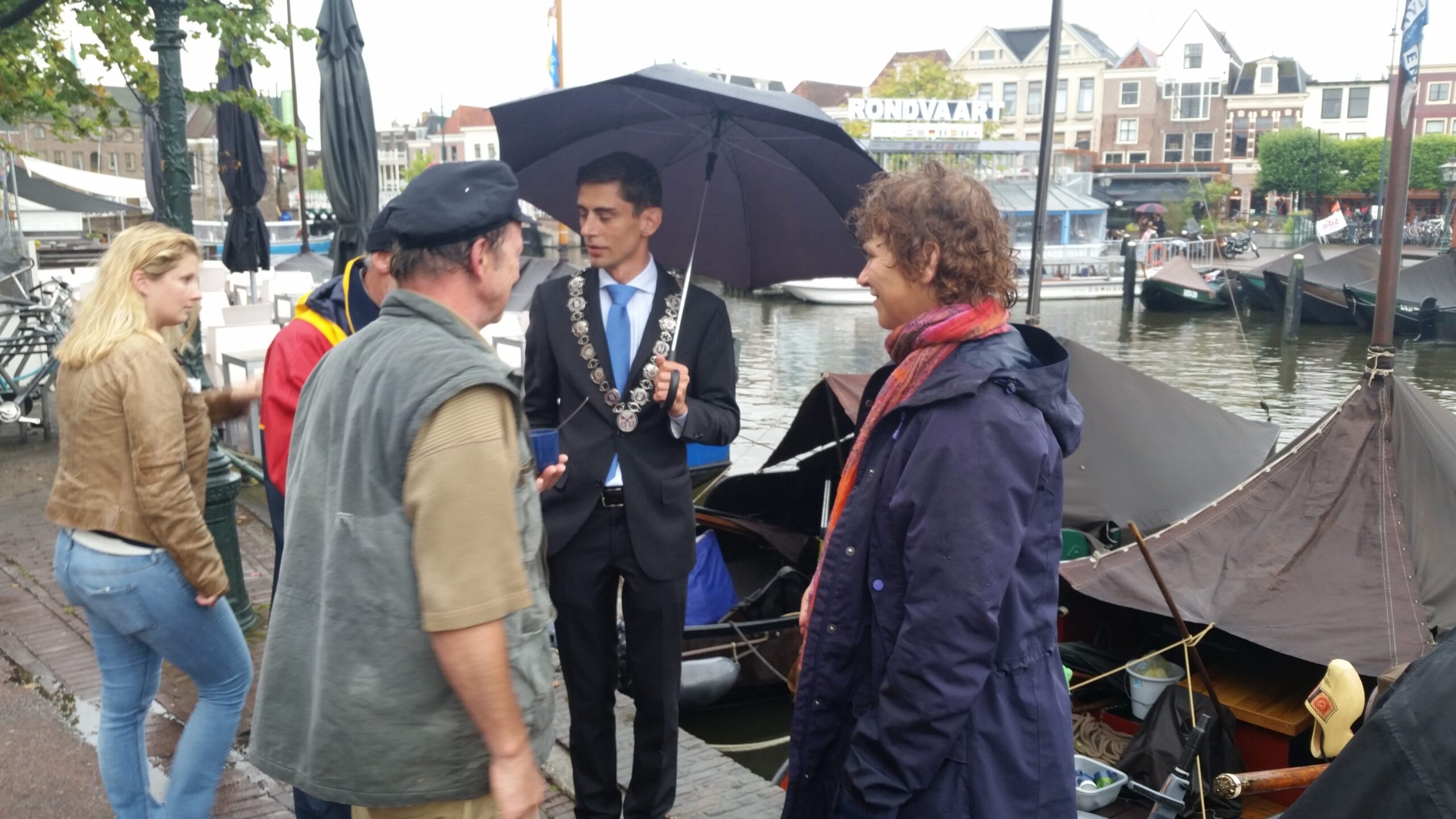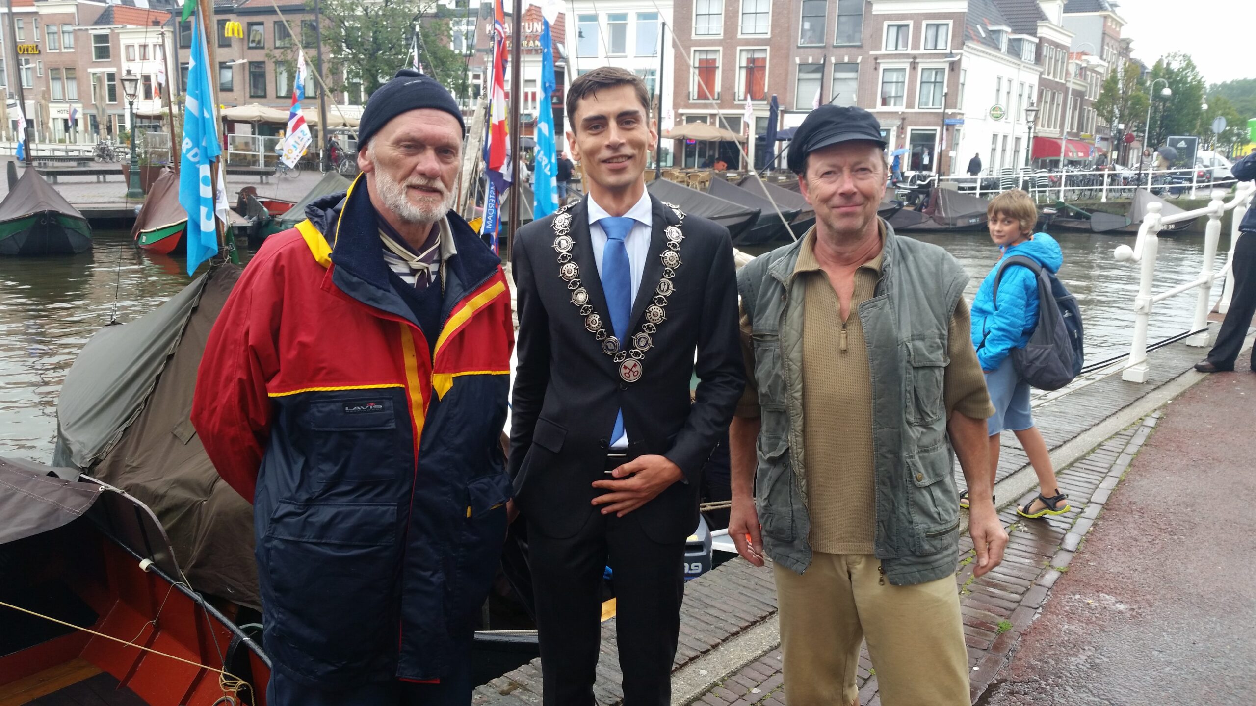 Gisteren kwamen dan toch met wat schipperen de ongeveer 60 historische bedrijfsvaartuigen de Sleutelstad binnenvaren. De schepen zijn onderweg naar Sail Amsterdam waar ze meedoen aan het grootste gratis toegankelijke nautische evenement van Europa. Door het ongeluk met de kranen in Alphen aan de Rijn moest de vloot wel omvaren om in Leiden te kunnen komen, maar dat hadden de schippers er graag voor over, zo vertelde voorzitter Conny Broeyer van de Historische Haven Leiden gisteren bij de officiële ontvangst die vanwege het weer werd verplaatst van Park de Put naar het onderkomen van scouting Franciscus Leiden in de Hazewindsteeg.