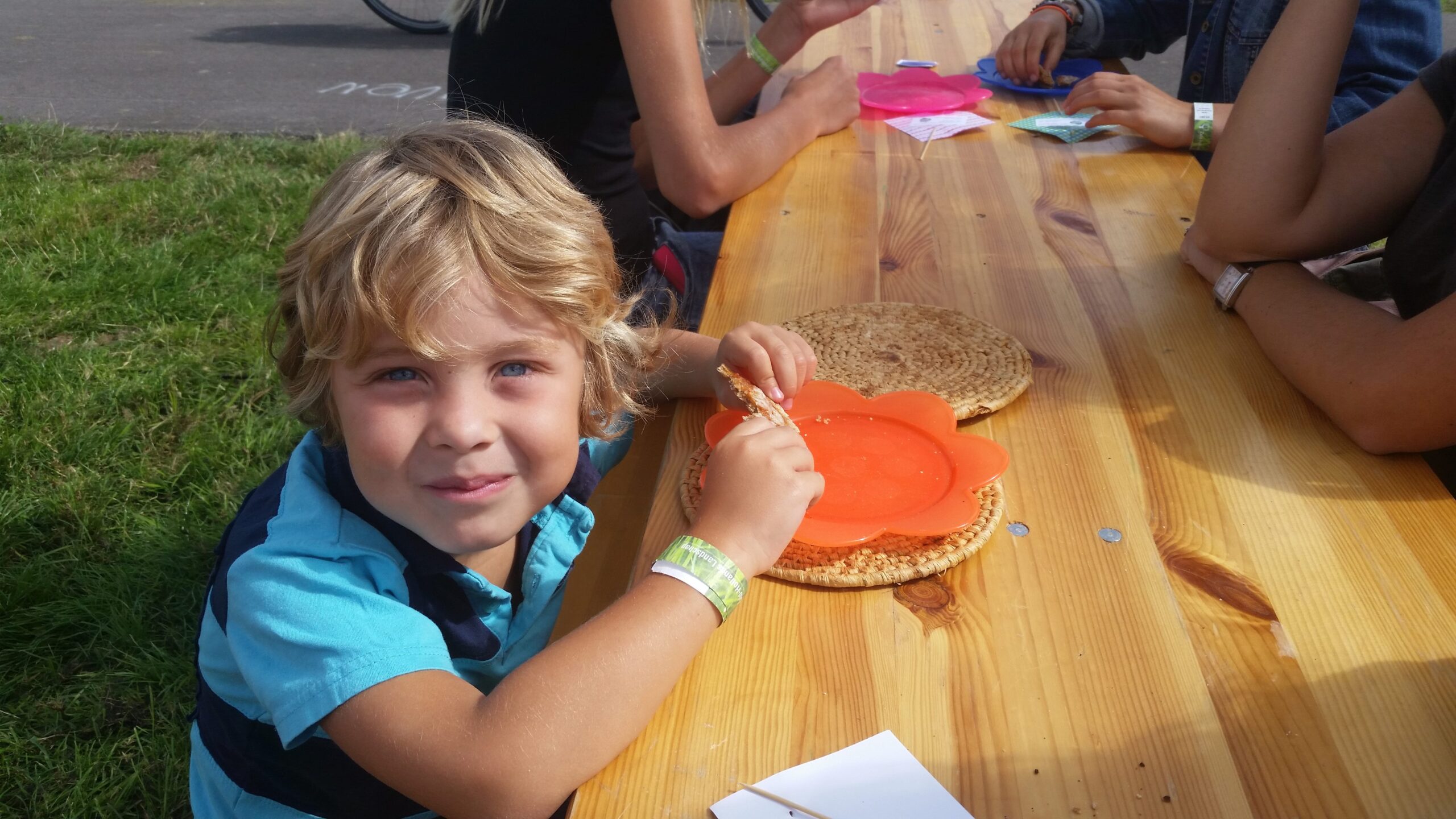 Voor de ouders was er een heus horecapaviljoen, compleet met live muziek. Onder andere van bijentroubadour KaZoem! (Foto: Daniëlle Reizevoort).