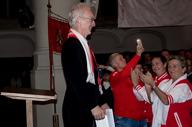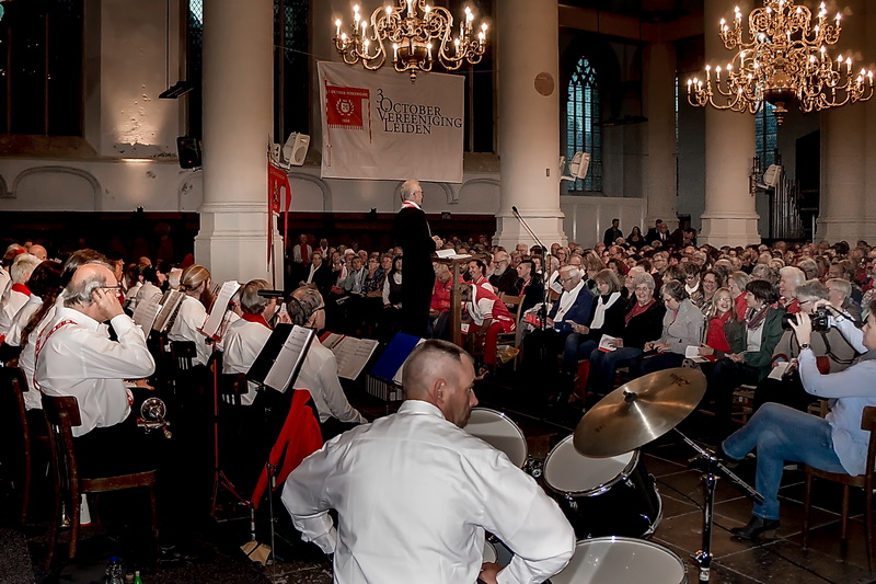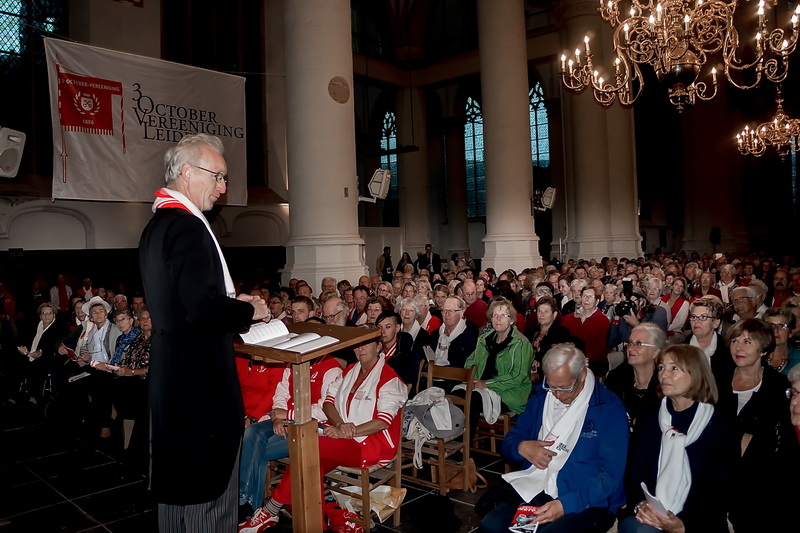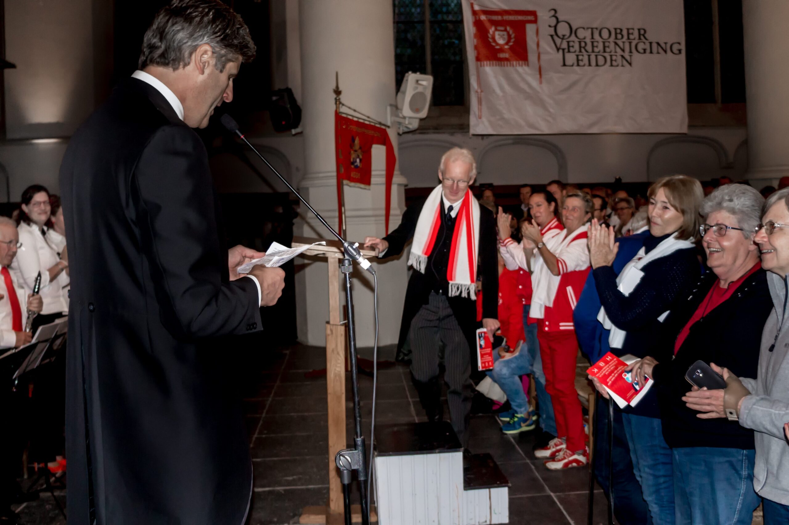 Zeker meer dan 1000 mensen kwamen gisteren onder leiding van de vermaarde Leidse dirigent Wim de Ru oefenen op de vaak ingewikkelde koraalliedjes die op 3 oktober, ’s ochtends om 8.00 uur, worden gezongen in het Van der Werfpark. Nooit eerder waren dat er zo veel. “Berlijn heeft Herbert von Karajan, Amsterdam heeft – gelukkig weer – Bernard Haitink, en Leiden heeft Wim de Ru,” zo opende bestuurslid Rik Kamps de avond: “We moeten oppassen dat we over een paar jaar niet met meer mensen oefenen dan dat er op 3 oktober in het park staan.”
