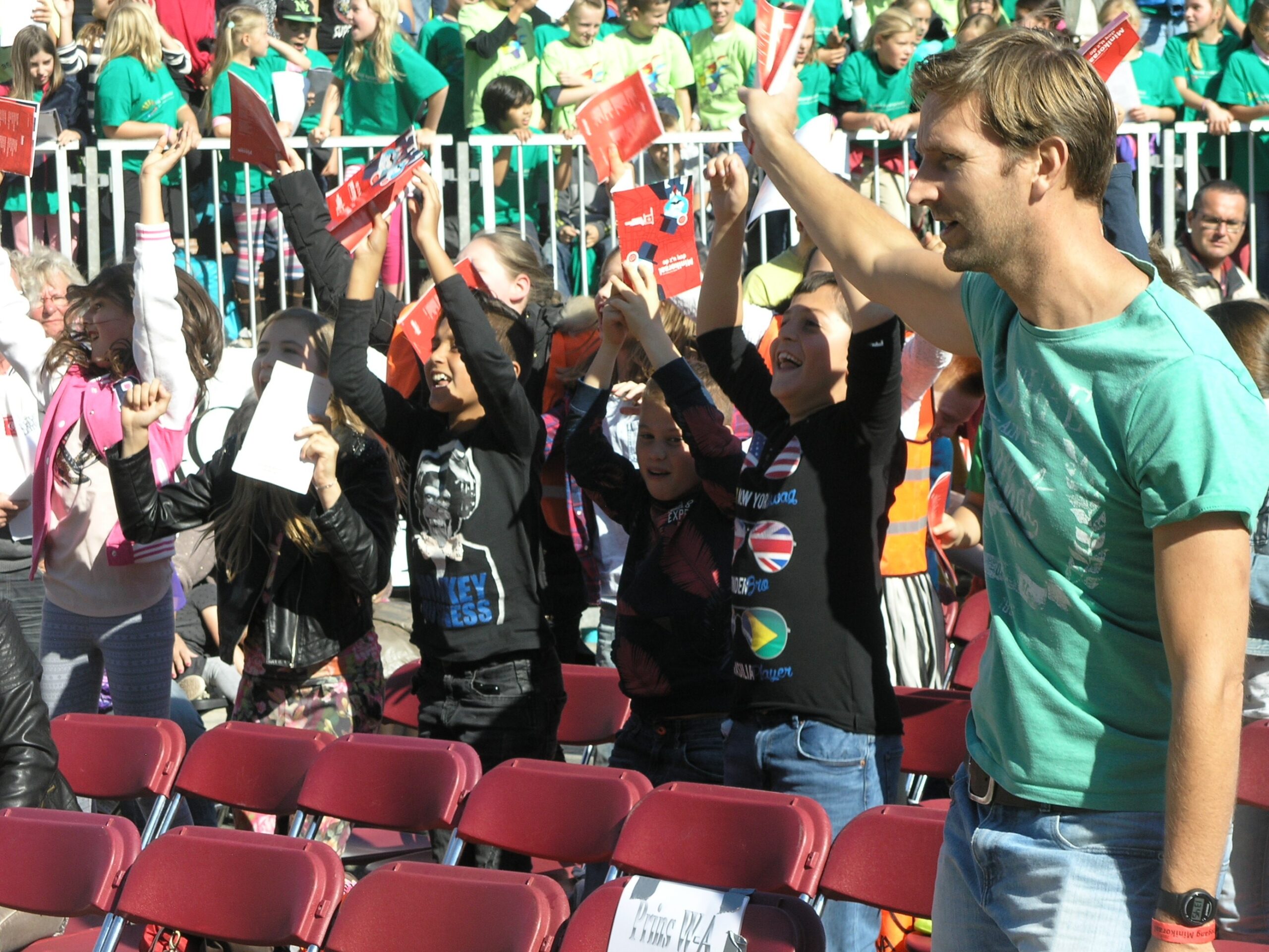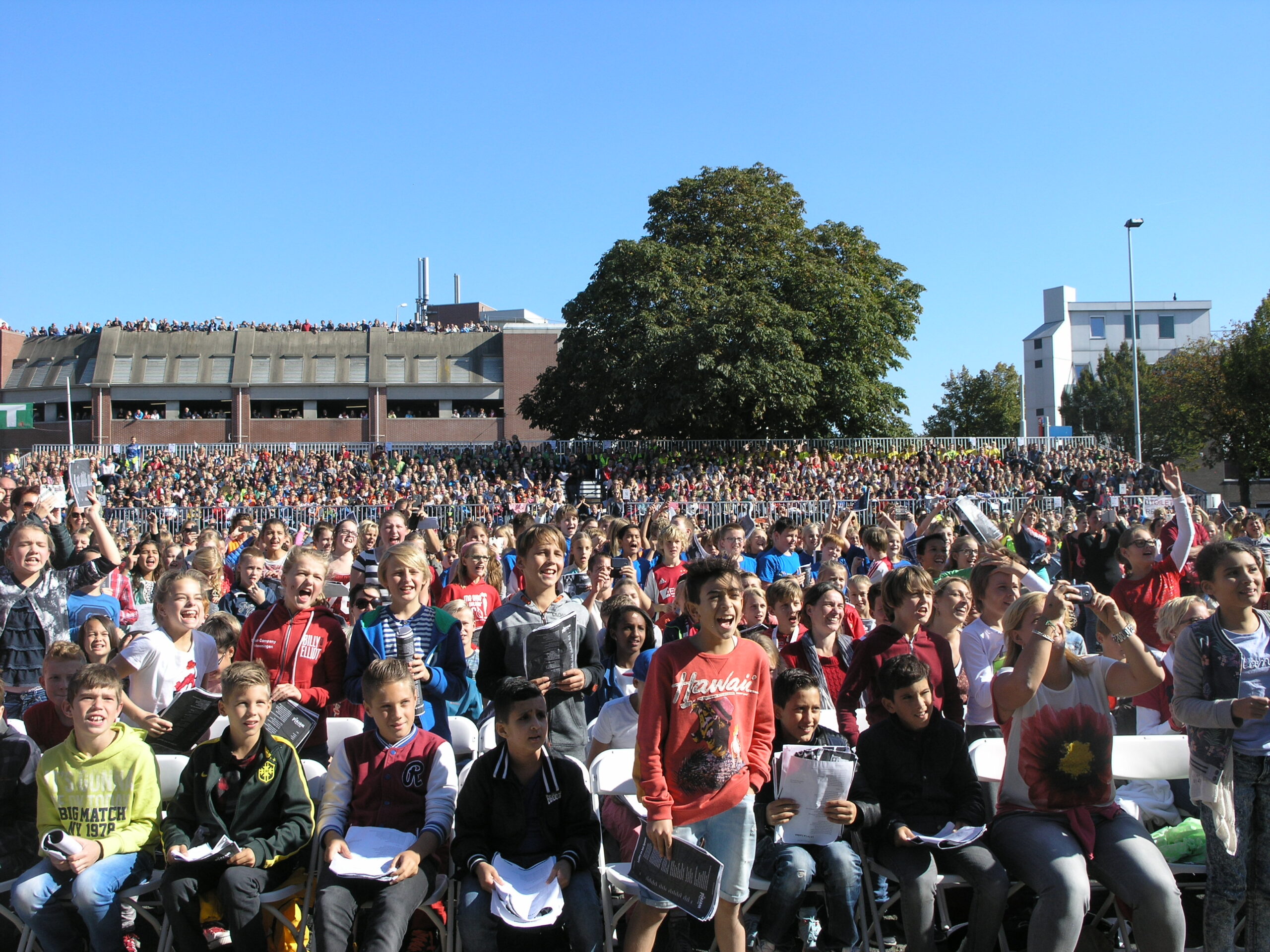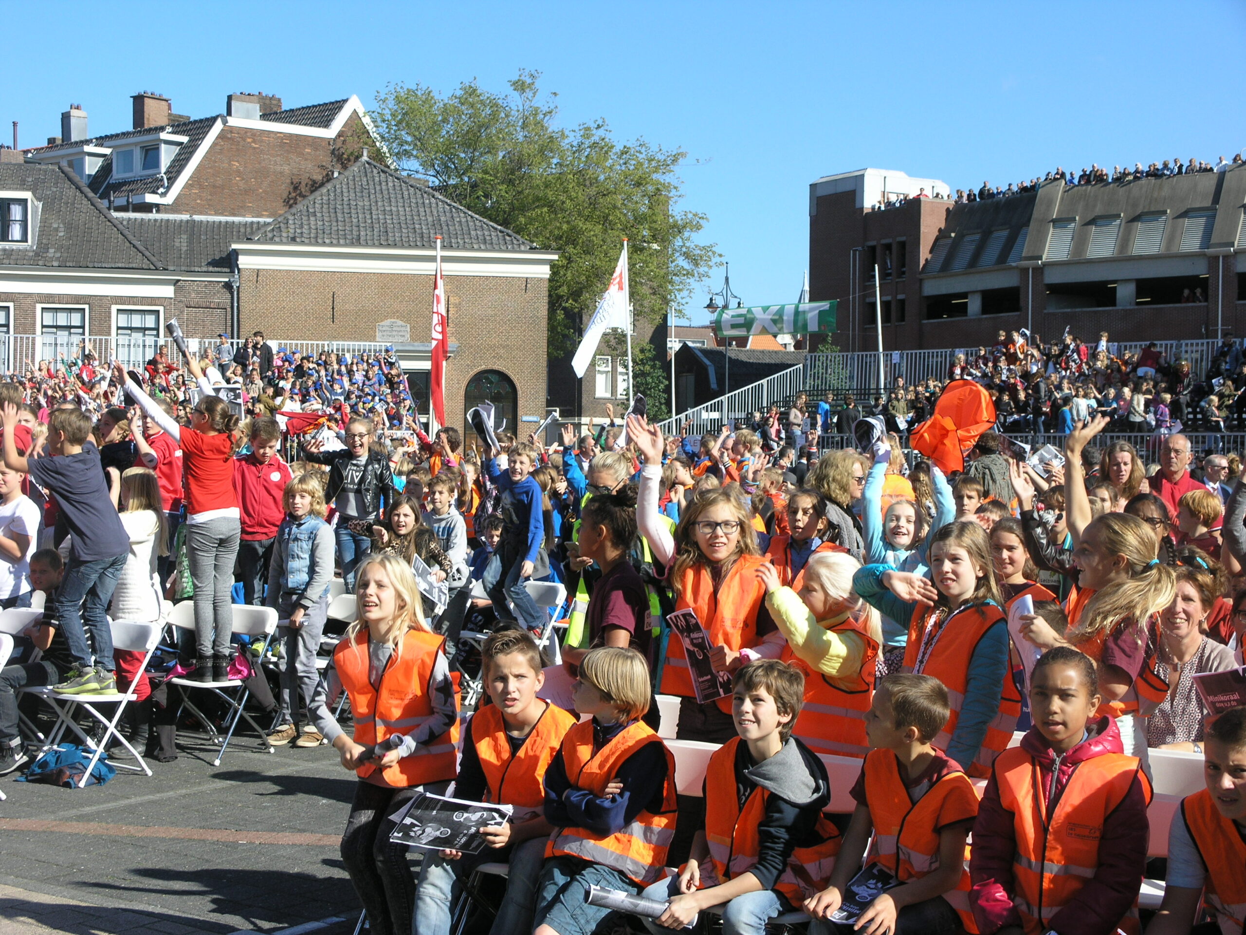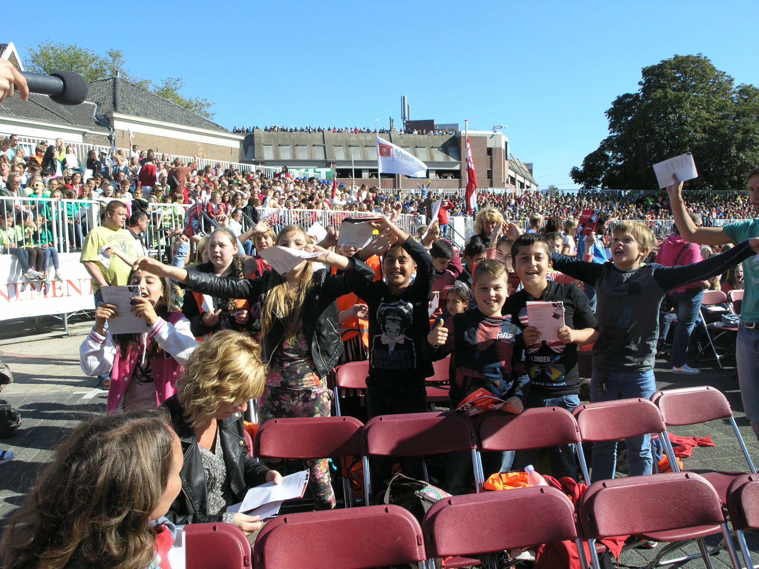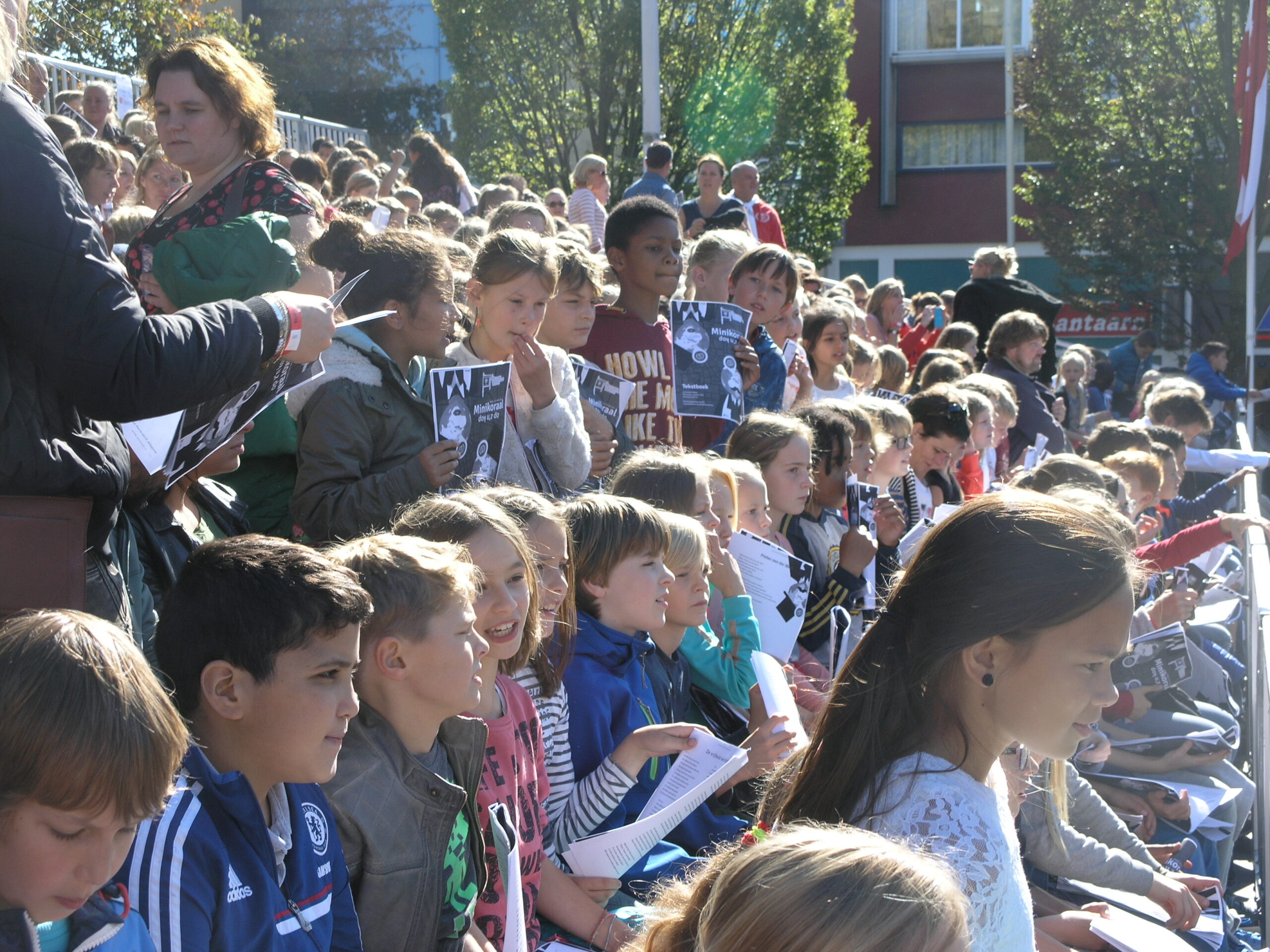 Het hoogtepunt van de dag kwam toen de Leidse cabaretier Jochem Myjer het podium op stormde. De leerlingen zongen oorverdovend hard mee met zijn lied ‘La La La Leiden’. De komiek heeft zich de afgelopen ontwikkeld tot een kinderidool. Dat komt mede door het kinderboek ‘De Gorgels’ wat hij onlangs uitbracht.