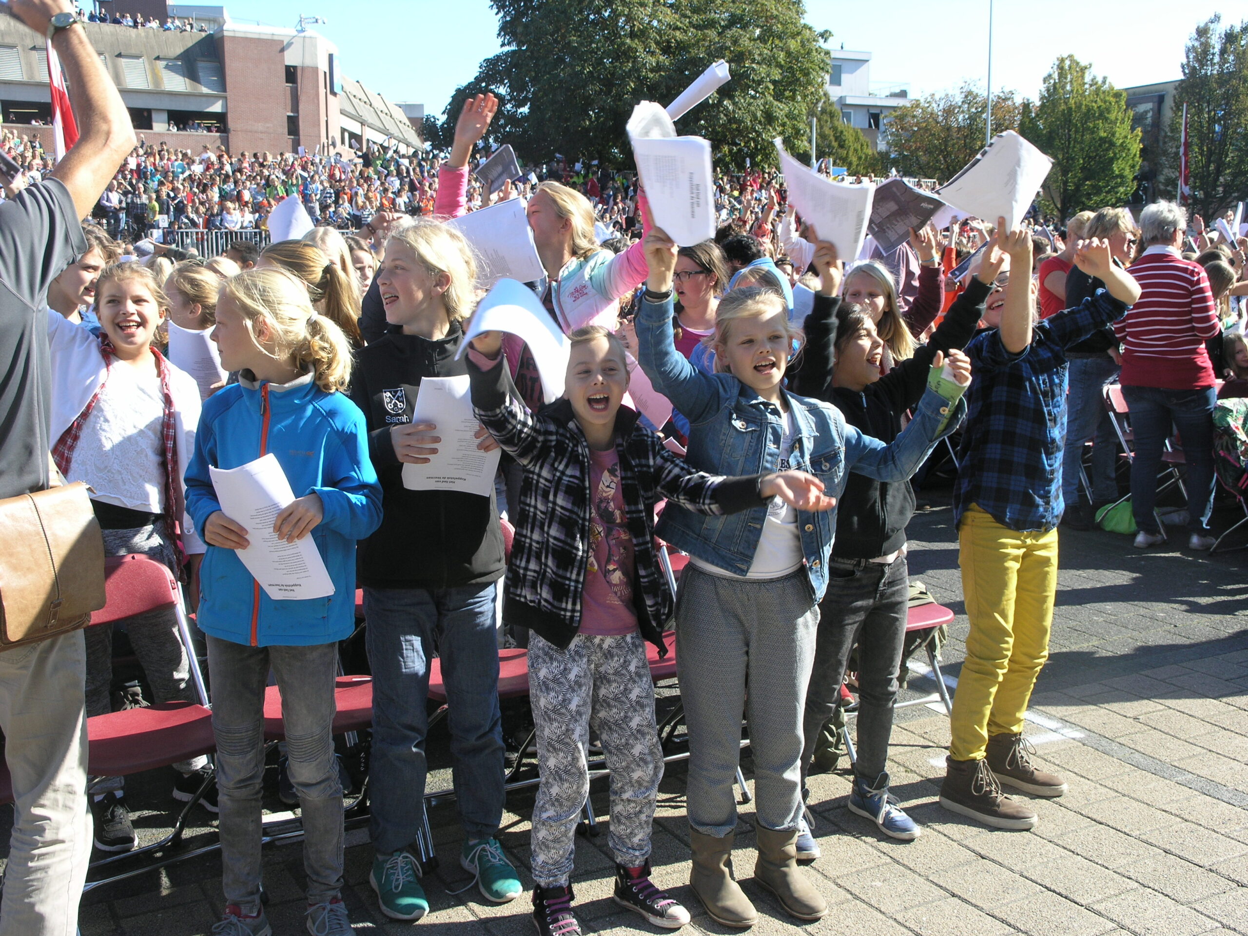 Op de Garenmarkt in Leiden vond vandaag het Minikoraal plaats, het traditionele kinderkoraal voor leerlingen van basisscholen in Leiden, Leiderdorp, Oegstgeest, Voorschoten en Zoeterwoude. Ruim 3500 kinderen zongen laaiend enthousiast mee, misschien nog wel het hardste met het gastoptreden van Jochem Myjer. “Het is fenomenaal om te zien hoe ontzettend blij al die kinderen zijn”, aldus burgemeester Henri Lenferink.