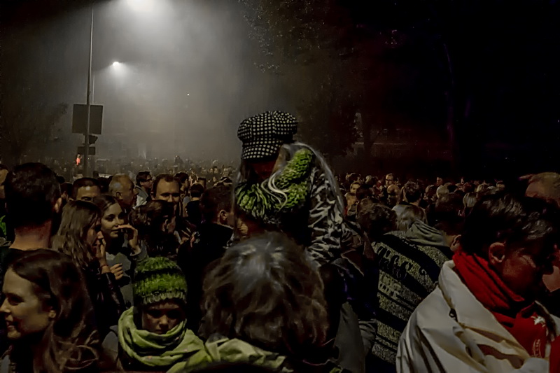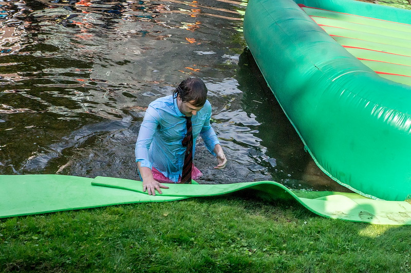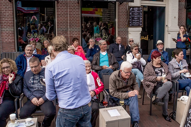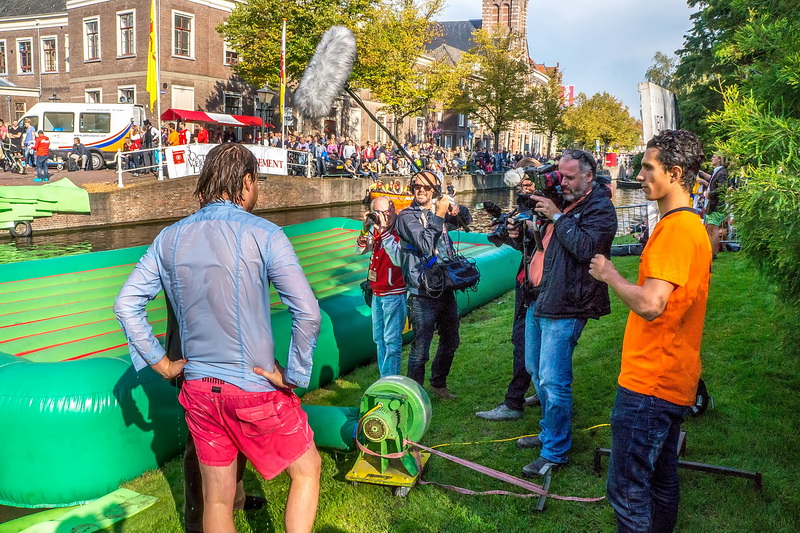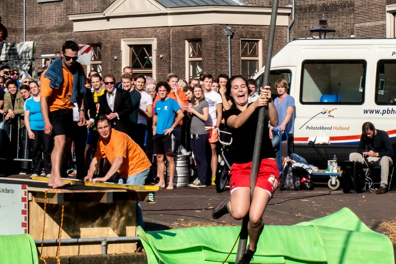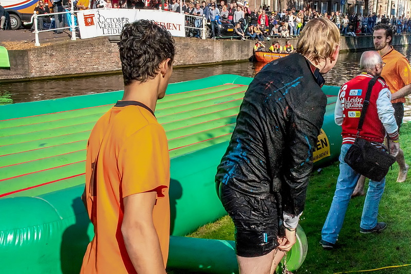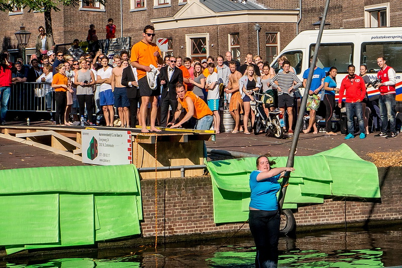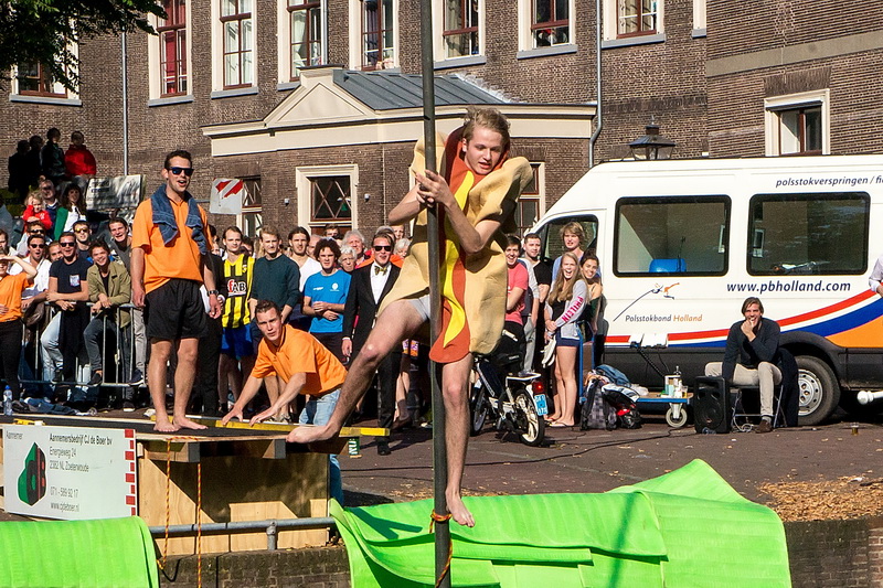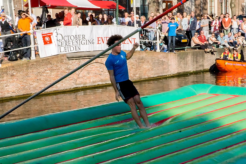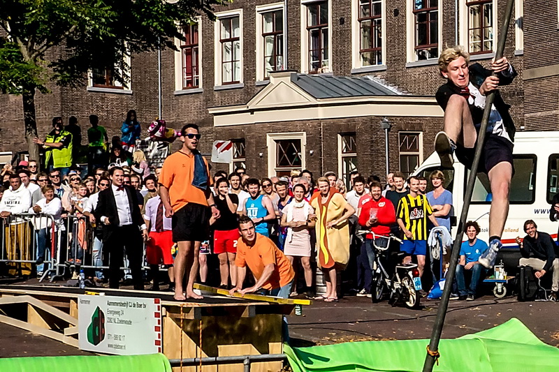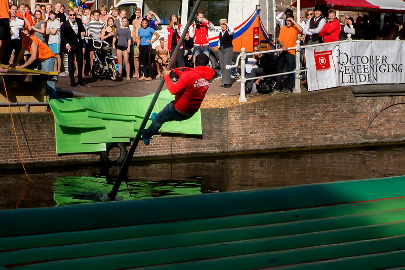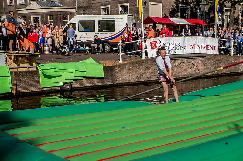 Verder zag hij hoe de bloem der natie in het water van de Steenschuur zakte omdat de meeste studenten theoretisch wel met de polsstok naar de overkant konden komen maar in praktijk niet. Natuurlijk is Leidens Ontzet niks zonder muziek en zonder de knallende afsluiting van het vuurwerk.