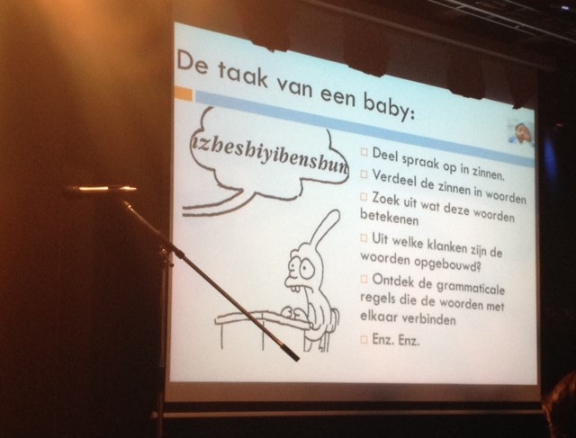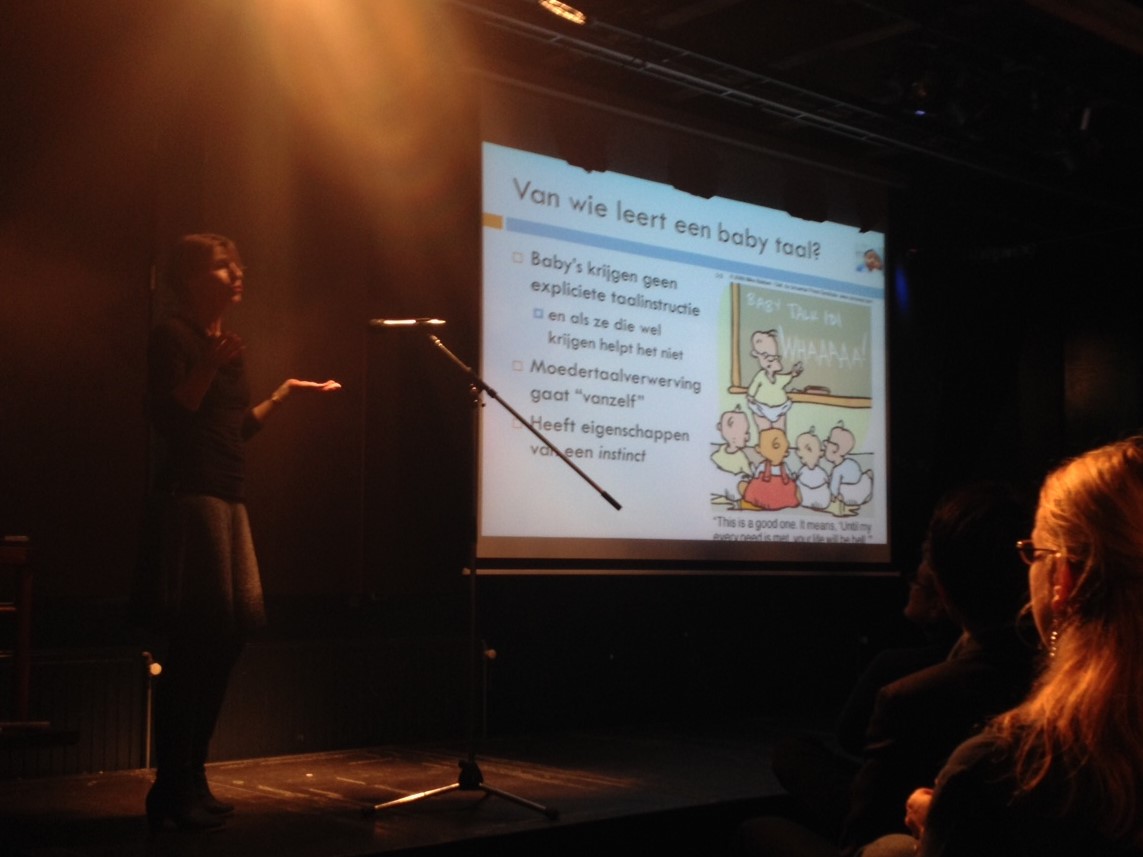 Het tweede uur van de avond was gereserveerd voor vragen uit het publiek. Een groot deel daarvan ging over tweetaligheid: hoe doen baby’s dat? Hoe onderscheiden ze talen? Er blijkt een website te bestaan over het onderwerp: Bilingual Matters. Ook de vragen hoe je baby’s stimuleert/helpt kwamen voorbij. Veel voorbeelden, veel praten bleek een belangrijke. Corrigeren helpt niet echt, maar verduidelijkend ‘hè?’ zeggen stimuleert weer wel. Dat daagt de baby/peuter uit beter na te denken en de fout te herstellen. Dat dat niet altijd een juiste uitspraak garandeert, bleek ook wel. Sommige woorden en klanken zijn té moeilijk en dan moet je, als baby, kiezen welke letter te niet uitspreekt.