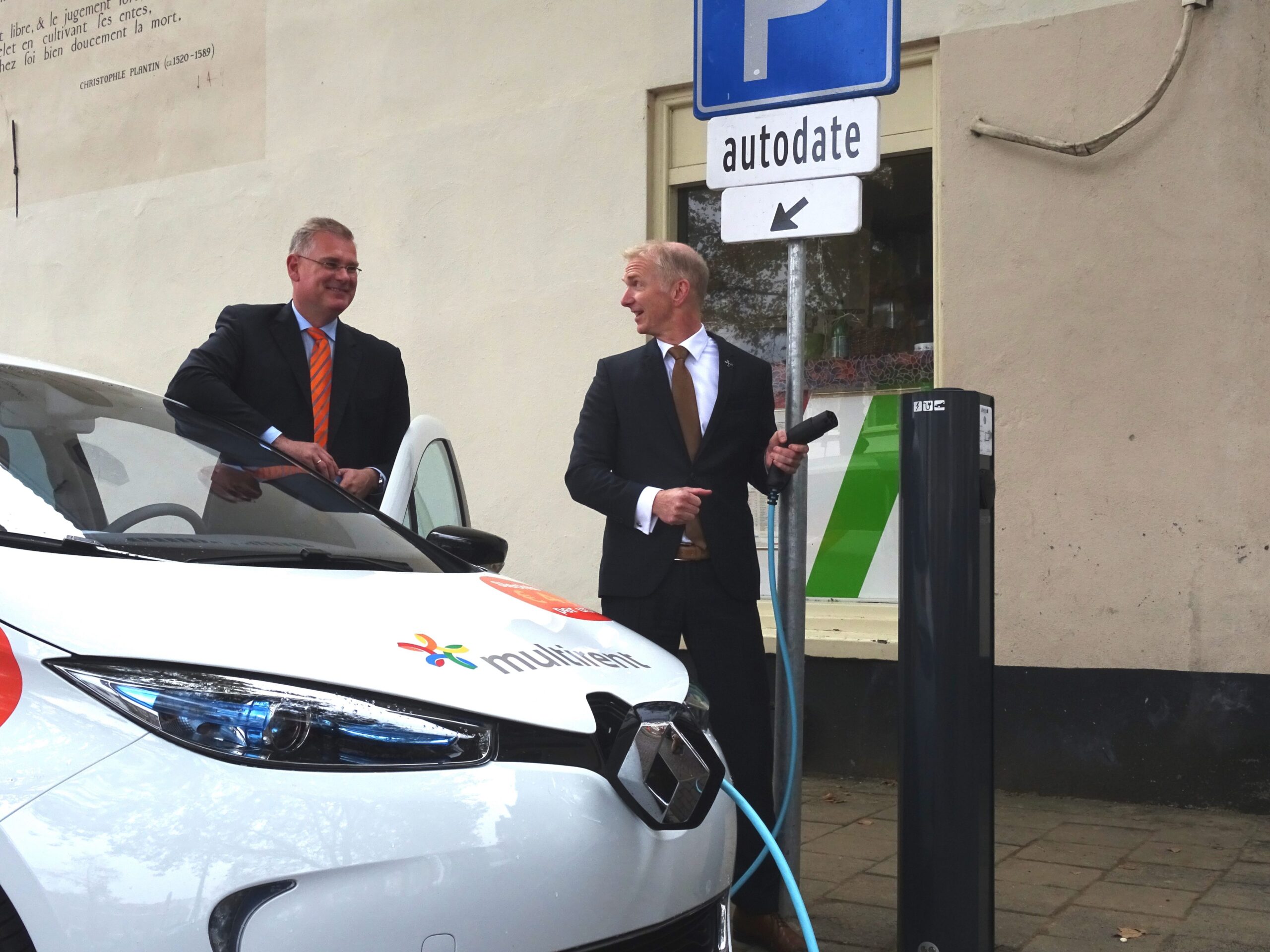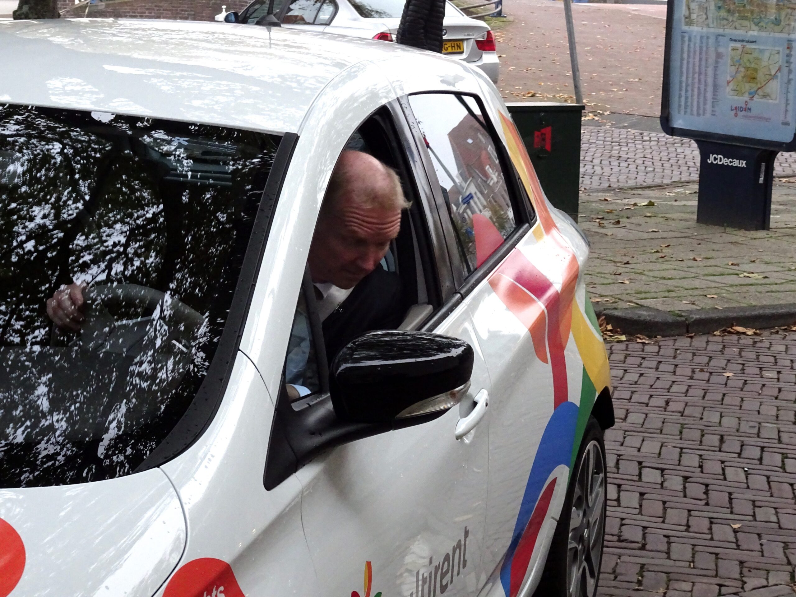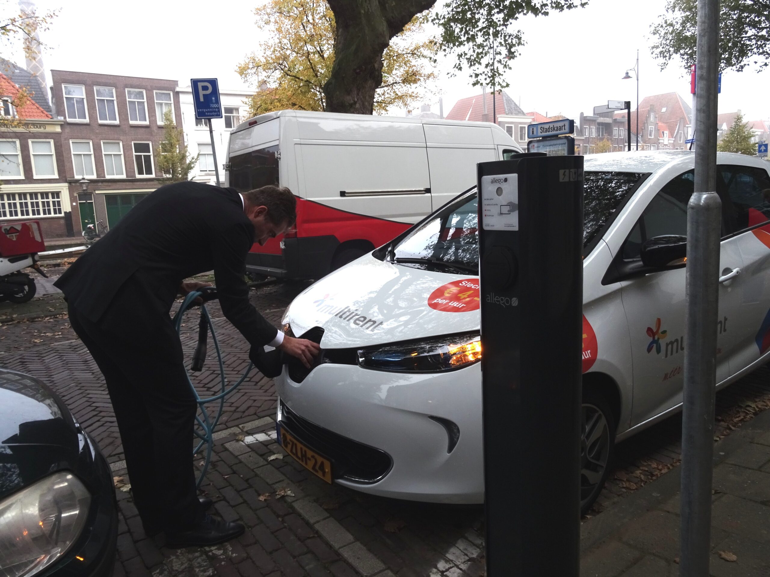 Leiden heeft vandaag drie elektrische deelauto’s met daarbij behorende oplaadpalen in gebruik genomen. Wethouder Robert Strijk mocht als eerste een ritje maken in de nieuwe auto aan de Kaasmarkt, waar één van de laadpalen ook staat. In totaal komen er vijf elektrische deelauto’s, die de gemeente in samenwerking met het bedrijf Multirent heeft gerealiseerd.