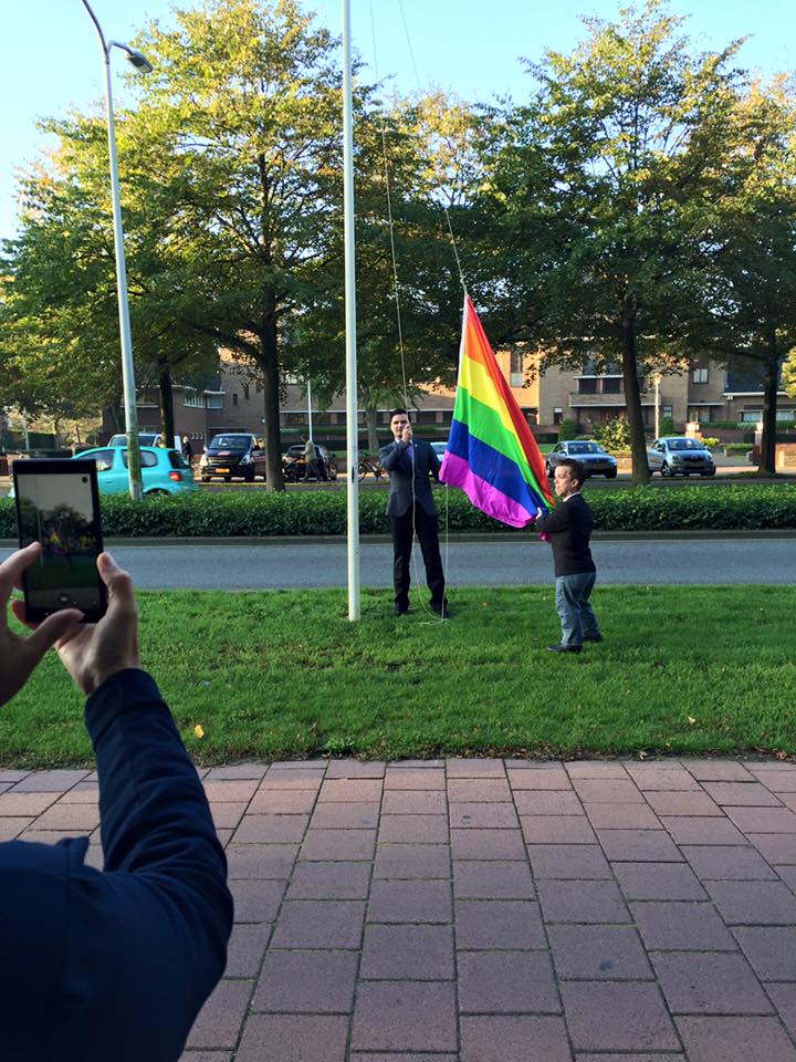 Ivo van Spronsen was blij met het hijsen van de vlag. Het wakkert discussies aan die nodig zijn voor het proces van accepteren. “Acceptatie komt pas nadat je het er over hebt gehad. Zoals de wethouder daarstraks zo mooi zei, voor sommigen mensen is het een klein gebaar maar voor andere mensen kan het een hele grote steun zijn”.