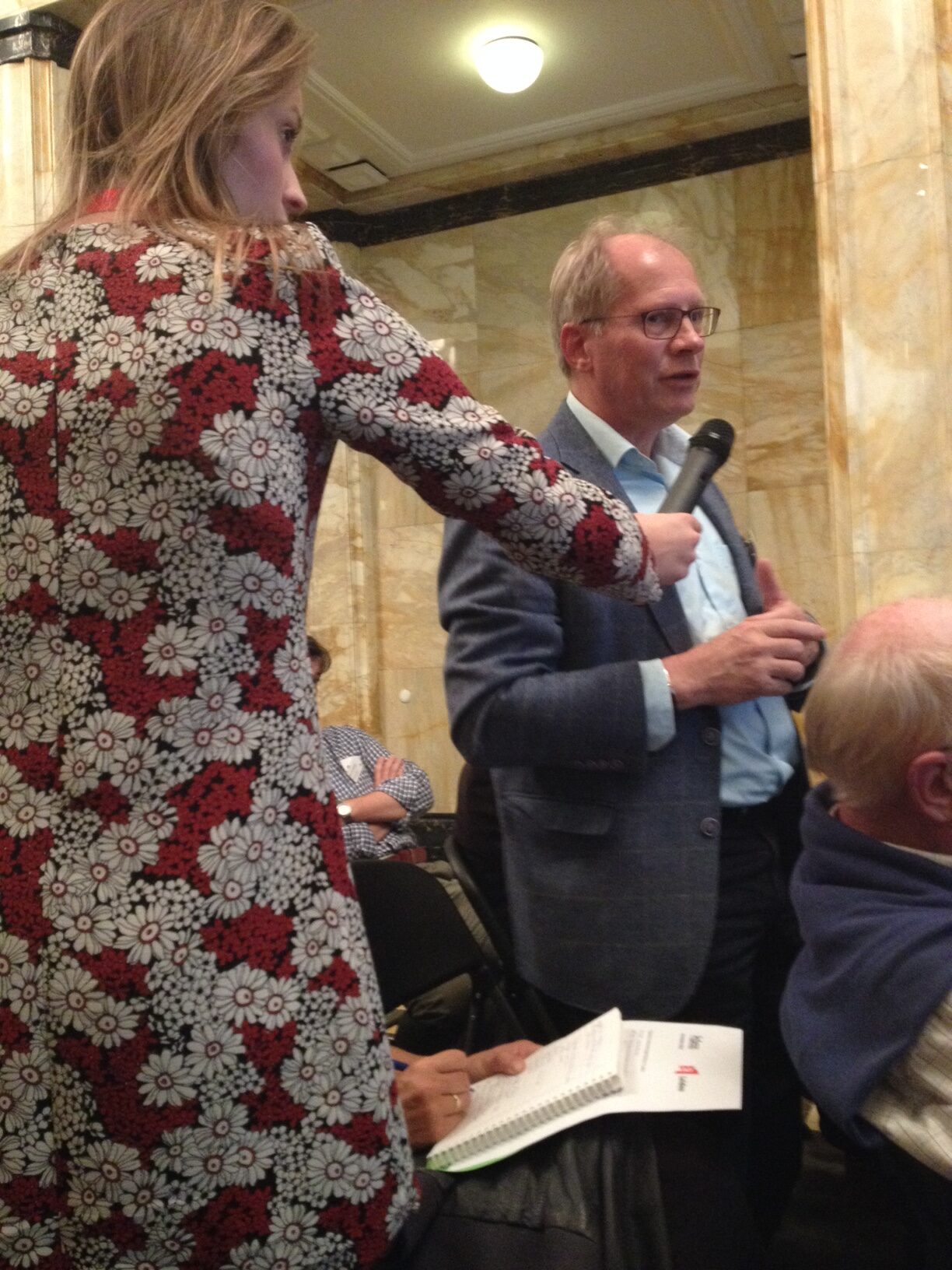 Mirjam Oude Vrielink (Universiteit Twente) doet al jaren onderzoek naar burgerinitiatieven. Schematisch, zo hield zij de raad voor, verschuiven we meer naar een participerende democratie en naar meer regie bij de burger. Zijn de grote Leidse projecten als Stadslab en Singelpark nog co-producties tussen overheid en organisatie, de komende generatie zal de overheid in een meer volgende rol plaatsen. Haar verhaal was, op verzoek, vooral gericht op de gevolgen voor raad en ambtelijk apparaat, maar de vragen uit de zaal gaven overduidelijk weer dat er behoefte bestaat aan het perspectief van de initiatiefnemer.