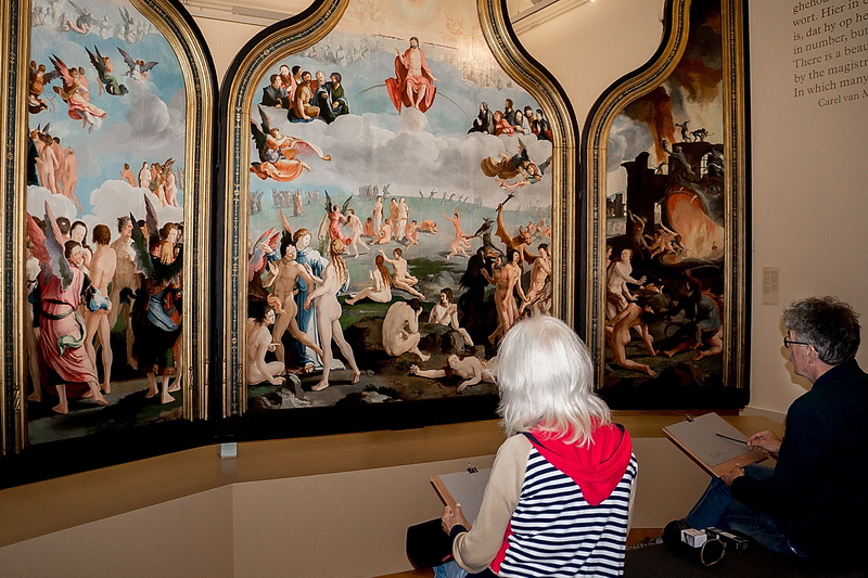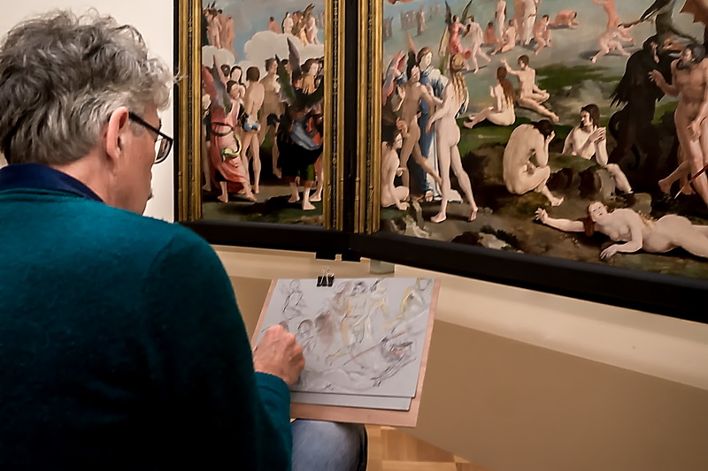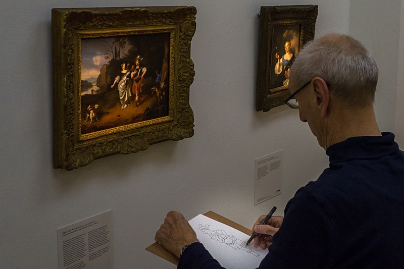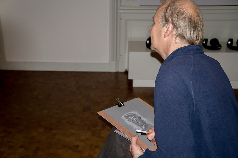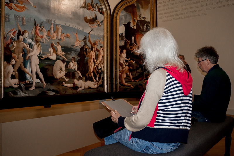 Uiteraard wordt er getekend. Sterker, in één van de zalen van het museum gebeurt dat op een heel klassieke manier. Er ligt een model en er staan een stuk of zes schildersezels. Iedereen die wil, kan aansluiten en gaan model tekenen. Dat gebeurt ook, want waar eerder nog vijf tekenaars bezig waren staan en zitten er een uur later ineens twaalf. Waar de een de totale figuur probeert te vangen met koolstofstrepen, concentreert een ander zich op het gezicht. Af en toe duiken toeschouwers op; De Lakenhal is gewoon open.