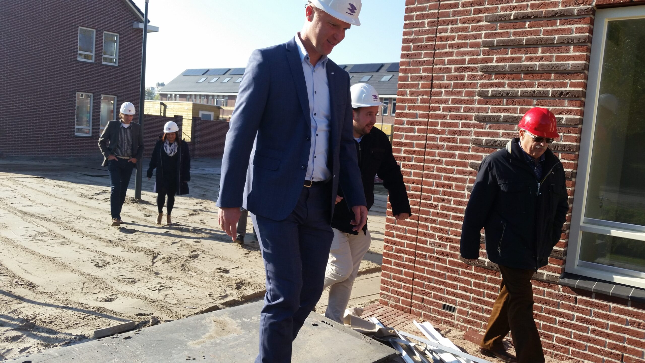 Chris de Waard luisterde en liep vanmorgen mee tijdens het werkbezoek aan het Churchillpark en sprak met architect Edward van Dongen van bouwer ERA Contour en met voorzitter Teun Bakelaar van woningbouwcorporatie Beter Wonen.