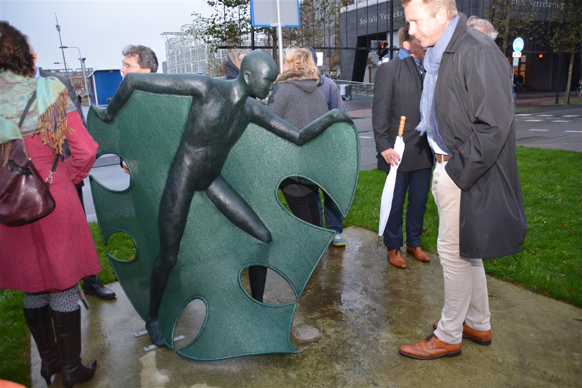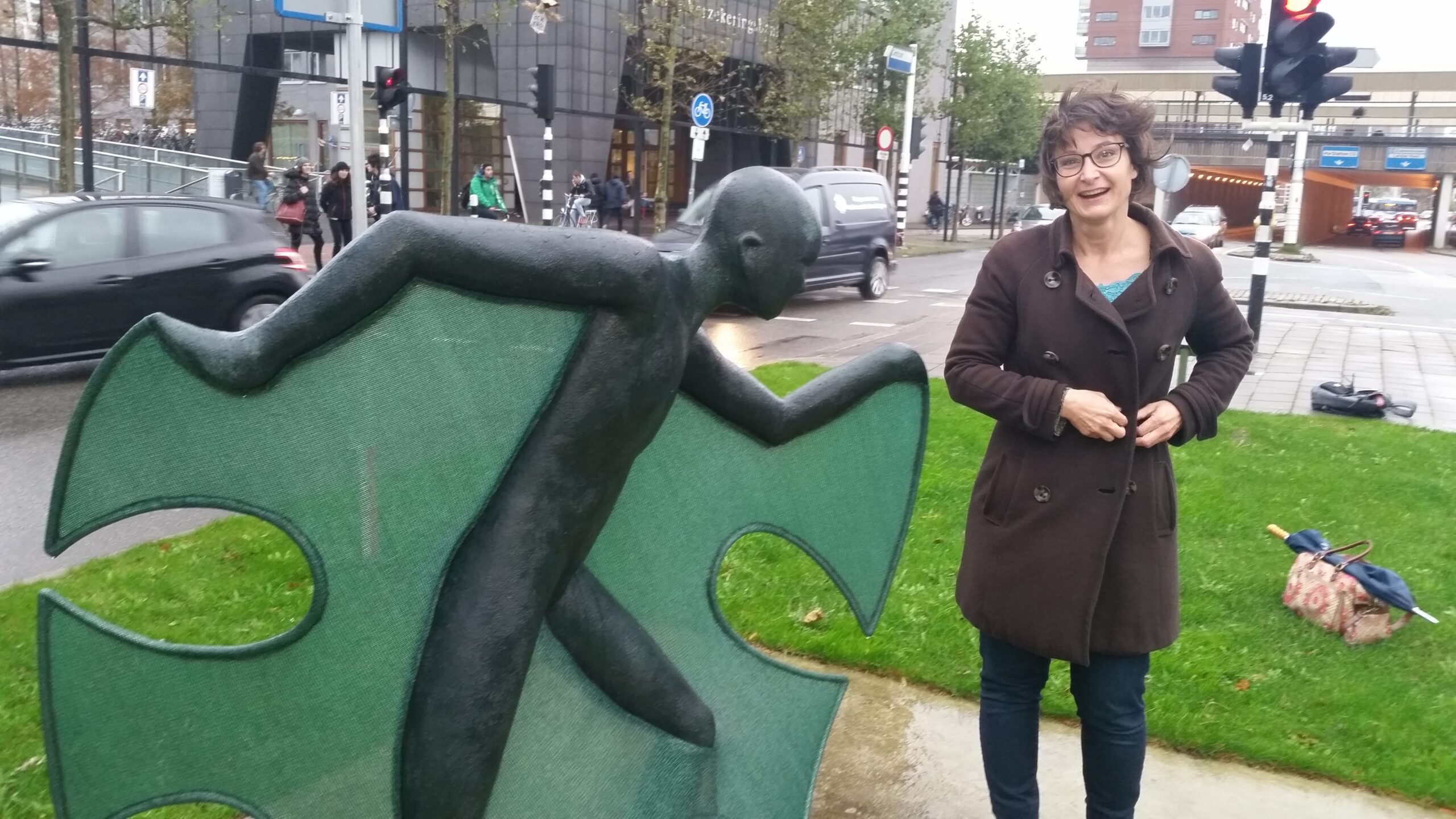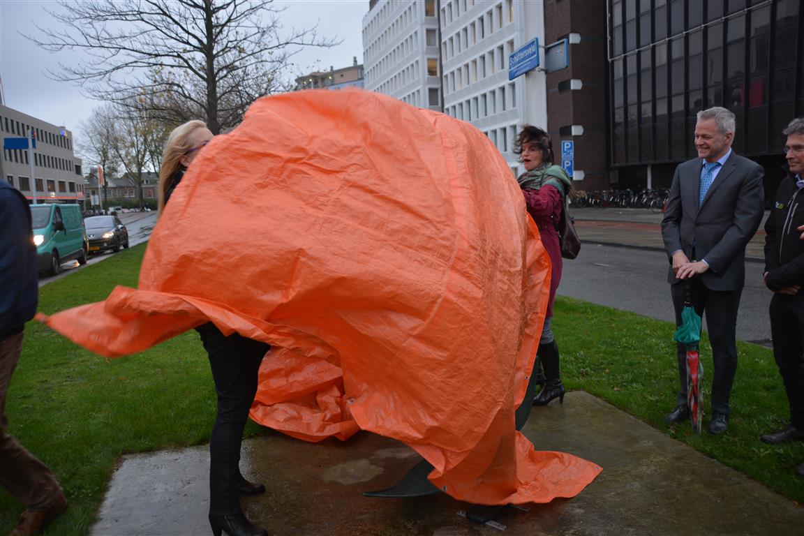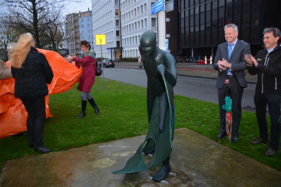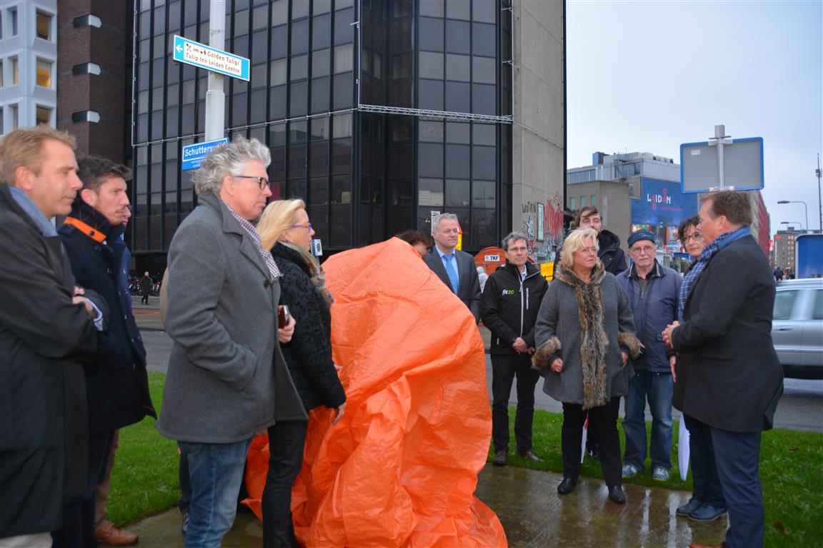 Chris de Waard ging naar de officiële onthulling van het beeld op het Schuttersveld en sprak met bestuurslid Arjen Pels Rijcken van Beelden in Leiden en met de kunstenaar Marit Zandbergen.