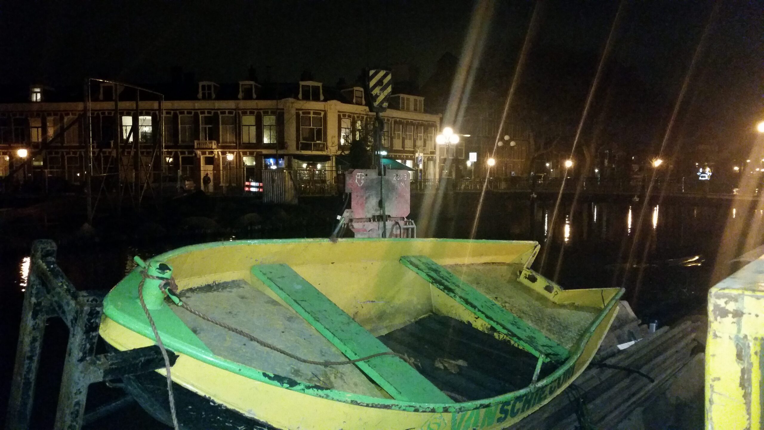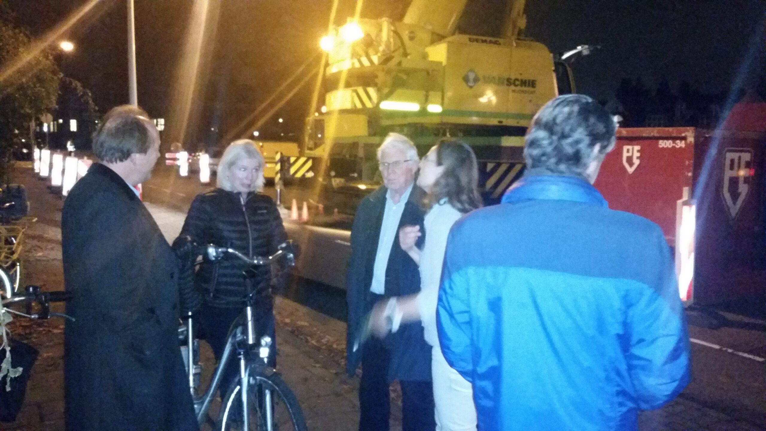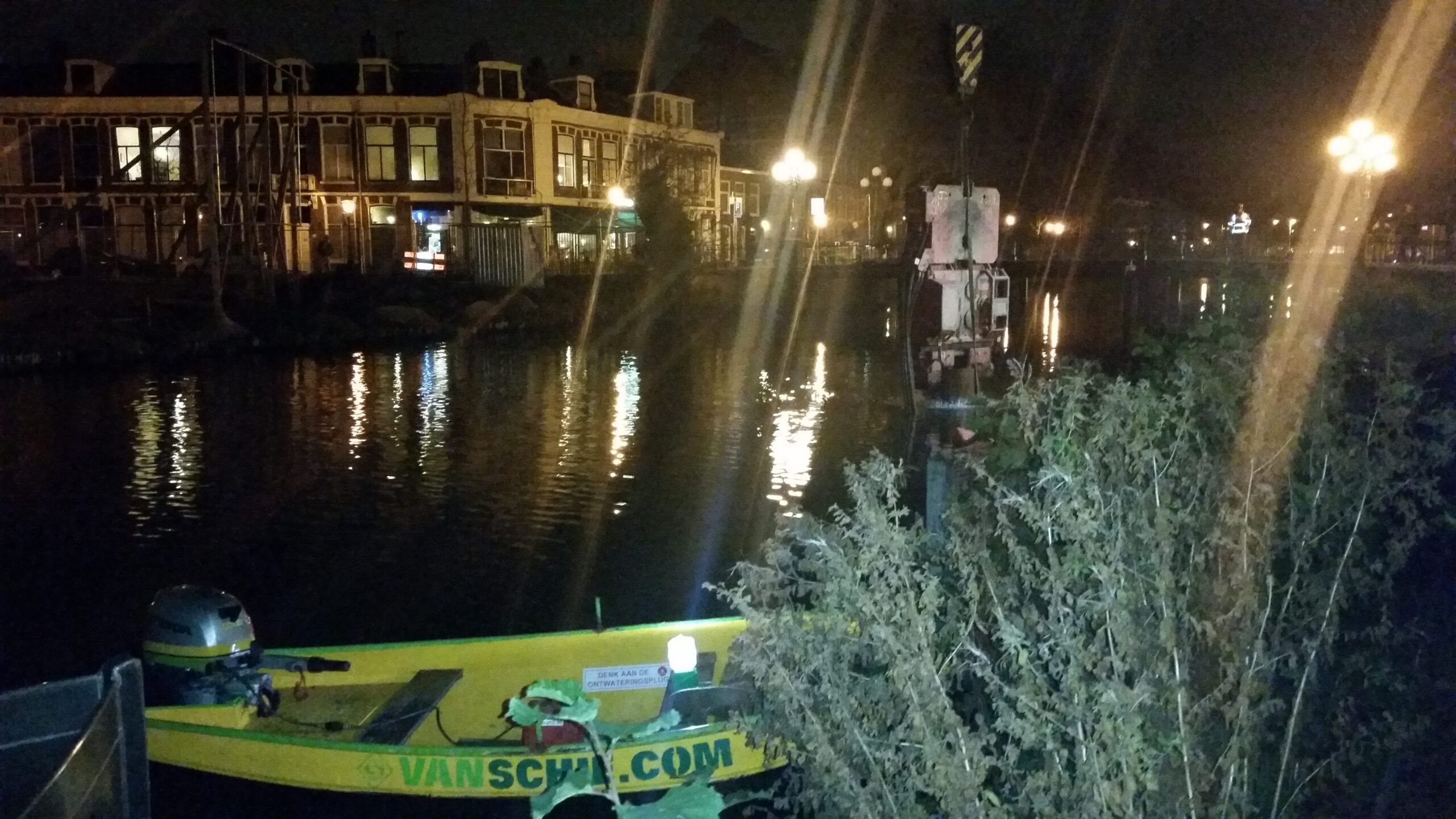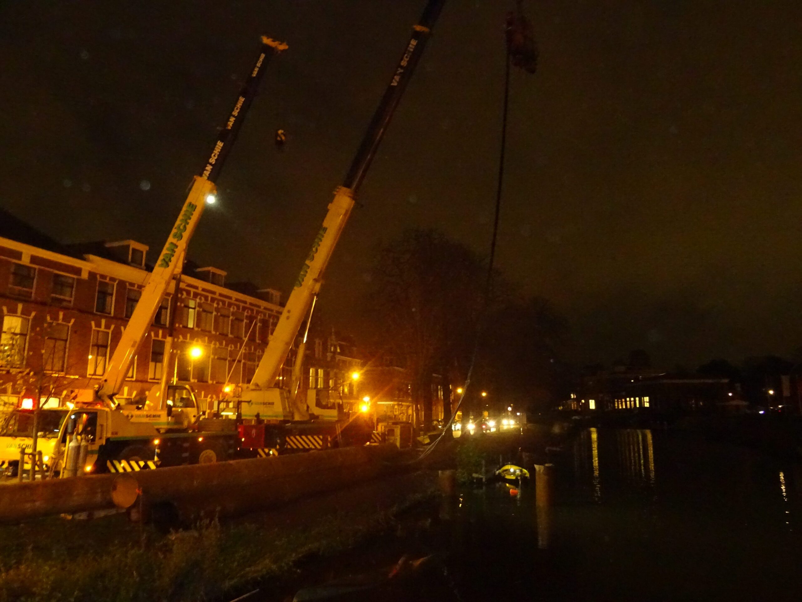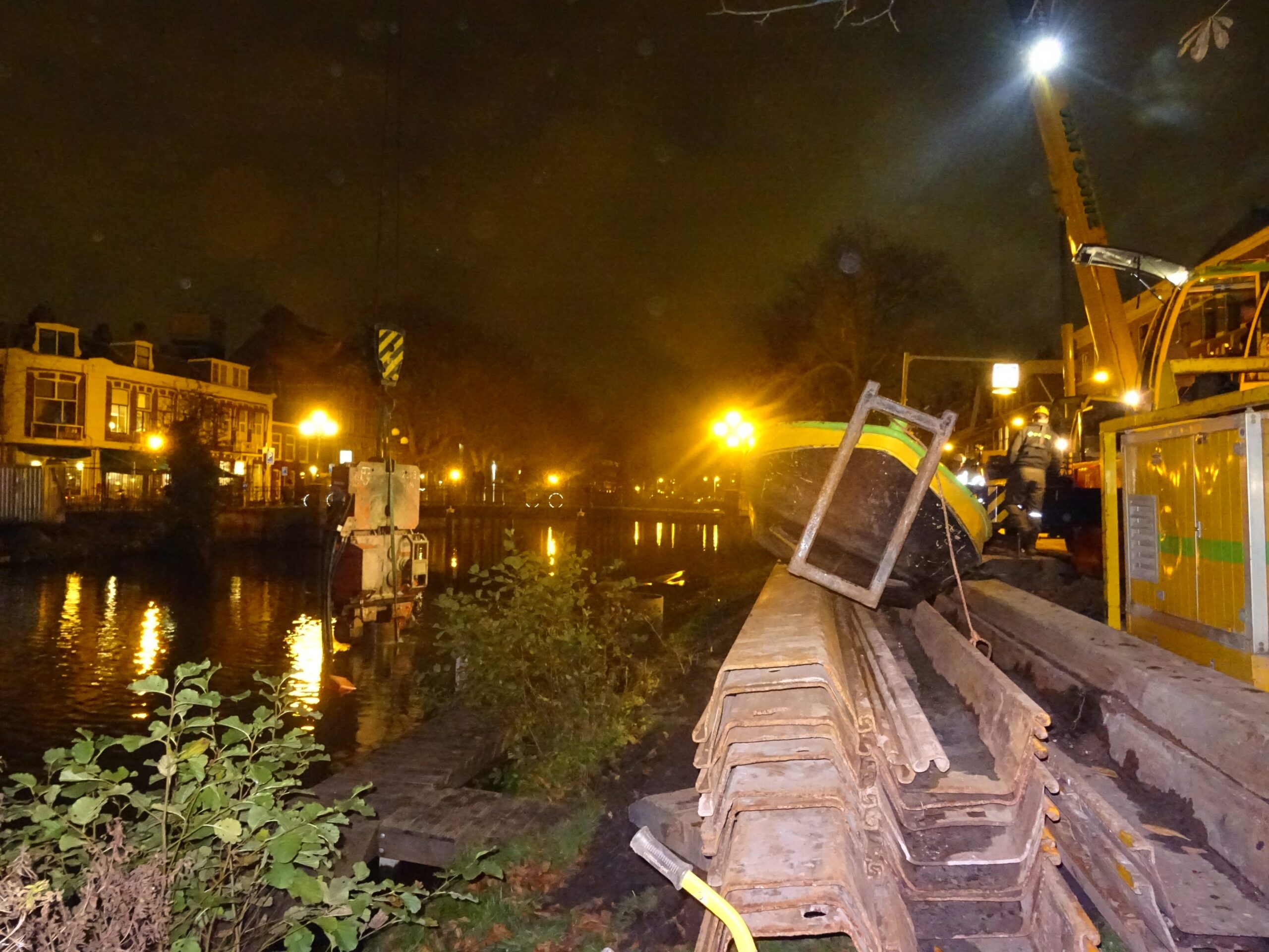 Gisteravond waren er twee buizen in de grond verdwenen. Vier liggen er nog klaar. Er bovenop komt een noodbrug voor het bouwverkeer dat daardoor niet via de Kaiserstraat hoeft te rijden. Een van de buizen rolde gisteren al spontaan het water in en kwam bovenop een stalen bootje en een kano terecht. Van het laatste vaartuigje is weinig over. Het drijft ingedeukt ondersteboven langs de kant.