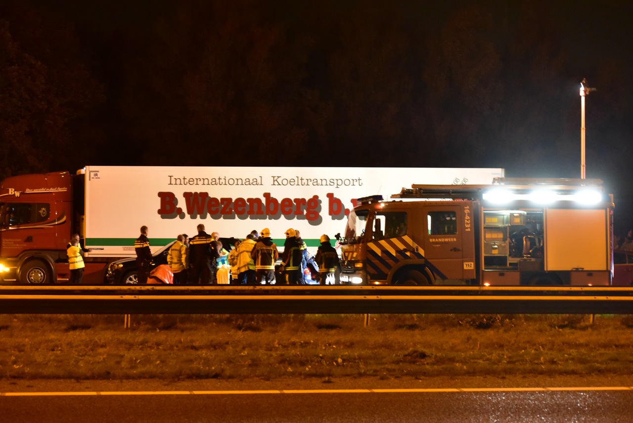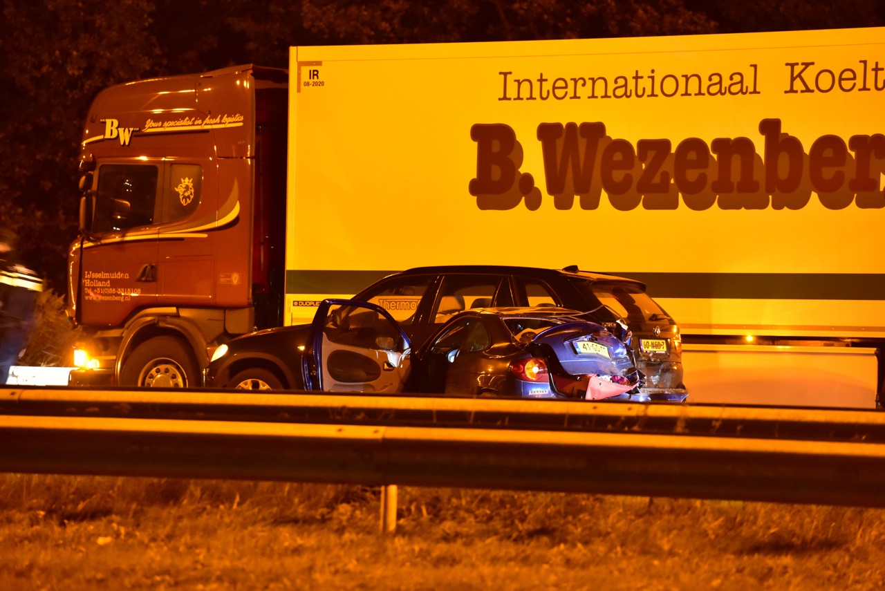 De botsing ontstond toen de vrachtwagen op een file inreed. De 44-jarige chauffeur, een man uit Lelystad, is aangehouden voor verhoor. De rijksweg werd richting Den Haag afgesloten voor het politie-onderzoek.