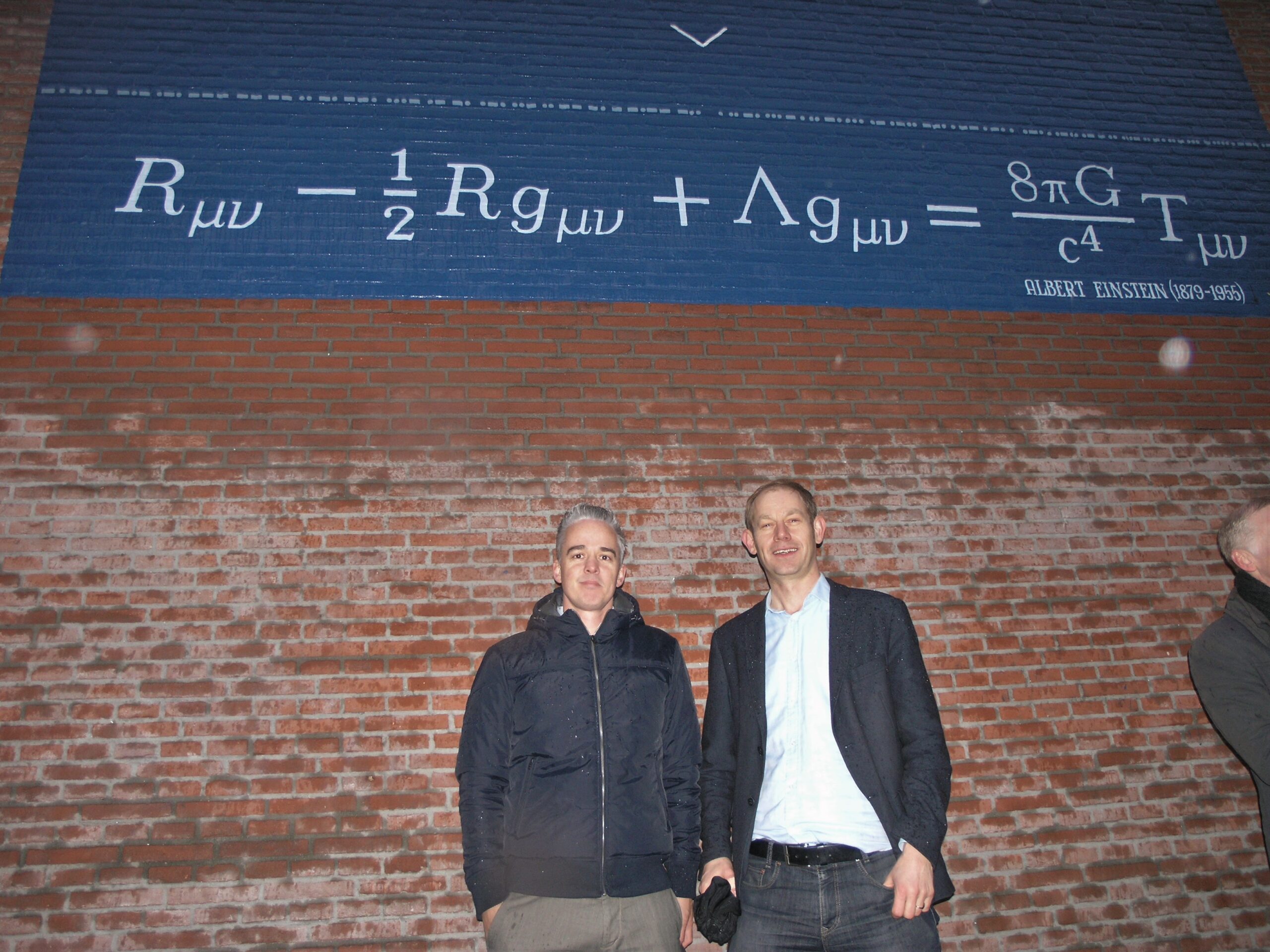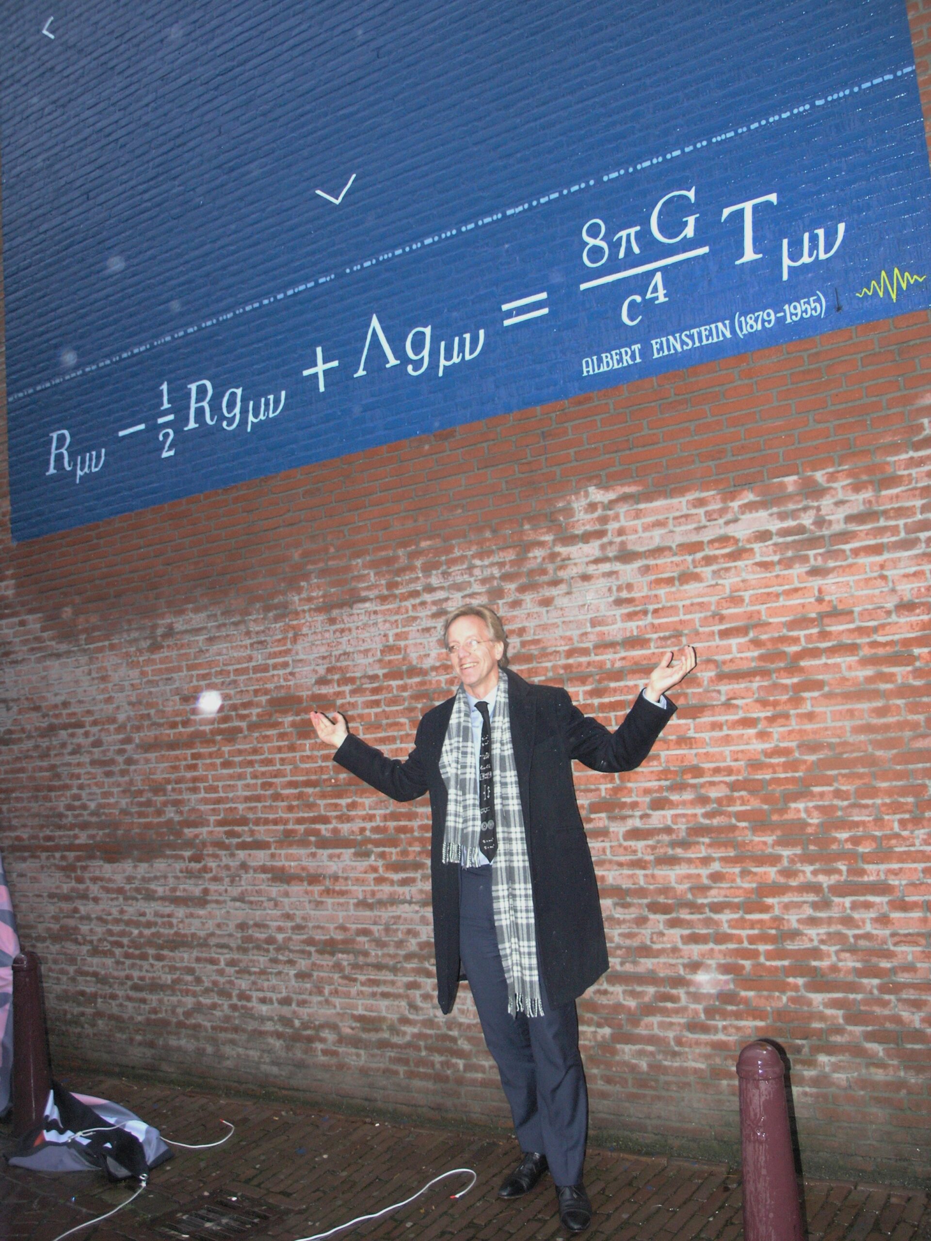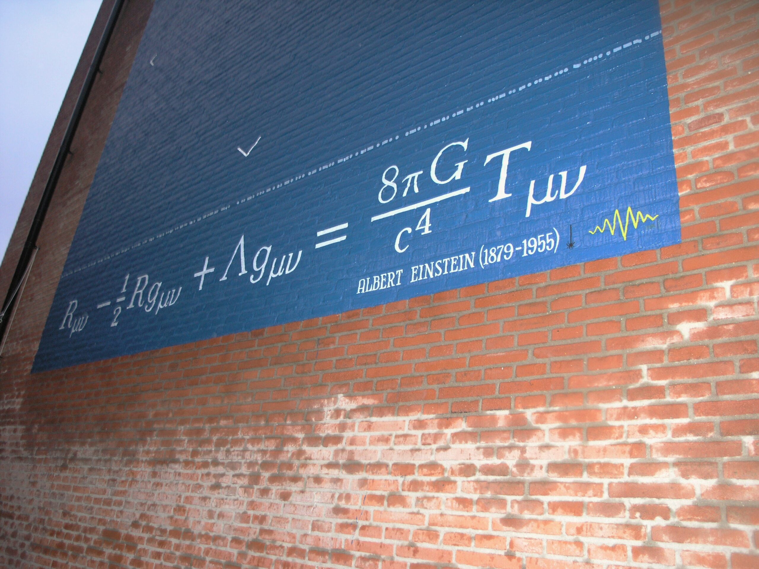 De muurschildering aan de muur van Museum Boerhaave is nog niet af. Boven de formule is nog een groot, leeg blauw vlak te zien. “Vanwege het slechte weer kon er niet verder geschilderd worden, in 2016 maken we hem af”, aldus Sense Jan van der Molen. Boven de formule komt namelijk nog een verbeelding van de theorie. “Je moet het zien als een zware steen die op een trampoline ligt. Leg je dan een knikker op die trampoline, zul je zien dat die naar de steen toe rolt”, begint Ivo van Vulpen uit te leggen. “Datzelfde principe geldt voor hoe de aarde de maan aantrekt en hoe de zon op haar beurt de aarde aantrekt. Dat willen we nog uitbeelden op deze muurschildering.”
